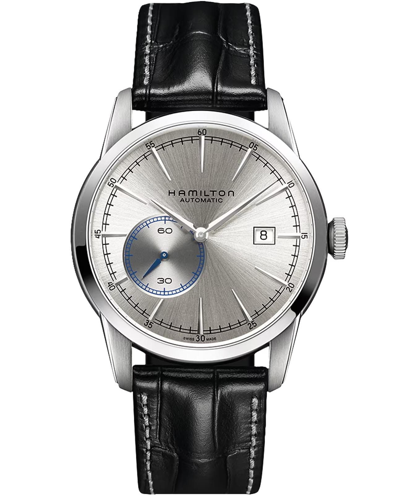 Мужские швейцарские часы с автоподзаводом Hamilton American Classic Railroad Small Second Auto H40515781. Сапфировое стеклоСапфировое стеклоПрочный и надёжный материал из кристалла сапфира синтетического происхождения, характеризующийся особой твёрдостью и устойчивостью к царапинам и повреждениям. устойчивое к мелким механическим повреждениям. Корпус часов изготовлен из нержавеющей стали. Кожаный ремешок с раскладной застёжкойРаскладная застёжкаТакой тип застёжки используется только на браслетах из металла. Она никогда не раскрывается полностью, происходит разделение на 2 и более частей. Раскладывающая застёжка снизит вероятность потери часов к минимуму.. Класс водозащиты: 50 метров, позволит защитить корпус от случайных брызг или капель дождя. Окошко даты находится в положении 3 часа.