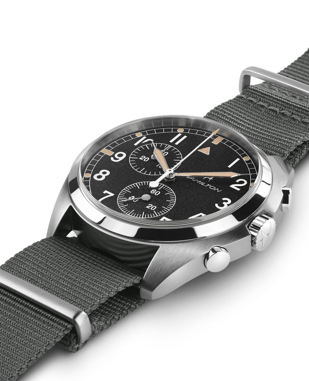 Мужские швейцарские часы-хронографХронографФункция позволяет измерять отрезки времени с особой точностью: часы, минуты, секунды. Верным признаком хронографа является наличие на циферблате 3 дополнительных окошек-счётчиков. с секундомеромСекундомерСекундоме́р — прибор, способный измерять интервалы времени с точностью до долей секунды. и надёжным кварцевым механизмом Hamilton Khaki Aviation Pilot Pioneer Chrono Quartz H76522931. Сапфировое стеклоСапфировое стеклоПрочный и надёжный материал из кристалла сапфира синтетического происхождения, характеризующийся особой твёрдостью и устойчивостью к царапинам и повреждениям. устойчивое к появлению царапин, обладающее высокой прозрачностью. Класс водозащиты: 100 метров, позволит плавать, нырять и заниматься другими водными видами спорта. Корпус часов изготовлен из стали. Тканевый ремешок на стандартной застёжке. Стрелки и метки с люминесцентным покрытиемЛюминесцентное покрытиеПозволяет считывать показания времени в темноте. Производители наносят на стрелки, часовые индексы, безель или поверхность циферблата светонакопительный состав, дающий холодное свечение..