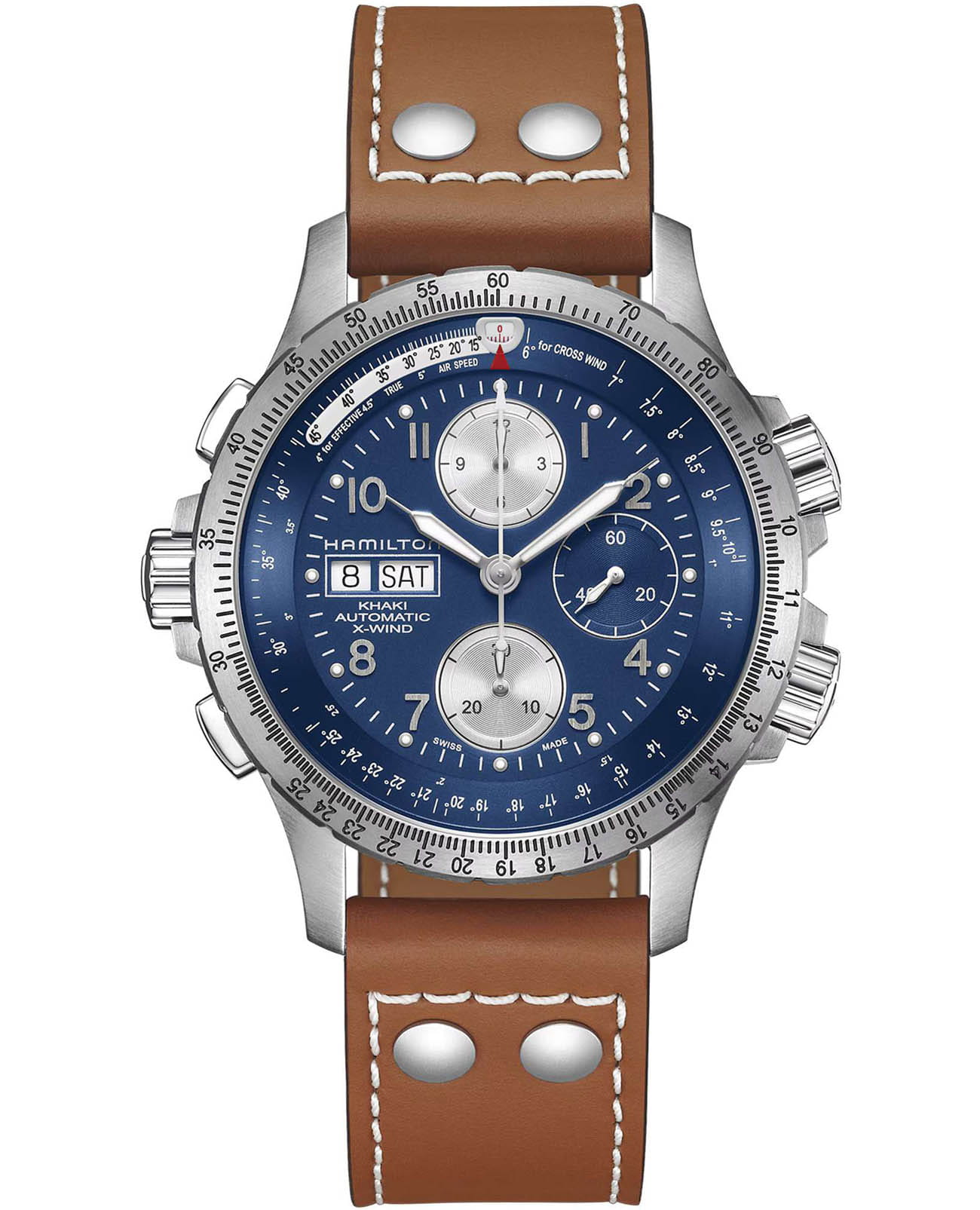 Мужские наручные часы Hamilton Khaki Aviation X-Wind Auto Chrono 44mm H77506540 сочетают в себе спортивный стиль и функциональность для профессионалов авиации. Модель обладает круглым корпусом диаметром 44 мм, изготовленным из нержавеющей стали, что обеспечивает высокую устойчивость к внешним воздействиям. Ремешок выполнен из кожи на стандартной застежке, гарантирующей комфортное ношение и безопасность. Синий циферблат оснащен крупными цифрами и стрелками с люминесцентным покрытиемЛюминесцентное покрытиеПозволяет считывать показания времени в темноте. Производители наносят на стрелки, часовые индексы, безель или поверхность циферблата светонакопительный состав, дающий холодное свечение. Super-LumiNova®, обеспечивающим превосходную видимость в темноте. Для защиты используется сапфировое стеклоСапфировое стеклоПрочный и надёжный материал из кристалла сапфира синтетического происхождения, характеризующийся особой твёрдостью и устойчивостью к царапинам и повреждениям., которое эффективно противостоит царапинам. Часы работают на автоматическом швейцарском механизме H-21, что обеспечивает точное время без необходимости подзаводки. Модель также оснащена функциями даты и дня недели, хронографаХронографФункция позволяет измерять отрезки времени с особой точностью: часы, минуты, секунды. Верным признаком хронографа является наличие на циферблате 3 дополнительных окошек-счётчиков., а также уникальным калькулятором угла сноса, который позволяет пилотам рассчитывать боковой ветер. Водонепроницаемость часов достигает 10 атмосфер (100 метров), что делает их подходящими для повседневного использования и активного отдыха. Это сочетание высокой прочности, точности и изысканного дизайна для уверенных в себе мужчин.