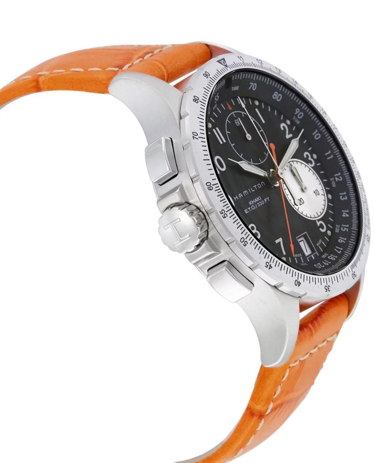 Мужские часы-хронографХронографФункция позволяет измерять отрезки времени с особой точностью: часы, минуты, секунды. Верным признаком хронографа является наличие на циферблате 3 дополнительных окошек-счётчиков. Hamilton Khaki Aviation ETO Chrono Quartz H77612933 с надёжным кварцевым механизмом. Корпус часов изготовлен из нержавеющей стали. Кожаный ремешок на стандартной застёжке. Сапфировое стеклоСапфировое стеклоПрочный и надёжный материал из кристалла сапфира синтетического происхождения, характеризующийся особой твёрдостью и устойчивостью к царапинам и повреждениям. с антибликовым покрытием. Второй часовой поясВторой часовой поясФункция, позволяющая отображать время двух часовых поясов одновременно., вычисление поправки на ветер, окошко даты находится в положении 6 часов. Стрелки и метки с люминесцентным покрытиемЛюминесцентное покрытиеПозволяет считывать показания времени в темноте. Производители наносят на стрелки, часовые индексы, безель или поверхность циферблата светонакопительный состав, дающий холодное свечение.. Уровень влагозащиты: 100 метров, позволит плавать, нырять и заниматься другими водными видами спорта.