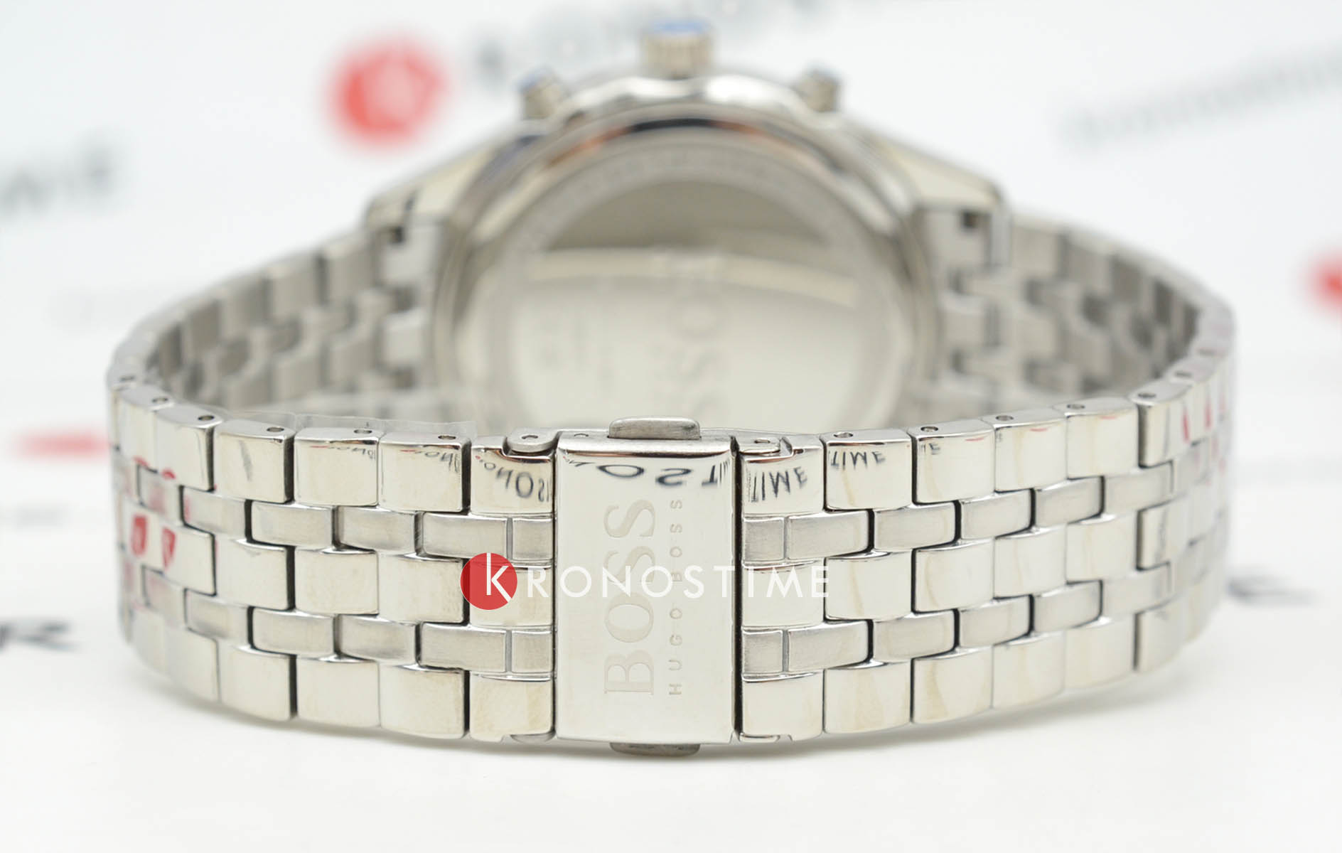 Мужские часы Hugo Boss Associate HB1513839 представлены в круглом 42-мм корпусе из нержавеющей стали 316L, оснащены кварцевым механизмом с функцией хронографаХронографФункция позволяет измерять отрезки времени с особой точностью: часы, минуты, секунды. Верным признаком хронографа является наличие на циферблате 3 дополнительных окошек-счётчиков. и секундомеромСекундомерСекундоме́р — прибор, способный измерять интервалы времени с точностью до долей секунды., а также окошком даты на позиции 4 часа. Синий циферблат со штриховыми метками и люминесцентными стрелками защищен устойчивым к царапинам минеральным стекломМинеральное стеклоМинеральное стекло представляет собой искусственно выращенный минерал кварца. Такое стекло отличается особой устойчивостью к повреждениям и царапинам. Уступает по некоторым качествам сапфировому стеклу., а стальной браслет дополнен раскладной застёжкойРаскладная застёжкаТакой тип застёжки используется только на браслетах из металла. Она никогда не раскрывается полностью, происходит разделение на 2 и более частей. Раскладывающая застёжка снизит вероятность потери часов к минимуму. для удобной регулировки. Водонепроницаемость 50 метров (5 ATM) обеспечивает защиту от брызг воды и дождя.