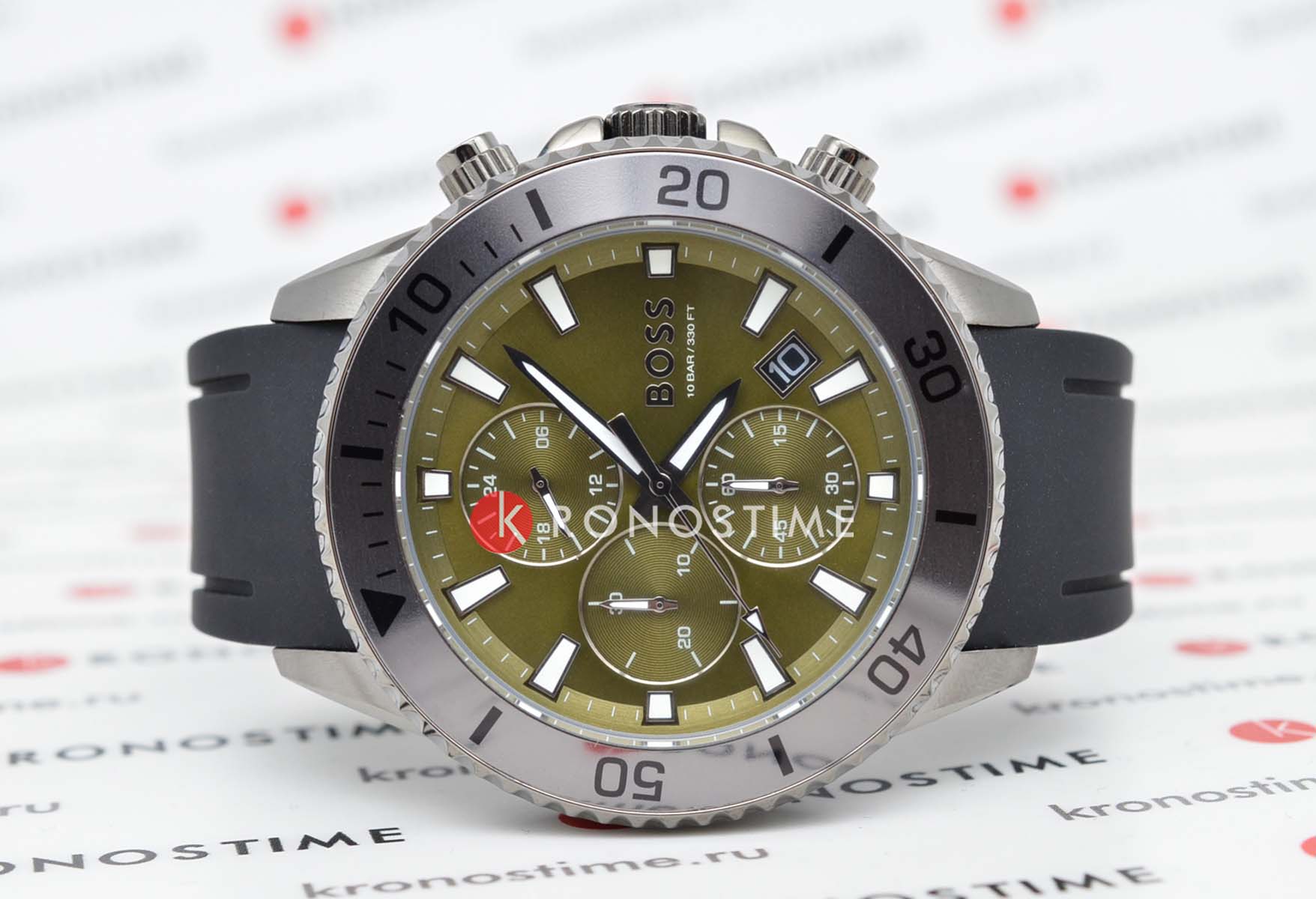 Мужские часы Hugo Boss Admiral HB1513967 представлены в круглом 46-мм корпусе из нержавеющей стали с IP-покрытиемIP-покрытиеМетод ионного напыления. Демонстрирует повышенную устойчивость к истиранию, окислению и химическим веществам. Под воздействием высокого давления и температуры около 1500°C молекулы металла надёжно соединяются с частицами корпуса часов.. Оснащены кварцевым механизмом с функциями хронографаХронографФункция позволяет измерять отрезки времени с особой точностью: часы, минуты, секунды. Верным признаком хронографа является наличие на циферблате 3 дополнительных окошек-счётчиков. и секундомеромСекундомерСекундоме́р — прибор, способный измерять интервалы времени с точностью до долей секунды. на безелеБезельВнешний ободок, закрепляющий стекло. В спортивных часах так называется поворотное кольцо с делениями на циферблате, выполняет роль таймера – замеряет отрезки времени на шкале. Неподвижный безель – элемент декора. Однонаправленно вращающийся безель на дайверских часах позволяет фиксировать моменты погружения и выныривания на поверхность.. Зеленый циферблат защищен устойчивым к царапинам минеральным стекломМинеральное стеклоМинеральное стекло представляет собой искусственно выращенный минерал кварца. Такое стекло отличается особой устойчивостью к повреждениям и царапинам. Уступает по некоторым качествам сапфировому стеклу.. Силиконовый ремешок черного цвета дополнен стандартной застежкой, а стрелки покрыты люминесцентным составомЛюминесцентное покрытиеПозволяет считывать показания времени в темноте. Производители наносят на стрелки, часовые индексы, безель или поверхность циферблата светонакопительный состав, дающий холодное свечение. для видимости в темноте. Водонепроницаемость 100 метров (10 ATM) позволяет использовать часы для плавания.