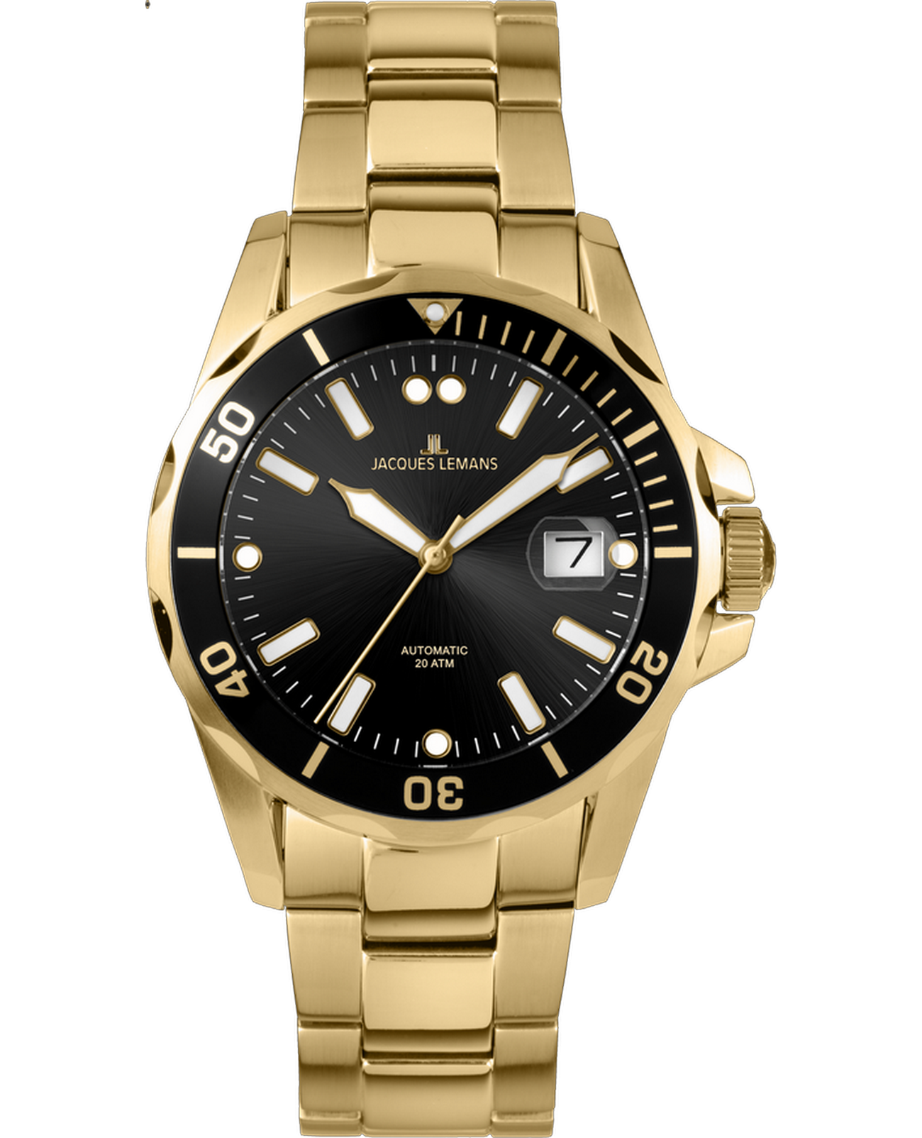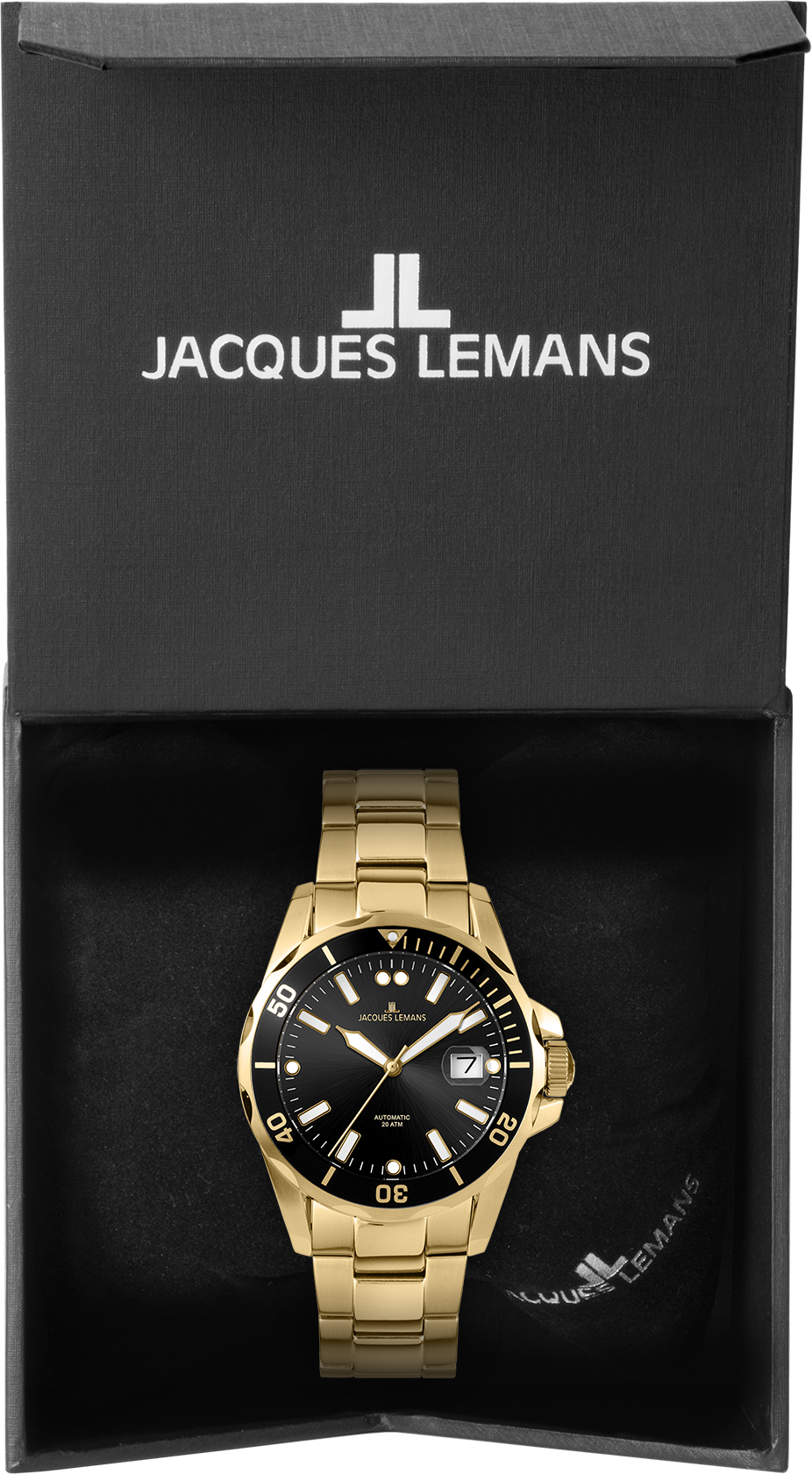 Мужские австрийские часы Jacques Lemans Sport 1-2089H, механический механизм (автоматический калибр) с высокой точностью. Класс водозащиты: 200 метров, позволит плавать, нырять и заниматься другими водными видами спорта. Корпус часов изготовлен из стали, золотистого цвета.