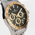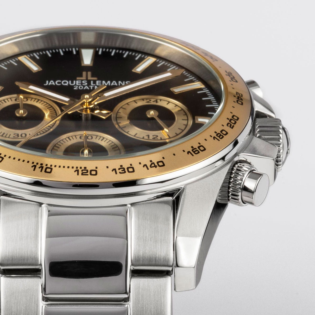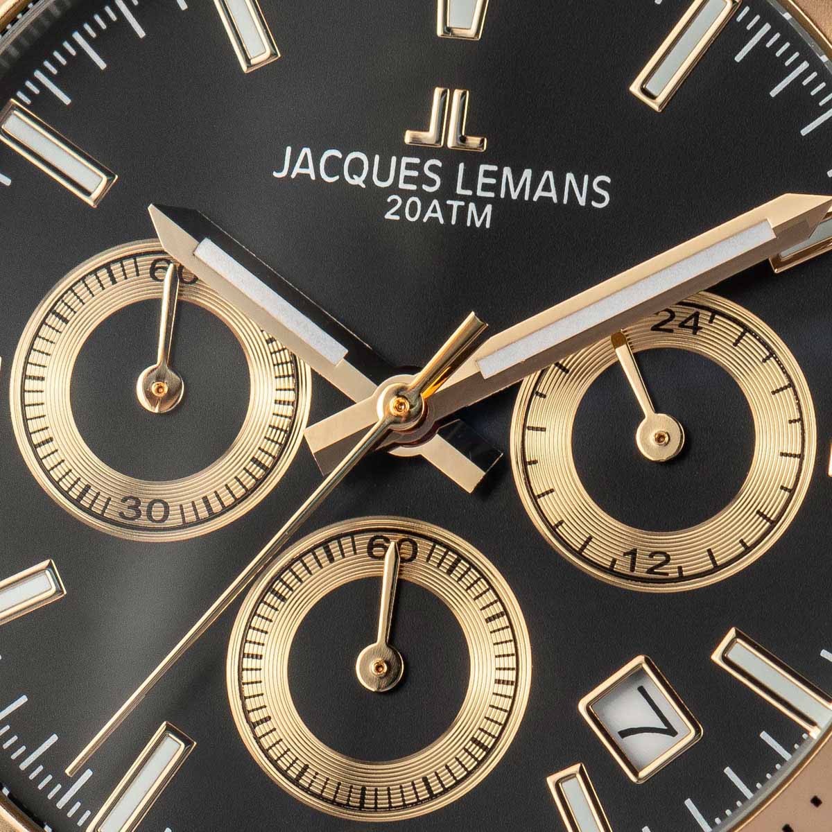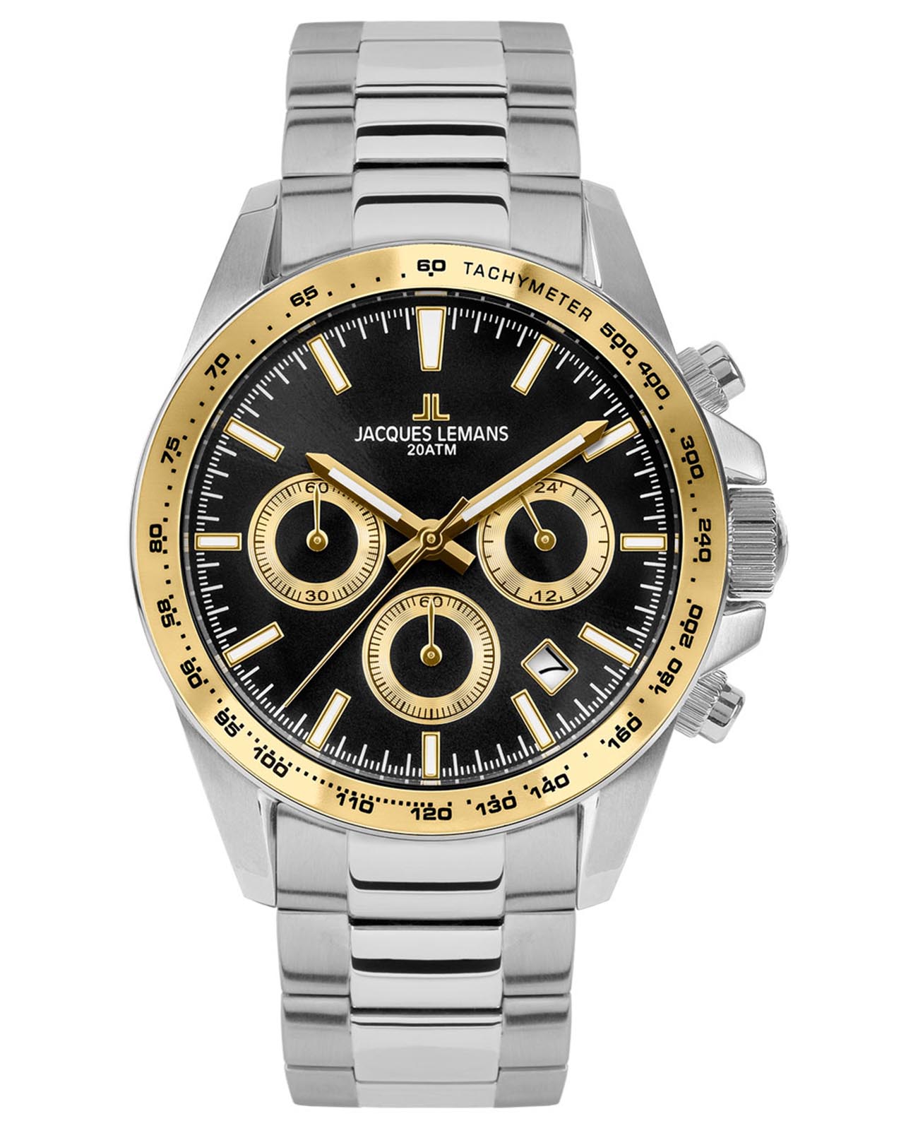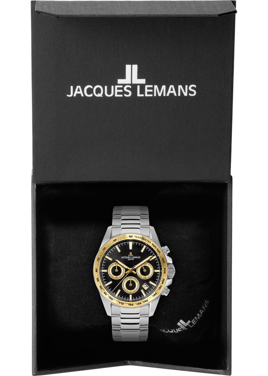 Мужские часы Jacques Lemans Liverpool 1-1877H с минеральным стекломМинеральное стеклоМинеральное стекло представляет собой искусственно выращенный минерал кварца. Такое стекло отличается особой устойчивостью к повреждениям и царапинам. Уступает по некоторым качествам сапфировому стеклу., кварцевый механизм с высокой точностью. Часы- хронографХронографФункция позволяет измерять отрезки времени с особой точностью: часы, минуты, секунды. Верным признаком хронографа является наличие на циферблате 3 дополнительных окошек-счётчиков. с секундомеромСекундомерСекундоме́р — прибор, способный измерять интервалы времени с точностью до долей секунды. представляют собой стильный аксессуар, отражающий идеальное сочетание современного дизайна, надёжности и функциональности. Неподвижный безельБезельВнешний ободок, закрепляющий стекло. В спортивных часах так называется поворотное кольцо с делениями на циферблате, выполняет роль таймера – замеряет отрезки времени на шкале. Неподвижный безель – элемент декора. Однонаправленно вращающийся безель на дайверских часах позволяет фиксировать моменты погружения и выныривания на поверхность. из нержавеющей стали с PVDPVDУльтратонкое покрытие наносится в технике вакуумного напыления, сочетает в себе нитрид титана особой прочности со слоем золота или оксида хрома. Несёт в себе декоративную или защитную функцию. покрытием и с тахиметромТахиметрРазмеченная шкала, располагается на ободке или безеле часов. Тахиметр позволяет рассчитать скорость на определённом участке пути, расстояние измеряется в километрах или милях.. На циферблате расположены два дополнительных индикатора и окошко даты. Стрелки и метки с люминесцентным покрытиемЛюминесцентное покрытиеПозволяет считывать показания времени в темноте. Производители наносят на стрелки, часовые индексы, безель или поверхность циферблата светонакопительный состав, дающий холодное свечение.. Класс водозащиты: 200 метров, позволит плавать, нырять и заниматься другими водными видами спорта. Рифленая заводная головка с защитой. Браслет из нержавеющей стали на раскладной застёжкеРаскладная застёжкаТакой тип застёжки используется только на браслетах из металла. Она никогда не раскрывается полностью, происходит разделение на 2 и более частей. Раскладывающая застёжка снизит вероятность потери часов к минимуму..