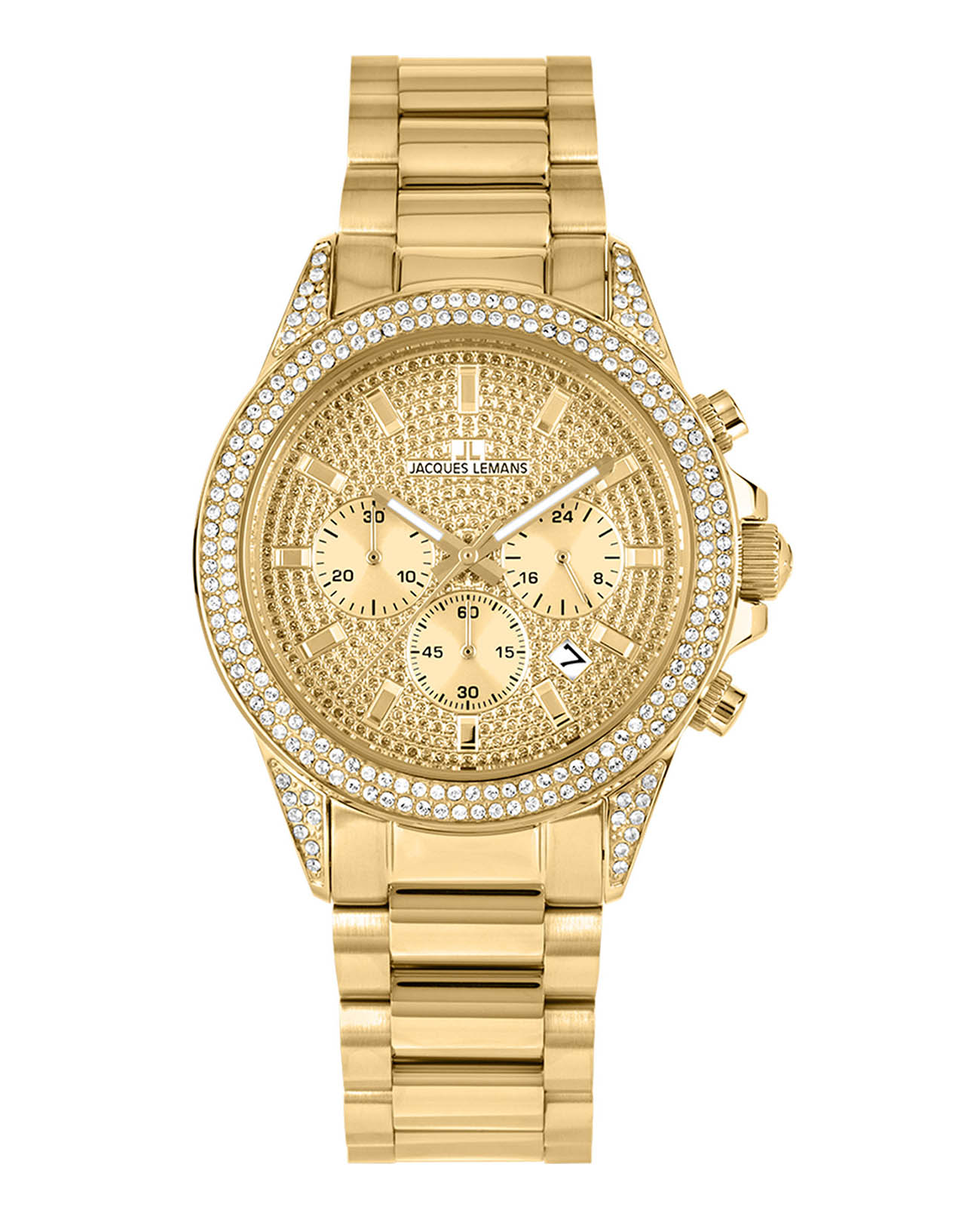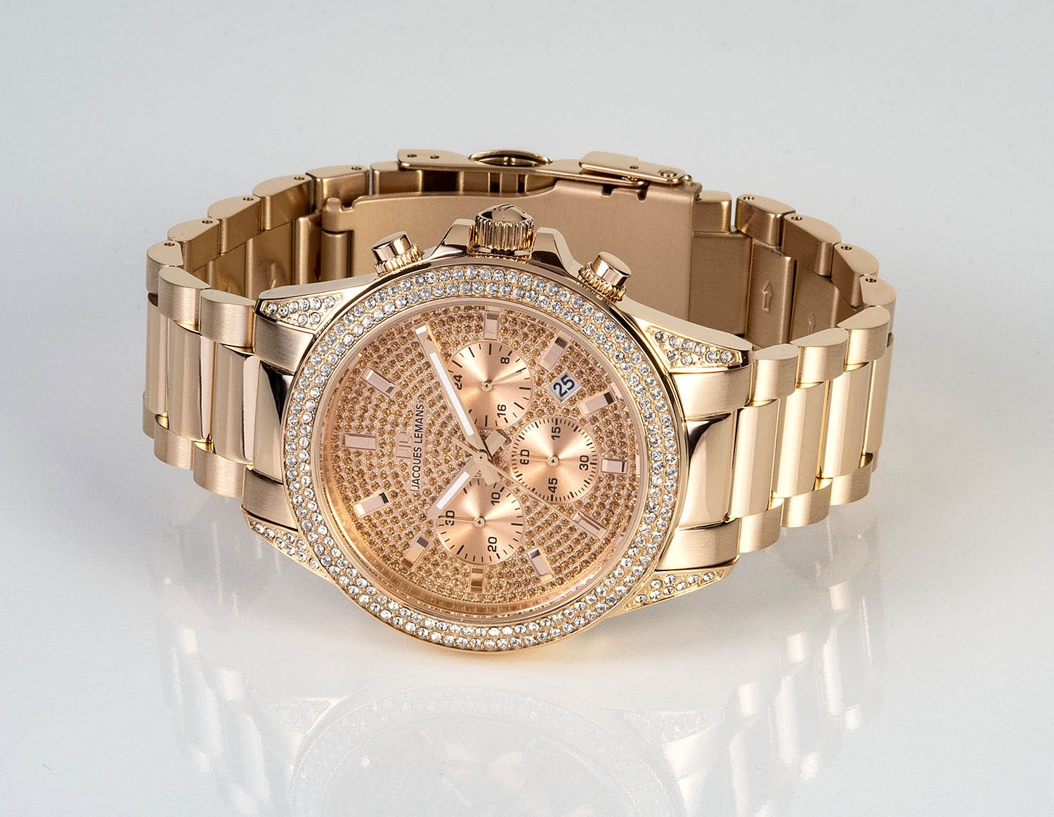 Женские австрийские часы с хронографом Jacques Lemans Design Collection 1-2051C, кварцевый механизм с высокой точностью. Класс водозащиты: 100 метров, позволит плавать, нырять и заниматься другими водными видами спорта. Корпус часов изготовлен из стали, золотистого цвета.
