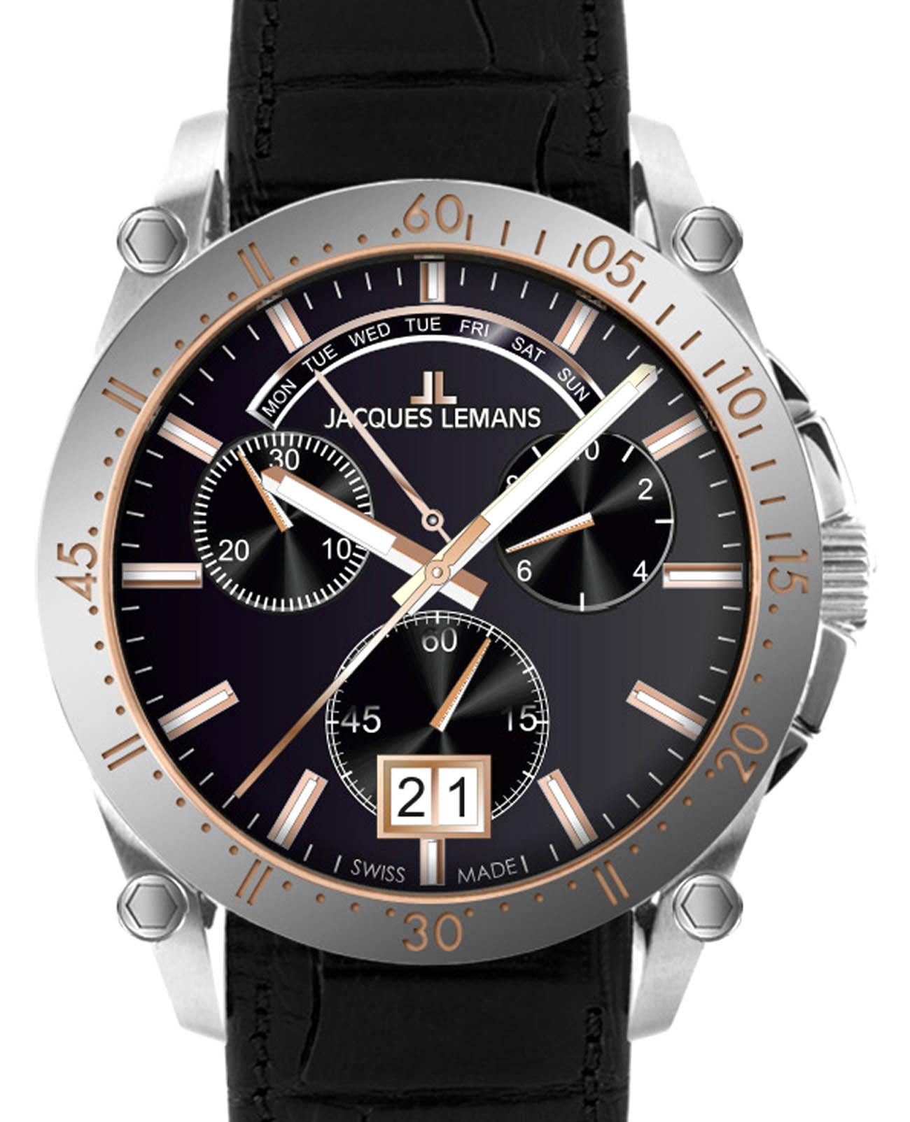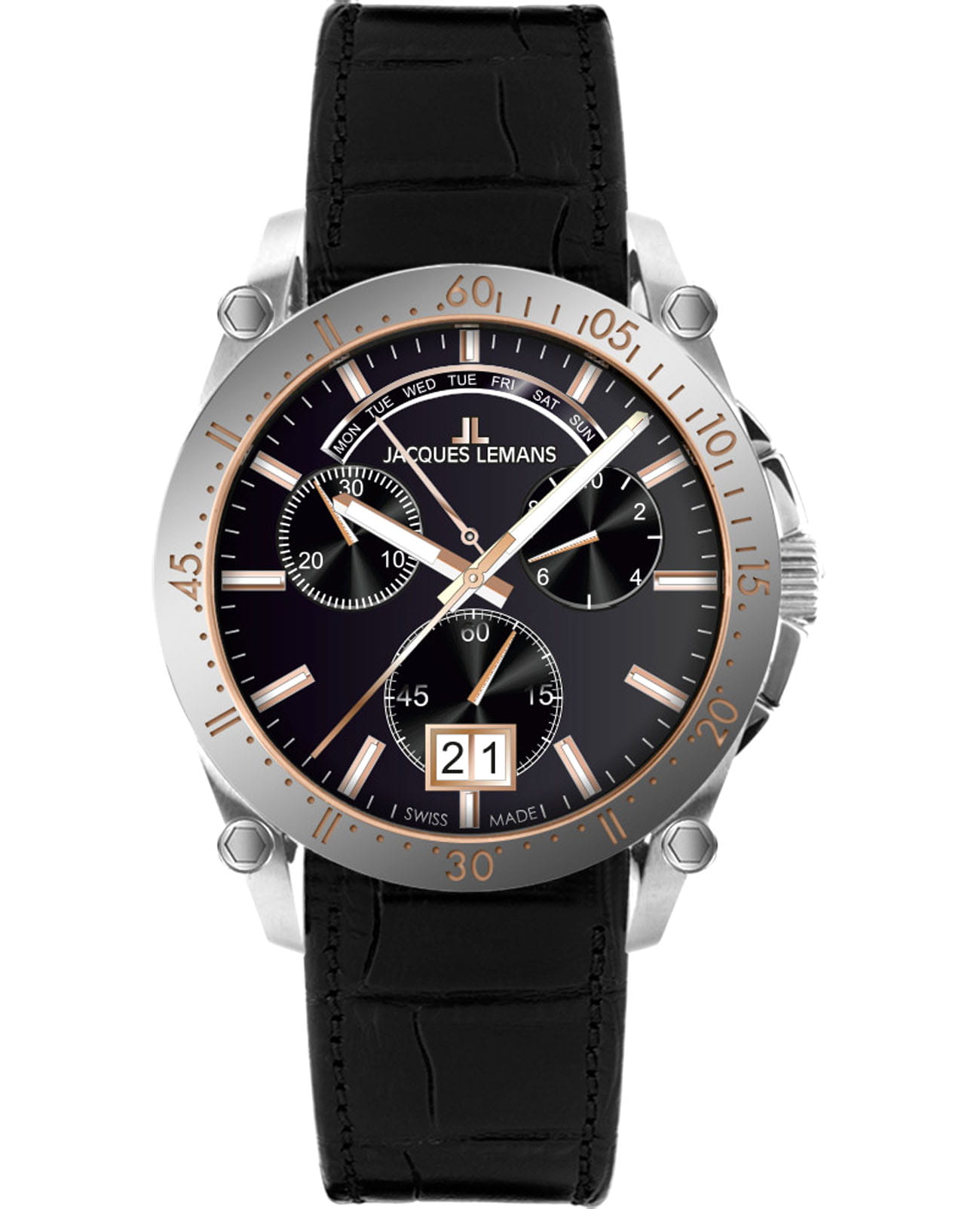 Мужские часы-хронографХронографФункция позволяет измерять отрезки времени с особой точностью: часы, минуты, секунды. Верным признаком хронографа является наличие на циферблате 3 дополнительных окошек-счётчиков. Jacques Lemans 1-2198H– лаконичная красота и изысканная элегантность. Оригинальная модель с классическим оформлением станет превосходным завершением образа, наделив его индивидуальным характером. Корпус выполнен из нержавеющей стали, диаметром 44 мм, что обеспечивает долговечность и утончённый внешний вид. Ударопрочное минеральное стеклоМинеральное стеклоМинеральное стекло представляет собой искусственно выращенный минерал кварца. Такое стекло отличается особой устойчивостью к повреждениям и царапинам. Уступает по некоторым качествам сапфировому стеклу. защищает циферблат от царапин. Кожаный ремешок на стандартной застёжке обеспечивает комфортное ношение. Водозащита 100 метров позволит плавать, нырять и заниматься другими водными видами спорта. Стрелки и метки с люминесцентным покрытиемЛюминесцентное покрытиеПозволяет считывать показания времени в темноте. Производители наносят на стрелки, часовые индексы, безель или поверхность циферблата светонакопительный состав, дающий холодное свечение. позволяющие легко определять время даже в темноте. Окошко даты находится в положении 6 часов. Широкое окошко дня недели в положении 12 часов позволяет показывать название дня недели. Это аксессуар для мужчины, который ценит классический стиль и функциональность.