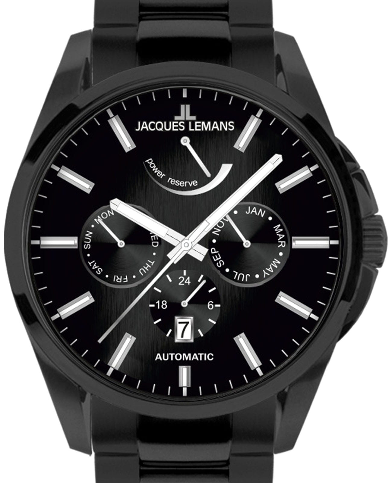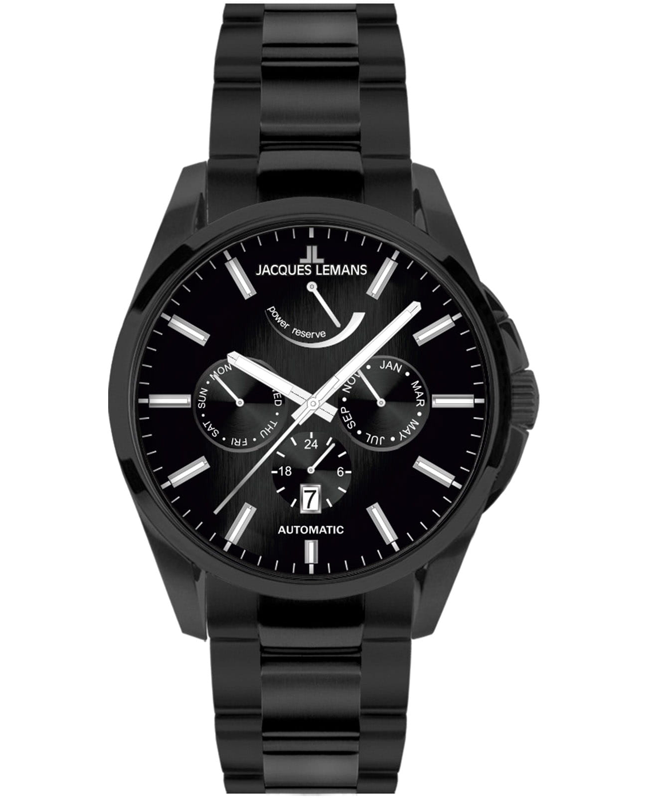 Мужские механические часы с автоподзаводом Jacques Lemans 1-2204A – лаконичная красота и изысканная элегантность. Оригинальная модель с классическим оформлением станет превосходным завершением образа, наделив его индивидуальным характером. Корпус выполнен из нержавеющей стали с PVD-покрытиемPVDУльтратонкое покрытие наносится в технике вакуумного напыления, сочетает в себе нитрид титана особой прочности со слоем золота или оксида хрома. Несёт в себе декоративную или защитную функцию. черного цвета, диаметром 44 мм, что обеспечивает долговечность и утончённый внешний вид. Минеральное стеклоМинеральное стеклоМинеральное стекло представляет собой искусственно выращенный минерал кварца. Такое стекло отличается особой устойчивостью к повреждениям и царапинам. Уступает по некоторым качествам сапфировому стеклу. с сапфировым напылением защищает циферблат от царапин. Стальной браслет на раскладной застёжкеРаскладная застёжкаТакой тип застёжки используется только на браслетах из металла. Она никогда не раскрывается полностью, происходит разделение на 2 и более частей. Раскладывающая застёжка снизит вероятность потери часов к минимуму. обеспечивает комфортное ношение. Водозащита 100 метров позволит плавать, нырять и заниматься другими водными видами спорта. Стрелки и метки с люминесцентным покрытиемЛюминесцентное покрытиеПозволяет считывать показания времени в темноте. Производители наносят на стрелки, часовые индексы, безель или поверхность циферблата светонакопительный состав, дающий холодное свечение. позволяющие легко определять время даже в темноте. Окошко даты находится в положении 6 часов. Индикатор 24-х часов, календарь недели и месяцев вынесены на отдельные циферблаты. Индикация запаса хода в положении 12 часов. Рифленая заводная головка с защитой. Это аксессуар для мужчины, который ценит классический стиль и функциональность.
