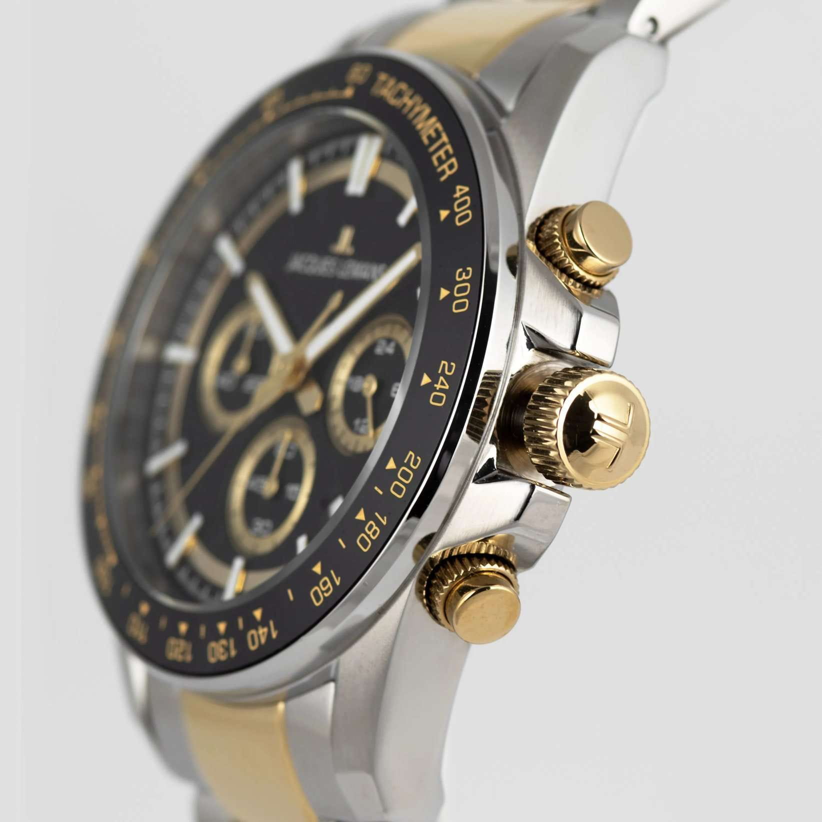Мужские кварцевые часы-хронографХронографФункция позволяет измерять отрезки времени с особой точностью: часы, минуты, секунды. Верным признаком хронографа является наличие на циферблате 3 дополнительных окошек-счётчиков. с секундомеромСекундомерСекундоме́р — прибор, способный измерять интервалы времени с точностью до долей секунды. Jacques Lemans 1-2207D – лаконичная красота и изысканная элегантность. Оригинальная модель с классическим оформлением станет превосходным завершением образа, наделив его индивидуальным характером. Корпус выполнен из нержавеющей стали серебристого цвета, диаметром 43 мм, что обеспечивает долговечность и утончённый внешний вид. Минеральное стеклоМинеральное стеклоМинеральное стекло представляет собой искусственно выращенный минерал кварца. Такое стекло отличается особой устойчивостью к повреждениям и царапинам. Уступает по некоторым качествам сапфировому стеклу. повышенной прочности Crystex защищает циферблат от царапин. Неподвижный безельБезельВнешний ободок, закрепляющий стекло. В спортивных часах так называется поворотное кольцо с делениями на циферблате, выполняет роль таймера – замеряет отрезки времени на шкале. Неподвижный безель – элемент декора. Однонаправленно вращающийся безель на дайверских часах позволяет фиксировать моменты погружения и выныривания на поверхность. с PVD-покрытиемPVDУльтратонкое покрытие наносится в технике вакуумного напыления, сочетает в себе нитрид титана особой прочности со слоем золота или оксида хрома. Несёт в себе декоративную или защитную функцию. и тахиметромТахиметрРазмеченная шкала, располагается на ободке или безеле часов. Тахиметр позволяет рассчитать скорость на определённом участке пути, расстояние измеряется в километрах или милях.. Стальной браслет с частичным PVD-покрытиемPVDУльтратонкое покрытие наносится в технике вакуумного напыления, сочетает в себе нитрид титана особой прочности со слоем золота или оксида хрома. Несёт в себе декоративную или защитную функцию. на раскладной застёжке с фиксаторомРаскладная застёжкаТакой тип застёжки используется только на браслетах из металла. Она никогда не раскрывается полностью, происходит разделение на 2 и более частей. Раскладывающая застёжка снизит вероятность потери часов к минимуму. обеспечивает комфортное ношение Водозащита 200 метров позволит плавать, нырять и заниматься другими водными видами спорта. Стрелки и метки с люминесцентным покрытиемЛюминесцентное покрытиеПозволяет считывать показания времени в темноте. Производители наносят на стрелки, часовые индексы, безель или поверхность циферблата светонакопительный состав, дающий холодное свечение. позволяющие легко определять время даже в темноте. 12-ти и 24-х часовой формат времени. Окошко даты находится в положении между 4 и 5 часами. Рифленая заводная головка с защитой. Это аксессуар для мужчины, который ценит классический стиль и функциональность.