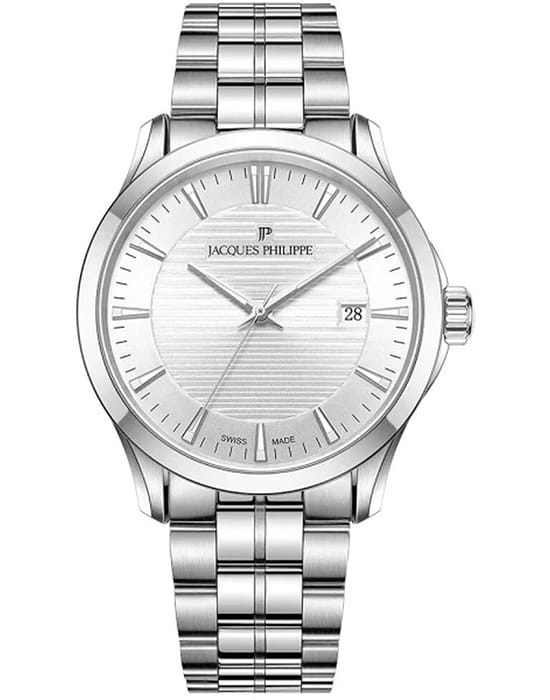 Jacques Philippe JPQGS791326 — стильные мужские часы в классическом формате с акцентом на надёжность и элегантность. Корпус круглой формы диаметром 40 мм из нержавеющей стали отличается утонченным силуэтом, обеспечивая комфорт при длительном ношении . Циферблат оформлен лаконично: тонкие стрелки и минималистичные часовые метки с люминесцентным покрытиемЛюминесцентное покрытиеПозволяет считывать показания времени в темноте. Производители наносят на стрелки, часовые индексы, безель или поверхность циферблата светонакопительный состав, дающий холодное свечение. подчёркивают строгий характер модели. Встроенная функция отображения даты придаёт часам практичность без лишнего визуального нагромождения. Поверхность защищает сапфировое стеклоСапфировое стеклоПрочный и надёжный материал из кристалла сапфира синтетического происхождения, характеризующийся особой твёрдостью и устойчивостью к царапинам и повреждениям. — устойчивое к царапинам и бликам. Внутри используется точный швейцарский кварцевый механизм, не требующий подзавода и сохраняющий стабильную работу без сложного обслуживания. Модель оснащена металлическим браслетом из нержавеющей стали в оттенке металлик на застёжке-бабочке с кнопкамиЗастёжка "бабочка"Такой вид застёжки дополняется предохранителями, помогающими избежать случайного раскрытия браслета. Обладают изящным исполнением. , что обеспечивает надёжную посадку и солидный внешний вид . Водозащита составляет до 5 ATM, — часы без проблем выдерживают случайный контакт с водой в повседневной эксплуатации . Jacques Philippe — гармоничное сочетание классического стиля, точного швейцарского кварца и практичности в одном надёжном аксессуаре.