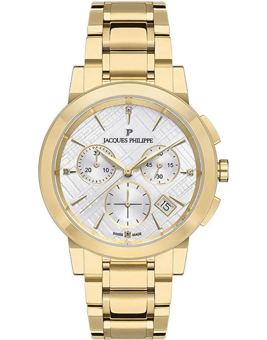 Швейцарские женские часы c хронографомХронографФункция позволяет измерять отрезки времени с особой точностью: часы, минуты, секунды. Верным признаком хронографа является наличие на циферблате 3 дополнительных окошек-счётчиков. Jacques Philippe Cosmos JPQLC322324, кварцевый механизм с высокой точностью. Сапфировое стеклоСапфировое стеклоПрочный и надёжный материал из кристалла сапфира синтетического происхождения, характеризующийся особой твёрдостью и устойчивостью к царапинам и повреждениям. устойчивое к появлению царапин, обладающее высокой прозрачностью. Корпус часов изготовлен из нержавеющей стали с PVD-покрытиемPVDУльтратонкое покрытие наносится в технике вакуумного напыления, сочетает в себе нитрид титана особой прочности со слоем золота или оксида хрома. Несёт в себе декоративную или защитную функцию.. Класс водозащиты: 50 метров, позволит защитить корпус от случайных брызг или капель дождя. Стальной браслет с PVD-покрытиемPVDУльтратонкое покрытие наносится в технике вакуумного напыления, сочетает в себе нитрид титана особой прочности со слоем золота или оксида хрома. Несёт в себе декоративную или защитную функцию. на застёжке-бабочке с кнопкамиЗастёжка "бабочка"Такой вид застёжки дополняется предохранителями, помогающими избежать случайного раскрытия браслета. Обладают изящным исполнением. . Окошко даты находится в положении между 4 и 5 часов. Циферблат инкрустирован кристаллами.