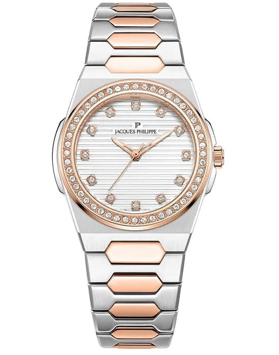 Jacques Philippe Bellus JPQLS727328RG — изящная женская модель коллекции Bellus с точным кварцевым механизмом Swiss Made, где корпус диаметром 33 мм и толщиной 5 мм выполнен из нержавеющей стали, а безельБезельВнешний ободок, закрепляющий стекло. В спортивных часах так называется поворотное кольцо с делениями на циферблате, выполняет роль таймера – замеряет отрезки времени на шкале. Неподвижный безель – элемент декора. Однонаправленно вращающийся безель на дайверских часах позволяет фиксировать моменты погружения и выныривания на поверхность. с PVDPVDУльтратонкое покрытие наносится в технике вакуумного напыления, сочетает в себе нитрид титана особой прочности со слоем золота или оксида хрома. Несёт в себе декоративную или защитную функцию.-покрытием инкрустирован кристаллами, придающими модели утончённый блеск. Выпуклое сапфировое стеклоСапфировое стеклоПрочный и надёжный материал из кристалла сапфира синтетического происхождения, характеризующийся особой твёрдостью и устойчивостью к царапинам и повреждениям. обеспечивает высокую стойкость к царапинам и сохраняет прозрачность. Водозащита составляет 5 ATM (50 м). Браслет из нержавеющей стали с PVDPVDУльтратонкое покрытие наносится в технике вакуумного напыления, сочетает в себе нитрид титана особой прочности со слоем золота или оксида хрома. Несёт в себе декоративную или защитную функцию.-покрытием гармонично завершает дизайн, подчёркивая элегантность и целостность образа.