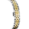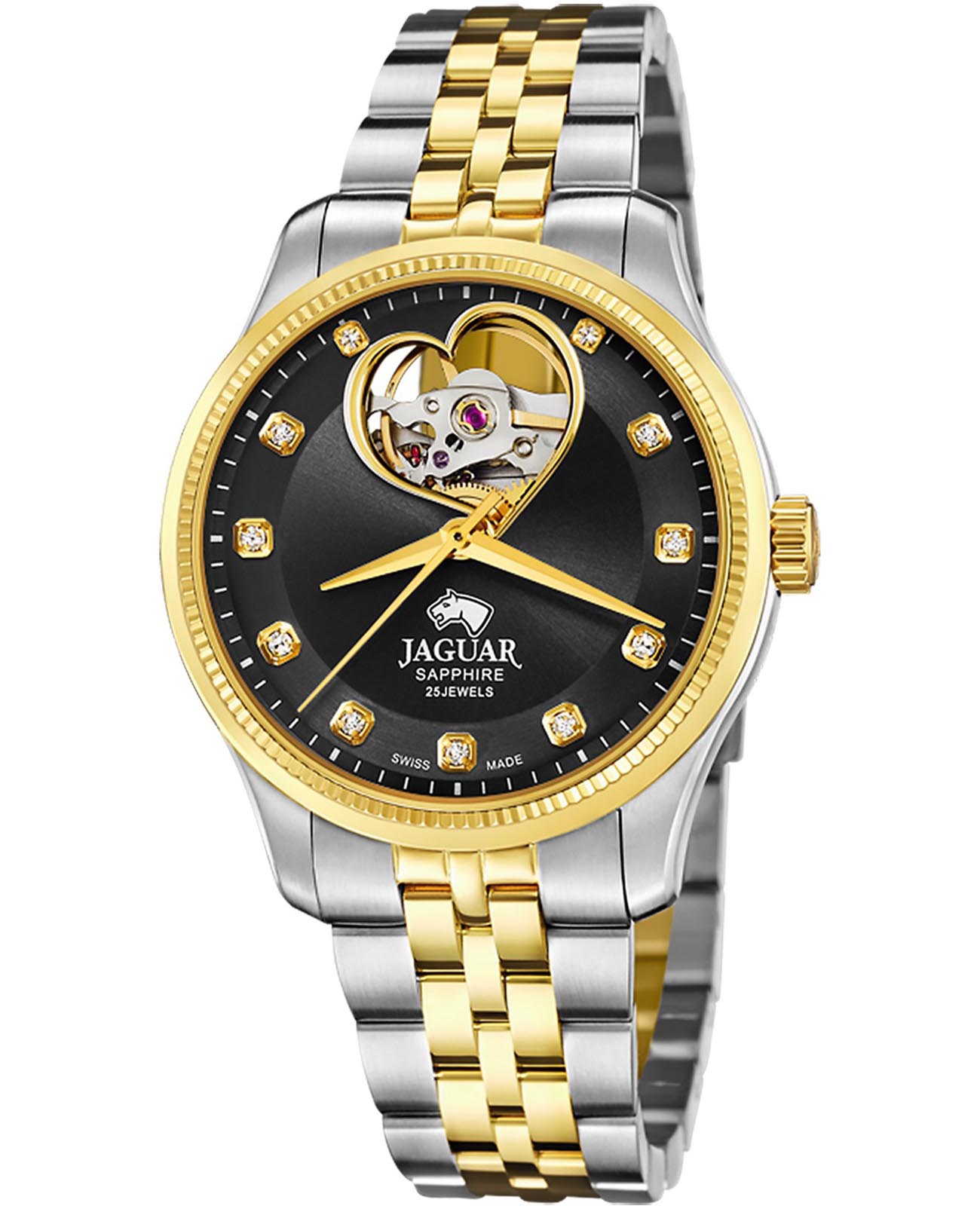 Женские швейцарские часы Jaguar Automatic Open Heart J995/2, механизм — автоподзавод. В часах с автоподзаводом заводная головка практически не используется, что исключает истирание ее материала и материала корпуса. Сапфировое стеклоСапфировое стеклоПрочный и надёжный материал из кристалла сапфира синтетического происхождения, характеризующийся особой твёрдостью и устойчивостью к царапинам и повреждениям. устойчивое к мелким механическим повреждениям. Корпус часов изготовлен из нержавеющей стали. Класс водозащиты: 50 метров, позволит защитить корпус от случайных брызг или капель дождя. Стальной браслет с частичным  PVD-покрытиемPVDУльтратонкое покрытие наносится в технике вакуумного напыления, сочетает в себе нитрид титана особой прочности со слоем золота или оксида хрома. Несёт в себе декоративную или защитную функцию. на застёжке-бабочке с кнопкамиЗастёжка "бабочка"Такой вид застёжки дополняется предохранителями, помогающими избежать случайного раскрытия браслета. Обладают изящным исполнением. . Циферблат украшен кристаллами в роли часовых индексов, крупная апертура в виде сердца, открывающая обзор на балансовое колесо механизма. БезельБезельВнешний ободок, закрепляющий стекло. В спортивных часах так называется поворотное кольцо с делениями на циферблате, выполняет роль таймера – замеряет отрезки времени на шкале. Неподвижный безель – элемент декора. Однонаправленно вращающийся безель на дайверских часах позволяет фиксировать моменты погружения и выныривания на поверхность. с PVD-покрытиемPVDУльтратонкое покрытие наносится в технике вакуумного напыления, сочетает в себе нитрид титана особой прочности со слоем золота или оксида хрома. Несёт в себе декоративную или защитную функцию..