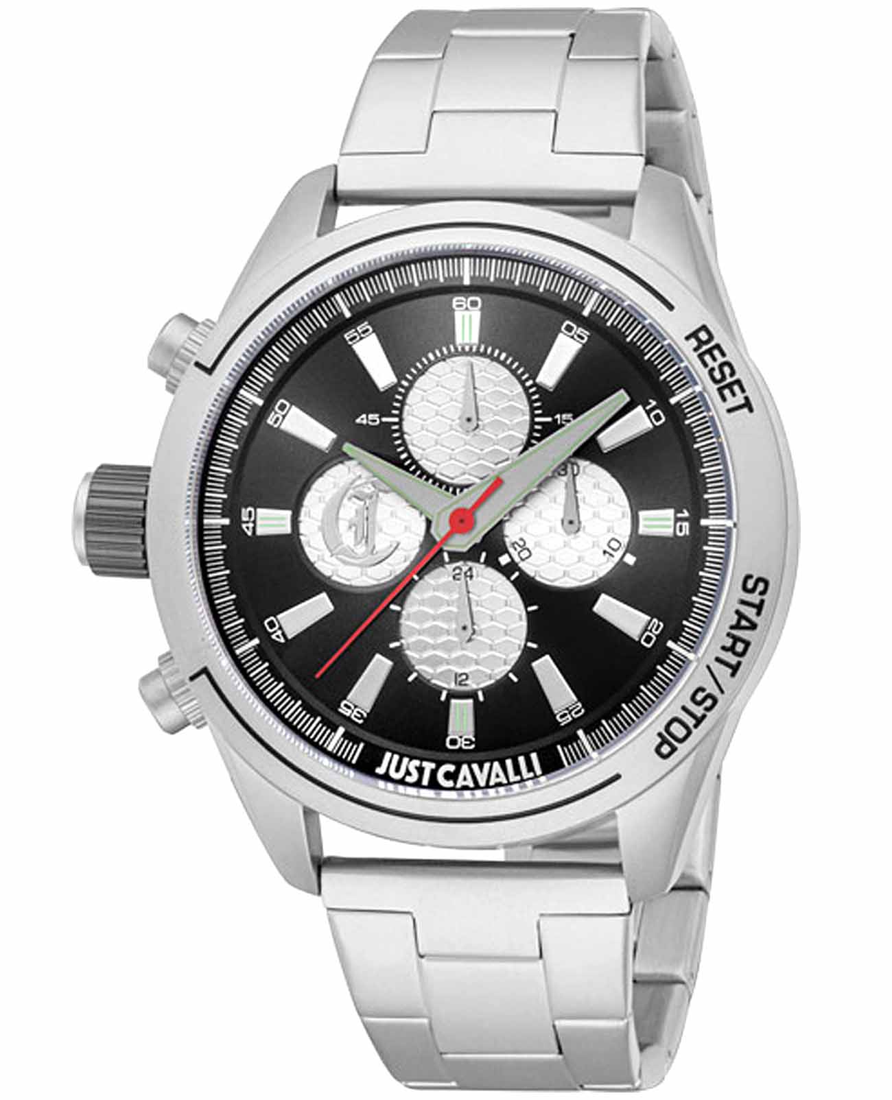 JUST CAVALLI JC1G347M0065 — стильные итальянские часы с функцией хронографаХронографФункция позволяет измерять отрезки времени с особой точностью: часы, минуты, секунды. Верным признаком хронографа является наличие на циферблате 3 дополнительных окошек-счётчиков., которые сочетают в себе элегантность и современный функционал. Круглый корпус диаметром 45 мм выполнен из нержавеющей стали, толщина корпуса составляет 12 мм, что придает модели выразительный внешний вид и надежную защиту от внешних воздействий. Часы оснащены кварцевым механизмом. Минеральное стеклоМинеральное стеклоМинеральное стекло представляет собой искусственно выращенный минерал кварца. Такое стекло отличается особой устойчивостью к повреждениям и царапинам. Уступает по некоторым качествам сапфировому стеклу. защищает часы от царапин, а водозащита 100 метров позволяет не снимать их во время плавания и занятий спортом. Стальной браслет на раскладной застёжкеРаскладная застёжкаТакой тип застёжки используется только на браслетах из металла. Она никогда не раскрывается полностью, происходит разделение на 2 и более частей. Раскладывающая застёжка снизит вероятность потери часов к минимуму. обеспечивает комфортное ношение.  Эта модель — идеальный выбор для тех, кто ценит современные технологии , классический стиль и качество.