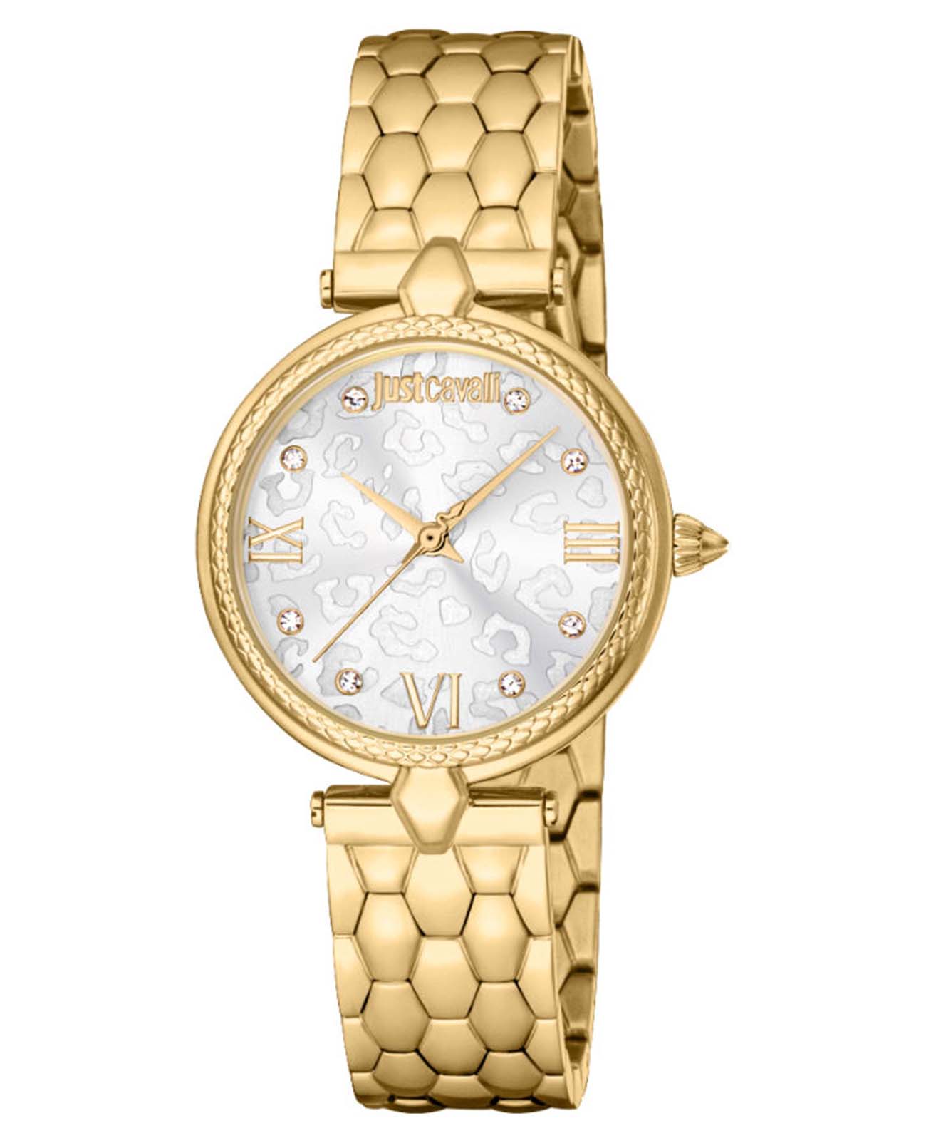 Элегантные женские часы Just Cavalli Donna JC1L254M0055 с минеральным стекломМинеральное стеклоМинеральное стекло представляет собой искусственно выращенный минерал кварца. Такое стекло отличается особой устойчивостью к повреждениям и царапинам. Уступает по некоторым качествам сапфировому стеклу., кварцевый механизм с высокой точностью. Циферблат украшен кристаллами. Корпус и браслет часов изготовлен из стали с PVD-покрытиемPVDУльтратонкое покрытие наносится в технике вакуумного напыления, сочетает в себе нитрид титана особой прочности со слоем золота или оксида хрома. Несёт в себе декоративную или защитную функцию.. Класс водозащиты: 50 метров, позволит защитить корпус от случайных брызг или капель дождя.