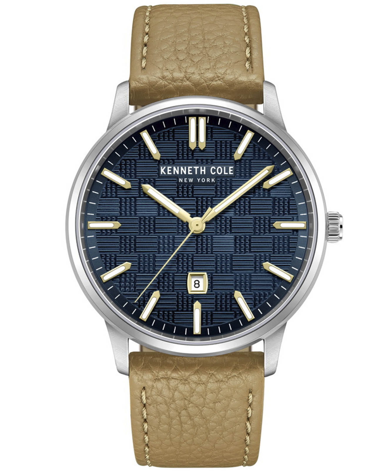 Мужские кварцевые часы Kenneth Cole KCWGB0046901 — это стильный и лаконичный аксессуар, подчеркивающий деловой или повседневный образ. Корпус диаметром 42 мм выполнен из стали. Циферблат синего цвета оформлен метками в виде штрихов, а окошко даты расположено в положении 3 часов. Циферблат защищён минеральным стекломМинеральное стеклоМинеральное стекло представляет собой искусственно выращенный минерал кварца. Такое стекло отличается особой устойчивостью к повреждениям и царапинам. Уступает по некоторым качествам сапфировому стеклу.. Часы оснащены ремешком из натуральной кожи бежевого цвета с классической пряжкой. Водонепроницаемость 30 м позволяет использовать часы в повседневных условиях, защищая от случайных брызг и капель дождя. Сочетание классического дизайна и надёжного исполнения делает эти часы практичным выбором для любого времени года.