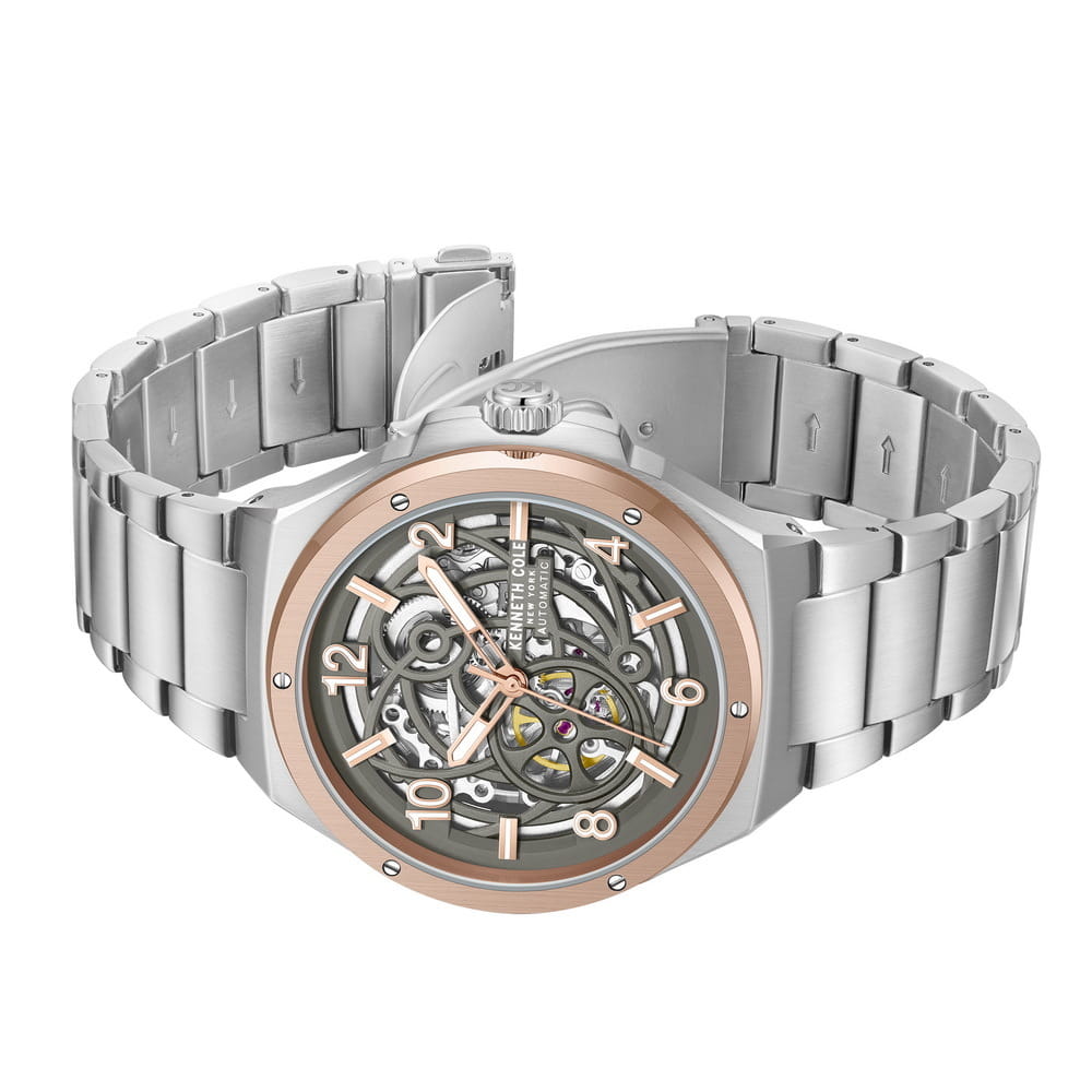 Kenneth Cole KCWGY0046303 — стильные мужские часы с автоматическим механизмом, которые сочетают современный дизайн и функциональность. Корпус диаметром 43,5 мм выполнен из нержавеющей стали, что обеспечивает прочность и долговечность. Минеральное стеклоМинеральное стеклоМинеральное стекло представляет собой искусственно выращенный минерал кварца. Такое стекло отличается особой устойчивостью к повреждениям и царапинам. Уступает по некоторым качествам сапфировому стеклу. защищает циферблат от царапин. БезельБезельВнешний ободок, закрепляющий стекло. В спортивных часах так называется поворотное кольцо с делениями на циферблате, выполняет роль таймера – замеряет отрезки времени на шкале. Неподвижный безель – элемент декора. Однонаправленно вращающийся безель на дайверских часах позволяет фиксировать моменты погружения и выныривания на поверхность. с PVD-покрытиемPVDУльтратонкое покрытие наносится в технике вакуумного напыления, сочетает в себе нитрид титана особой прочности со слоем золота или оксида хрома. Несёт в себе декоративную или защитную функцию.. Скелетонизированный циферблат позволяет наблюдать за работой механизма. Серые акценты и люминесцентные стрелкиЛюминесцентное покрытиеПозволяет считывать показания времени в темноте. Производители наносят на стрелки, часовые индексы, безель или поверхность циферблата светонакопительный состав, дающий холодное свечение. обеспечивают удобное считывание времени. Часы оснащены автоматическим механизмом, работающим без необходимости замены батареи. Водозащита до 3 ATM (30 метров) делает их подходящими для повседневного использования. Браслет из нержавеющей стали с раскладной застёжкойРаскладная застёжкаТакой тип застёжки используется только на браслетах из металла. Она никогда не раскрывается полностью, происходит разделение на 2 и более частей. Раскладывающая застёжка снизит вероятность потери часов к минимуму. гарантирует комфортное ношение и надёжную фиксацию. Kenneth Cole KCWGY0046303 — это идеальный выбор для мужчин, которые ценят стиль и инновационные технологии.