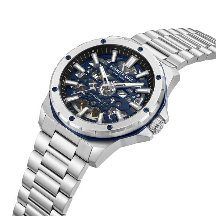 Мужские механические часы с автоподзаводом Kenneth Cole — это выразительный и элегантный аксессуар. Корпус диаметром 45 мм выполнен из нержавеющей стали 316L. Циферблат синего цвета оформлен в стиле скелетон, что позволяет наблюдать за работой механизма. Циферблат защищён минеральным стекломМинеральное стеклоМинеральное стекло представляет собой искусственно выращенный минерал кварца. Такое стекло отличается особой устойчивостью к повреждениям и царапинам. Уступает по некоторым качествам сапфировому стеклу.. Механизм — автоматический с функцией подзавода от движения руки. Прозрачная задняя крышка открывает вид на механизм. Часы оснащены стальным браслетом на раскладной застёжкеРаскладная застёжкаТакой тип застёжки используется только на браслетах из металла. Она никогда не раскрывается полностью, происходит разделение на 2 и более частей. Раскладывающая застёжка снизит вероятность потери часов к минимуму.. Водонепроницаемость 50 м позволяет использовать часы в повседневных условиях. Идеальный выбор для тех, кто ценит стиль, технологии и американское качество.