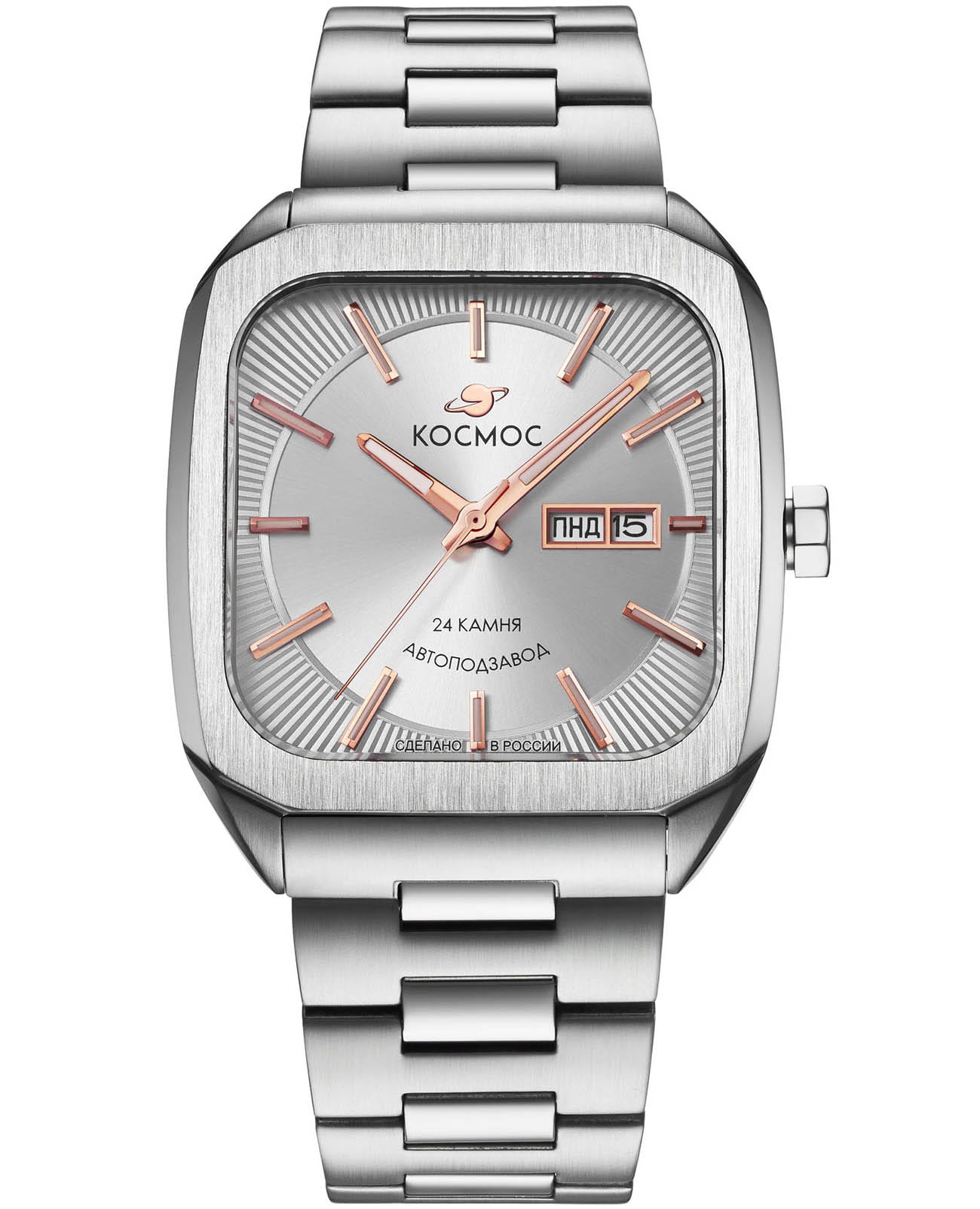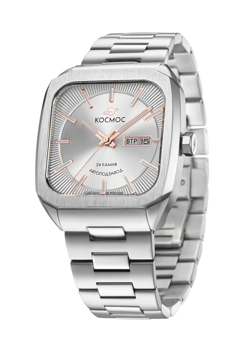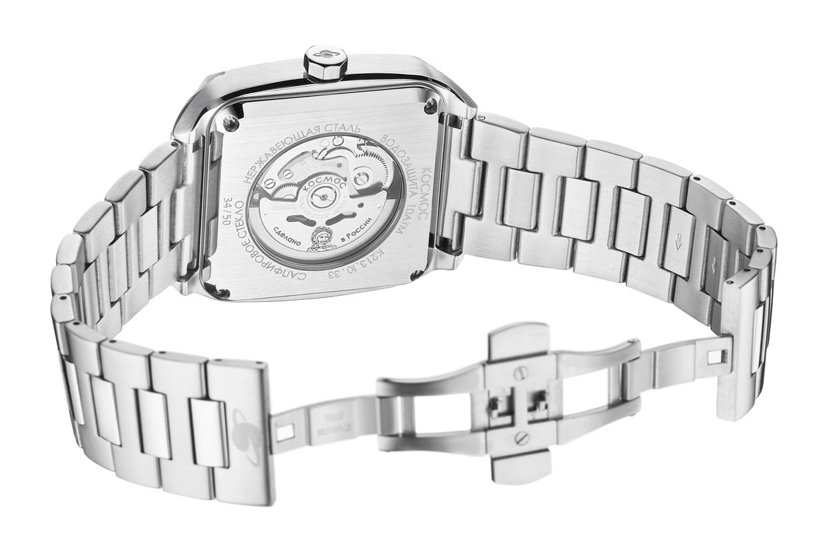 Мужские наручные часы Космос Марсоход K 213.10.33 — это уникальная лимитированная серия, посвященная аппарату, способному передвигаться по поверхности Красной планеты. Марсоход ассоциируется с брутальностью, мастерством и технической сложностью. Наша страна дважды запускала подобные аппараты еще в 70-х годах прошлого века. Дизайн часов серии Марсоход вдохновлен лучшими работами советских мастеров, сочетая современные технологии часового искусства с обаянием стиля ретро. Корпус в форме квадрата с закругленными углами выполнен из нержавеющей стали марки 316L, украшенной зеркальной полировкой и сатинированием. Удобная заводная головка имеет форму гайки, что добавляет модели индустриальный шарм. Задняя крышка прозрачная, закрепленная на четырех винтах, и позволяет увидеть работу механизма TMI с подвижным ротором, на котором гравируется надпись «Сделано в России». Также здесь представлена гравировка с изображением космонавта, придающая часам особую значимость. Водостойкость достигает 10 атм (WR100), что позволяет использовать часы при плавании и других водных видах спорта. На задней крышке указан индивидуальный номер модели в формате от 01/50 до 50/50 (первый выпуск) или от 051/200 до 200/200 (второй выпуск). Объемный циферблат состоит из двух уровней. В центре движутся три стрелки, часовая и минутная из которых имеют люминесцентное покрытиеЛюминесцентное покрытиеПозволяет считывать показания времени в темноте. Производители наносят на стрелки, часовые индексы, безель или поверхность циферблата светонакопительный состав, дающий холодное свечение., позволяющее определять время даже в темноте. Индексы накладные, как и стальная рамка, выделяющая сдвоенное окошко даты и дня недели, где день недели отображается на двух языках — русском и английском. Циферблат защищен прочным сапфировым стеклом с антибликовым покрытиемСапфировое стеклоПрочный и надёжный материал из кристалла сапфира синтетического происхождения, характеризующийся особой твёрдостью и устойчивостью к царапинам и повреждениям., обеспечивающим отличную читаемость показаний в любых условиях. Браслет изготовлен из литых стальных звеньев нержавеющей стали 316L и оснащен удобной застёжкой «бабочка» с кнопкамиЗастёжка "бабочка"Такой вид застёжки дополняется предохранителями, помогающими избежать случайного раскрытия браслета. Обладают изящным исполнением. , которая сводит к минимуму вероятность потери. Заводная головка, застежка и браслет украшены фирменным логотипом бренда. Коллекция Марсоход — идеальный выбор для ценителей истории космических достижений и современных технологий.