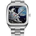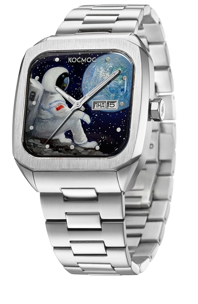 Мужские наручные часы Космос К 213.10 - Космический мечтатель — это уникальная модель. «Будущее человечества в Космосе!» - считал знаменитый ученый Константин Циолковский. Но «колыбель человечества», Земля, всегда останется предметом мечтания любого космонавта, в какой точке космоса он бы не находился. Так и герой фантазийного сюжета на циферблате часов неотрывно смотрит на нашу планету, несравнимо прекрасную и бесконечно родную.  Для создания этой уникальной модели часов мастера бренда выбрали технику лаковой миниатюры. На основу наносится несколько слоев лака и краски, их чередование создает объемный эффект и ощущение движения. Процесс постепенной прорисовки деталей довольно длительный: художнику требуется до 50 часов для завершения одного сюжета. Затем миниатюра запекается в специальной печи, что придаёт рисунку необходимую яркость и завершенность. Эти часы созданы в единственном экземпляре. В часах установлен механизм TMI с функцией автоподзавода. Они показывают часы, минуты и секунды, а также дату и день недели, индикатор которых с накладной рамкой расположен в положении «3 часа». За движением деталей механизма можно наблюдать, стоит только перевернуть часы: задняя крышка прозрачная, закреплена на 4-х винтах. Часовая и минутная стрелки c люминесцентным покрытиемЛюминесцентное покрытиеПозволяет считывать показания времени в темноте. Производители наносят на стрелки, часовые индексы, безель или поверхность циферблата светонакопительный состав, дающий холодное свечение., которое светится в темноте. В модели установлено сапфировое стеклоСапфировое стеклоПрочный и надёжный материал из кристалла сапфира синтетического происхождения, характеризующийся особой твёрдостью и устойчивостью к царапинам и повреждениям. с антибликовым покрытиемАнтибликовое покрытиеСлой оксида металла в 0,13-0,3 микрон, благодаря которому стекло часов не бликует и не отражает свет. Антибликовое покрытие уменьшает отражение света в 10 раз, обеспечивая отличную читаемость показателей циферблата.. Браслет собран из стальных звеньев с полировкой, удобная и надежная застежка-клипса украшена логотипом бренда Космос.