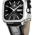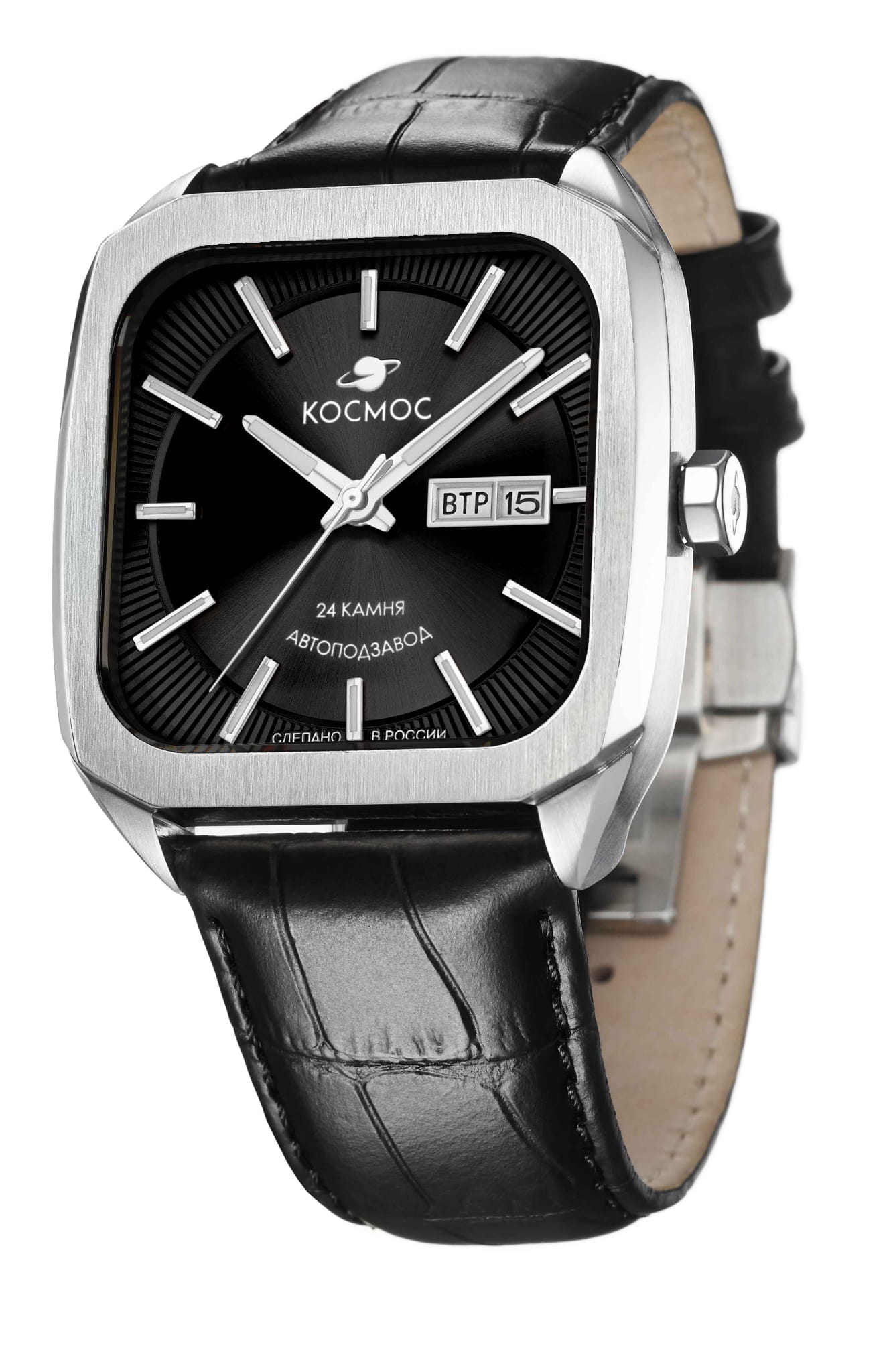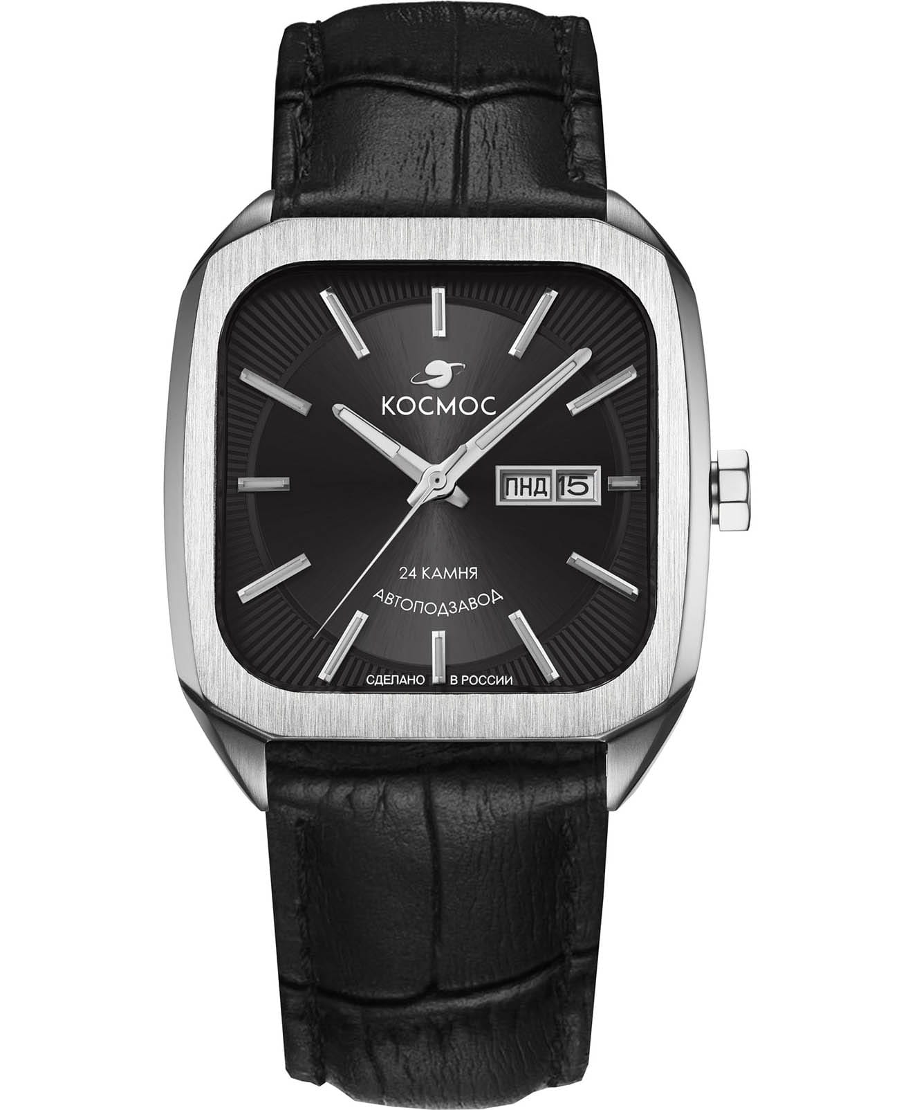 Мужские наручные часы Космос Марсоход K 213.11.31 — это уникальная лимитированная серия, посвященная аппарату, способному передвигаться по поверхности Красной планеты. Марсоход ассоциируется с брутальностью, мастерством и технической сложностью. Наша страна дважды запускала подобные аппараты еще в 70-х годах прошлого века. Дизайн часов серии Марсоход вдохновлен лучшими работами советских мастеров, сочетая современные технологии часового искусства с обаянием стиля ретро. Корпус в форме квадрата с закругленными углами выполнен из нержавеющей стали марки 316L, украшенной зеркальной полировкой и сатинированием. Удобная заводная головка имеет форму гайки, что добавляет модели индустриальный шарм. Задняя крышка прозрачная, закрепленная на четырех винтах, и позволяет увидеть работу механизма TMI с подвижным ротором, на котором гравируется надпись «Сделано в России». Также здесь представлена гравировка с изображением космонавта, придающая часам особую значимость. Водостойкость достигает 10 атм (WR100), что позволяет использовать часы при плавании и других водных видах спорта. На задней крышке указан индивидуальный номер модели в формате от 01/50 до 50/50 (первый выпуск) или от 051/100 до 100/100 (второй выпуск). Объемный циферблат состоит из двух уровней. В центре движутся три стрелки, часовая и минутная из которых имеют люминесцентное покрытиеЛюминесцентное покрытиеПозволяет считывать показания времени в темноте. Производители наносят на стрелки, часовые индексы, безель или поверхность циферблата светонакопительный состав, дающий холодное свечение., позволяющее определять время даже в темноте. Индексы накладные, как и стальная рамка, выделяющая сдвоенное окошко даты и дня недели, где день недели отображается на двух языках — русском и английском. Циферблат защищен прочным сапфировым стеклом с антибликовым покрытиемСапфировое стеклоПрочный и надёжный материал из кристалла сапфира синтетического происхождения, характеризующийся особой твёрдостью и устойчивостью к царапинам и повреждениям., обеспечивающим отличную читаемость показаний в любых условиях. Кожаный ремешок оснащен удобной застёжкой «бабочка» с кнопкамиЗастёжка "бабочка"Такой вид застёжки дополняется предохранителями, помогающими избежать случайного раскрытия браслета. Обладают изящным исполнением. , которая сводит к минимуму вероятность потери. Коллекция Марсоход — идеальный выбор для ценителей истории космических достижений и современных технологий.