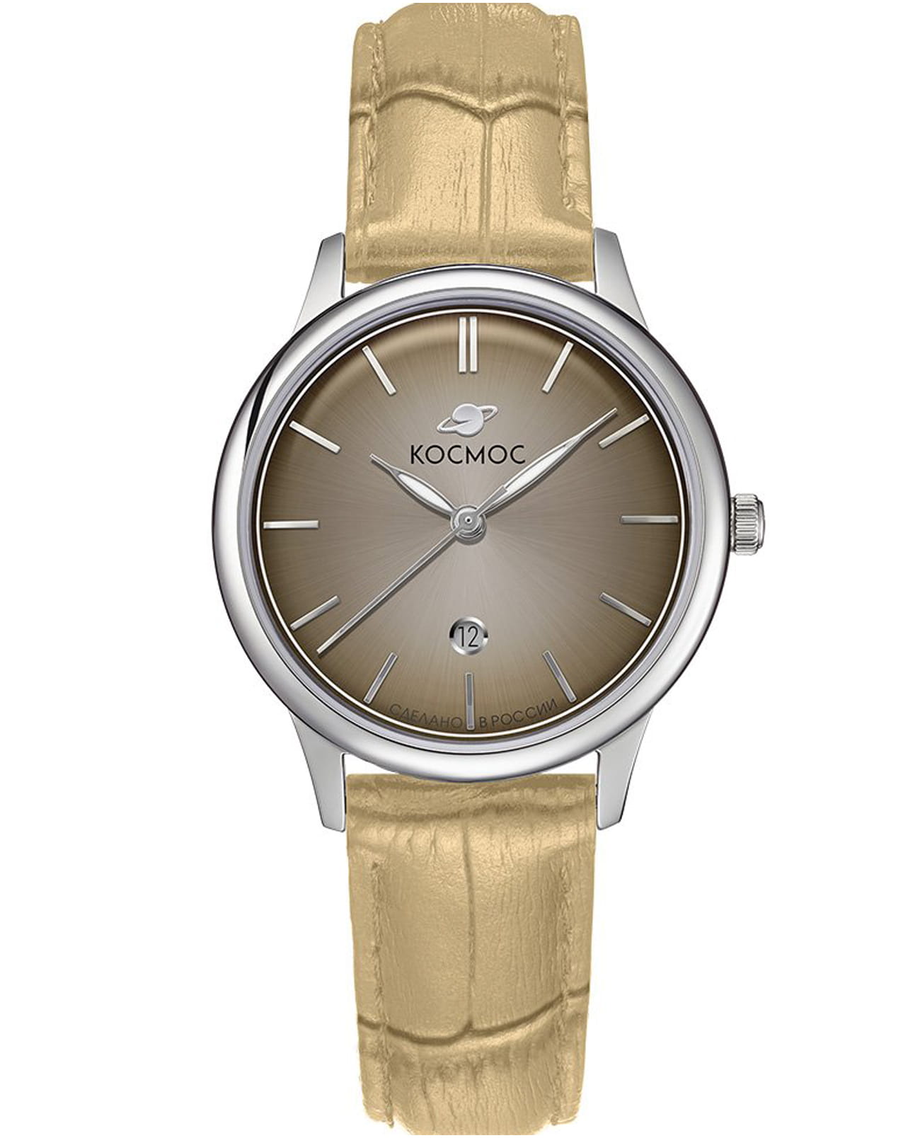 Женские наручные часы Космос Созвездие K 601.12.32 — это сочетание традиций часового искусства 60-70-х годов и футуристического дизайна, вдохновленного космическими исследованиями. Они не только служат напоминанием о прошлом, но и побуждают задуматься о будущем, позволяя наслаждаться качеством и смыслом, вложенными в каждую деталь. Полированный корпус часов выполнен в виде силуэта летающей тарелки благодаря выпуклым формам стекла и нижней части корпуса. Стальные ушки, которые напоминают опоры летающей тарелки, завершает общий образ. На задней крышке часов выгравирован фантазийный сюжет – космическая станция будущего. Название коллекции Созвездие – идеально отражает разнообразие моделей с яркими, но тщательно подобранными цветами. Бежевый циферблат выполнен в ретро стиле, с выгнутыми краями, что требует применения сложной производственной технологии. Такой дизайн был характерен для часов прошлых лет. Кончик секундной стрелки также изогнут, следуя форме циферблата. Выпуклый градиентный циферблат украшен шлифовкой в стиле солнечных лучей и ручными индексами, которые фиксируются на двух штифтах. Окошко даты обрамлено стальной рамкой, что добавляет часам утонченности и элегантности. Часовая и минутная стрелки, а также круг по краю циферблата, напоминающий ореол Земли, с люминесцентным покрытиемЛюминесцентное покрытиеПозволяет считывать показания времени в темноте. Производители наносят на стрелки, часовые индексы, безель или поверхность циферблата светонакопительный состав, дающий холодное свечение., которое светится в темноте, создавая завораживающий эффект. Форма минерального стеклаМинеральное стеклоМинеральное стекло представляет собой искусственно выращенный минерал кварца. Такое стекло отличается особой устойчивостью к повреждениям и царапинам. Уступает по некоторым качествам сапфировому стеклу. тщательно продумана: оно выгнуто как снаружи, так и изнутри. Такая конструкция исключает искажения изображения на циферблате, в отличие от обычного стекла. Ремешок модели сделан из натуральной кожи бежевого цвета. Заводная головка, застежка и ремешок украшены фирменным логотипом.