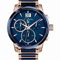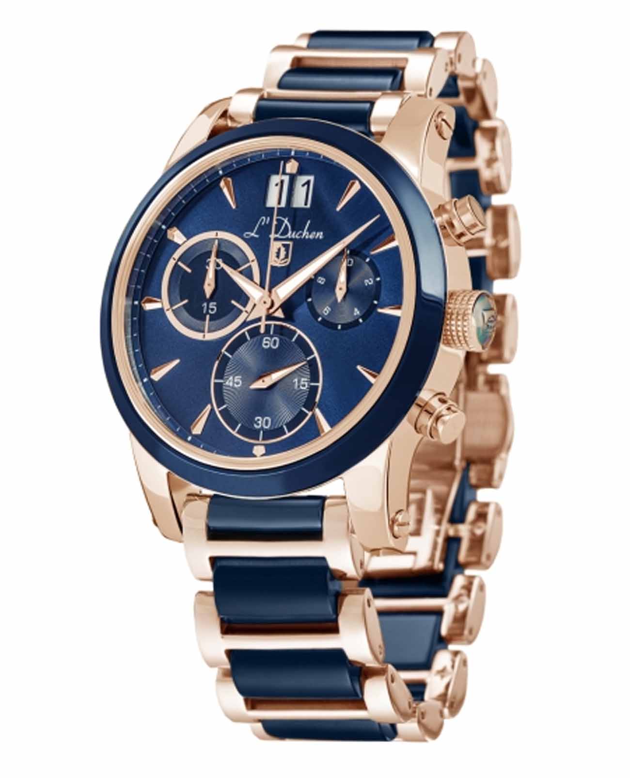 Мужские швейцарские часы-хронографХронографФункция позволяет измерять отрезки времени с особой точностью: часы, минуты, секунды. Верным признаком хронографа является наличие на циферблате 3 дополнительных окошек-счётчиков. L'Duchen Aerostat Chrono D 232.40.36, кварцевый механизм с высокой точностью. Сапфировое стеклоСапфировое стеклоПрочный и надёжный материал из кристалла сапфира синтетического происхождения, характеризующийся особой твёрдостью и устойчивостью к царапинам и повреждениям. устойчивое к появлению царапин, обладающее высокой прозрачностью. Корпус часов выполнен из нержавеющей стали с PVD-покрытиемPVDУльтратонкое покрытие наносится в технике вакуумного напыления, сочетает в себе нитрид титана особой прочности со слоем золота или оксида хрома. Несёт в себе декоративную или защитную функцию.. БезельБезельВнешний ободок, закрепляющий стекло. В спортивных часах так называется поворотное кольцо с делениями на циферблате, выполняет роль таймера – замеряет отрезки времени на шкале. Неподвижный безель – элемент декора. Однонаправленно вращающийся безель на дайверских часах позволяет фиксировать моменты погружения и выныривания на поверхность. из керамики. Стрелки с люминесцентным покрытиемЛюминесцентное покрытиеПозволяет считывать показания времени в темноте. Производители наносят на стрелки, часовые индексы, безель или поверхность циферблата светонакопительный состав, дающий холодное свечение.. Класс водозащиты: 100 метров, позволит плавать, нырять и заниматься другими водными видами спорта. Стальной браслет с PVD-покрытиемPVDУльтратонкое покрытие наносится в технике вакуумного напыления, сочетает в себе нитрид титана особой прочности со слоем золота или оксида хрома. Несёт в себе декоративную или защитную функцию. и керамическими вставками на застёжке «бабочка» с кнопкамиЗастёжка "бабочка"Такой вид застёжки дополняется предохранителями, помогающими избежать случайного раскрытия браслета. Обладают изящным исполнением. .