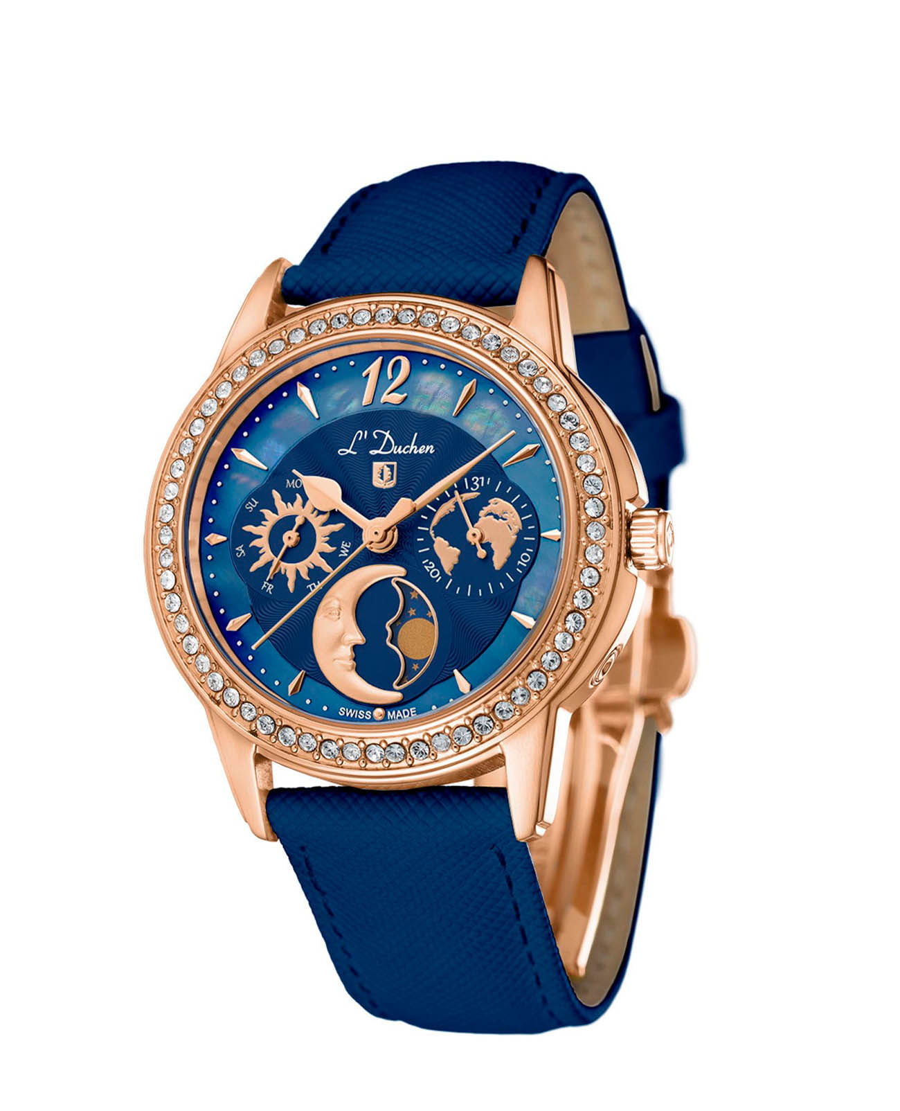 Женские кварцевые часы L'Duchen из коллекции Celeste — это изысканный аксессуар, сочетающий швейцарское качество и элегантный дизайн. Корпус круглой формы выполнен из нержавеющей стали 316L с PVD-покрытиемPVDУльтратонкое покрытие наносится в технике вакуумного напыления, сочетает в себе нитрид титана особой прочности со слоем золота или оксида хрома. Несёт в себе декоративную или защитную функцию. и защищён сапфировым стекломСапфировое стеклоПрочный и надёжный материал из кристалла сапфира синтетического происхождения, характеризующийся особой твёрдостью и устойчивостью к царапинам и повреждениям.. Циферблат синего цвета украшен кольцом из натурального перламутра по краю, придающим модели уникальность и благородное сияние. Метки на циферблате — в виде штрихов и арабской цифры 12. Индикаторы дня недели и даты вынесены на отдельные циферблаты, а указатель добавляет модели изысканности. Заводная головка снабжена защитой для повышения надёжности. Часы оснащены ремешком из натуральной кожи с раскладной застёжкойРаскладная застёжкаТакой тип застёжки используется только на браслетах из металла. Она никогда не раскрывается полностью, происходит разделение на 2 и более частей. Раскладывающая застёжка снизит вероятность потери часов к минимуму.. Водонепроницаемость 50 м позволяет использовать часы в повседневных условиях, защищая от случайных брызг и капель дождя.