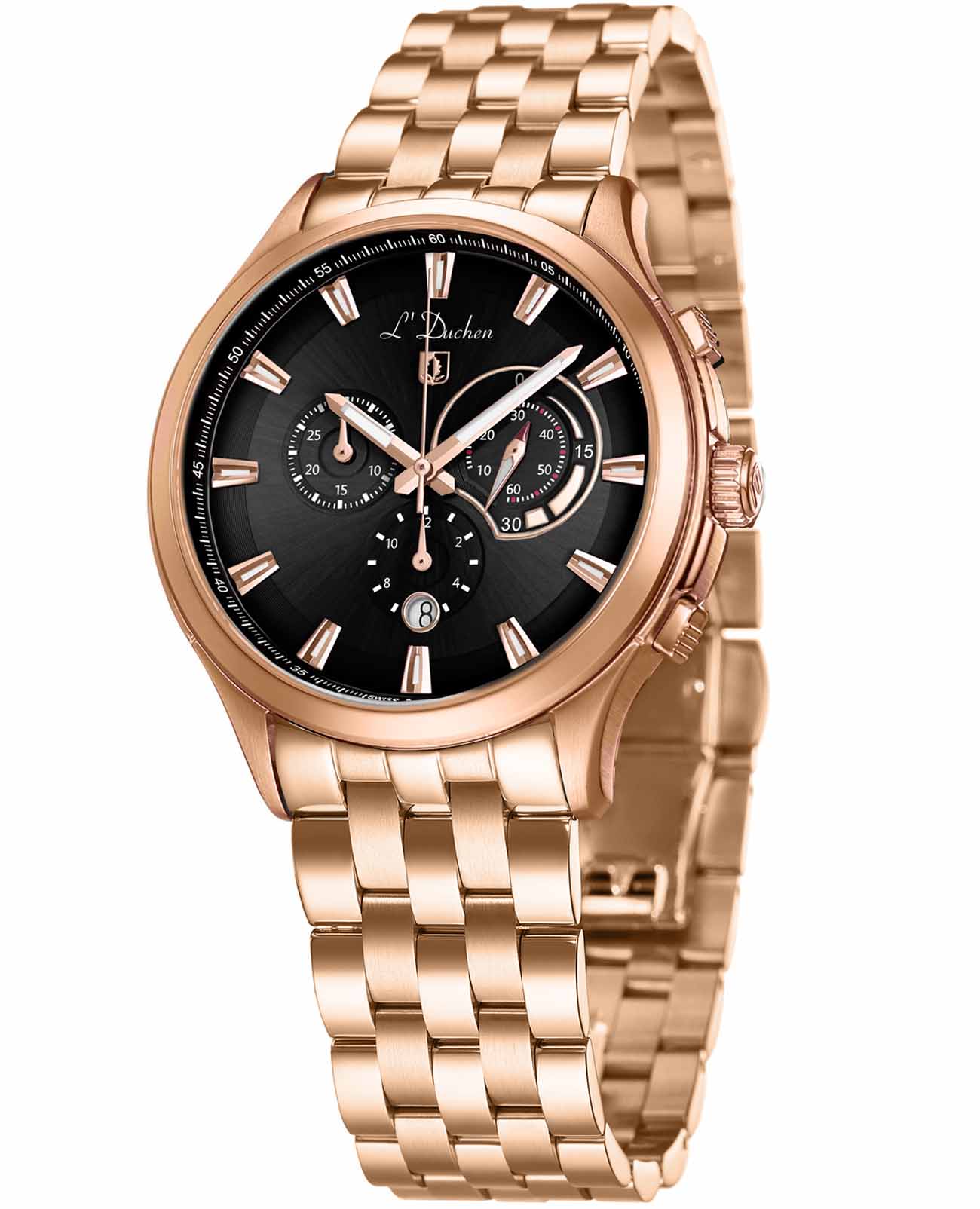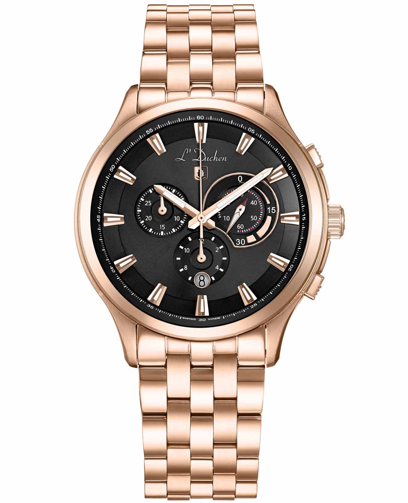 Мужские швейцарские часы- хронографХронографФункция позволяет измерять отрезки времени с особой точностью: часы, минуты, секунды. Верным признаком хронографа является наличие на циферблате 3 дополнительных окошек-счётчиков. L'Duchen Pilotage D 742.40.41, кварцевый механизм с высокой точностью. Сапфировое стеклоСапфировое стеклоПрочный и надёжный материал из кристалла сапфира синтетического происхождения, характеризующийся особой твёрдостью и устойчивостью к царапинам и повреждениям. устойчивое к появлению царапин, обладающее высокой прозрачностью. Корпус часов выполнен из нержавеющей стали с PVD-покрытиемPVDУльтратонкое покрытие наносится в технике вакуумного напыления, сочетает в себе нитрид титана особой прочности со слоем золота или оксида хрома. Несёт в себе декоративную или защитную функцию.. Стрелки с люминесцентным покрытиемЛюминесцентное покрытиеПозволяет считывать показания времени в темноте. Производители наносят на стрелки, часовые индексы, безель или поверхность циферблата светонакопительный состав, дающий холодное свечение.. Класс водозащиты: 100 метров, позволит плавать, нырять и заниматься другими водными видами спорта. Стальной браслет с PVD-покрытиемPVDУльтратонкое покрытие наносится в технике вакуумного напыления, сочетает в себе нитрид титана особой прочности со слоем золота или оксида хрома. Несёт в себе декоративную или защитную функцию. на застёжке «бабочка» с кнопкамиЗастёжка "бабочка"Такой вид застёжки дополняется предохранителями, помогающими избежать случайного раскрытия браслета. Обладают изящным исполнением. .
