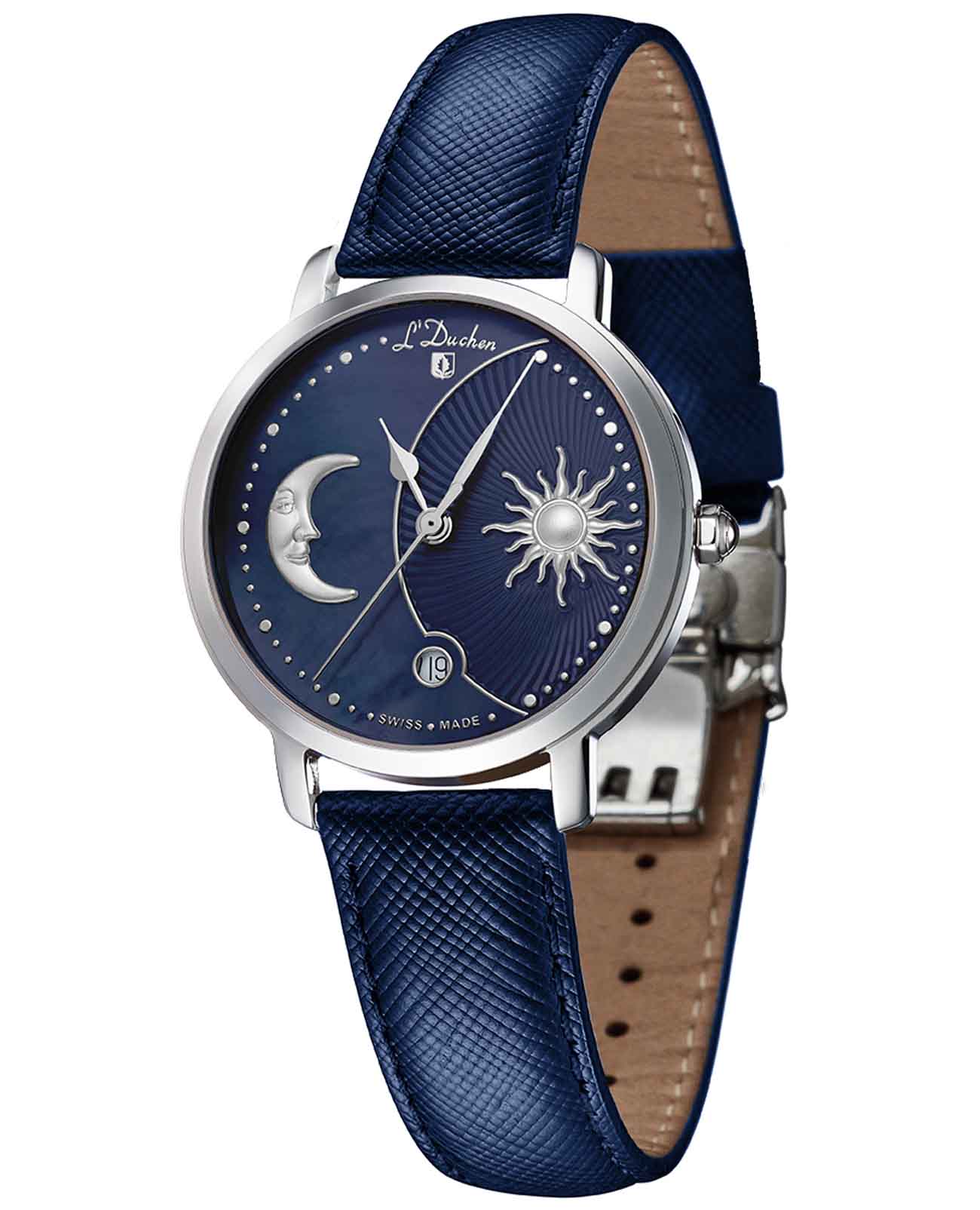 Женские швейцарские часы L'Duchen Day & Night D 781.13.37, кварцевый механизм с высокой точностью. Сапфировое стеклоСапфировое стеклоПрочный и надёжный материал из кристалла сапфира синтетического происхождения, характеризующийся особой твёрдостью и устойчивостью к царапинам и повреждениям. устойчивое к появлению царапин, обладающее высокой прозрачностью. Корпус часов выполнен из нержавеющей стали. Окошко даты находится в положении 6 часов. Класс водозащиты: 50 метров, позволит защитить корпус от случайных брызг или капель дождя. Кожаный ремешок на застёжке «бабочка» с кнопкамиЗастёжка "бабочка"Такой вид застёжки дополняется предохранителями, помогающими избежать случайного раскрытия браслета. Обладают изящным исполнением. .