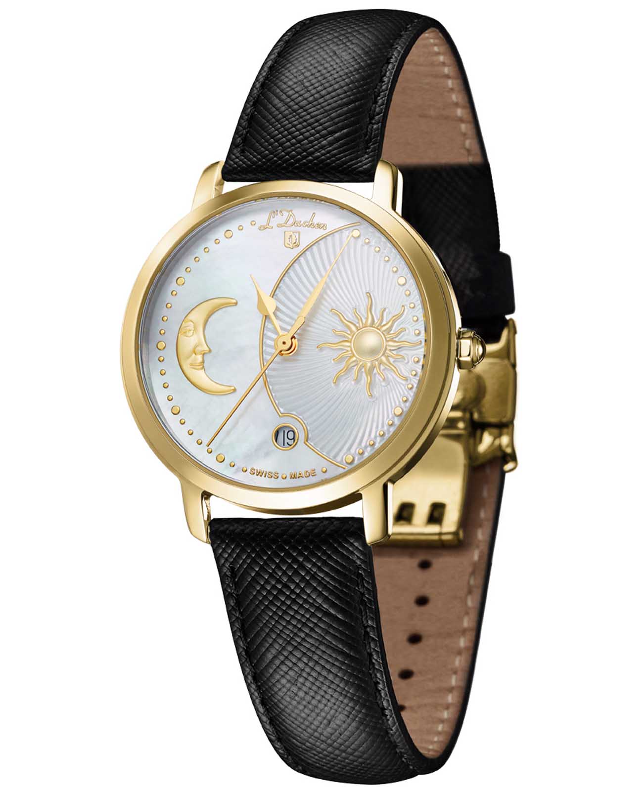 Женские швейцарские часы L'Duchen Day & Night D 781.21.33, кварцевый механизм с высокой точностью. Сапфировое стеклоСапфировое стеклоПрочный и надёжный материал из кристалла сапфира синтетического происхождения, характеризующийся особой твёрдостью и устойчивостью к царапинам и повреждениям. устойчивое к появлению царапин, обладающее высокой прозрачностью. Корпус часов выполнен из нержавеющей стали с PVD-покрытиемPVDУльтратонкое покрытие наносится в технике вакуумного напыления, сочетает в себе нитрид титана особой прочности со слоем золота или оксида хрома. Несёт в себе декоративную или защитную функцию.. Окошко даты находится в положении 6 часов. Класс водозащиты: 50 метров, позволит защитить корпус от случайных брызг или капель дождя. Кожаный ремешок на застёжке «бабочка» с кнопкамиЗастёжка "бабочка"Такой вид застёжки дополняется предохранителями, помогающими избежать случайного раскрытия браслета. Обладают изящным исполнением. .