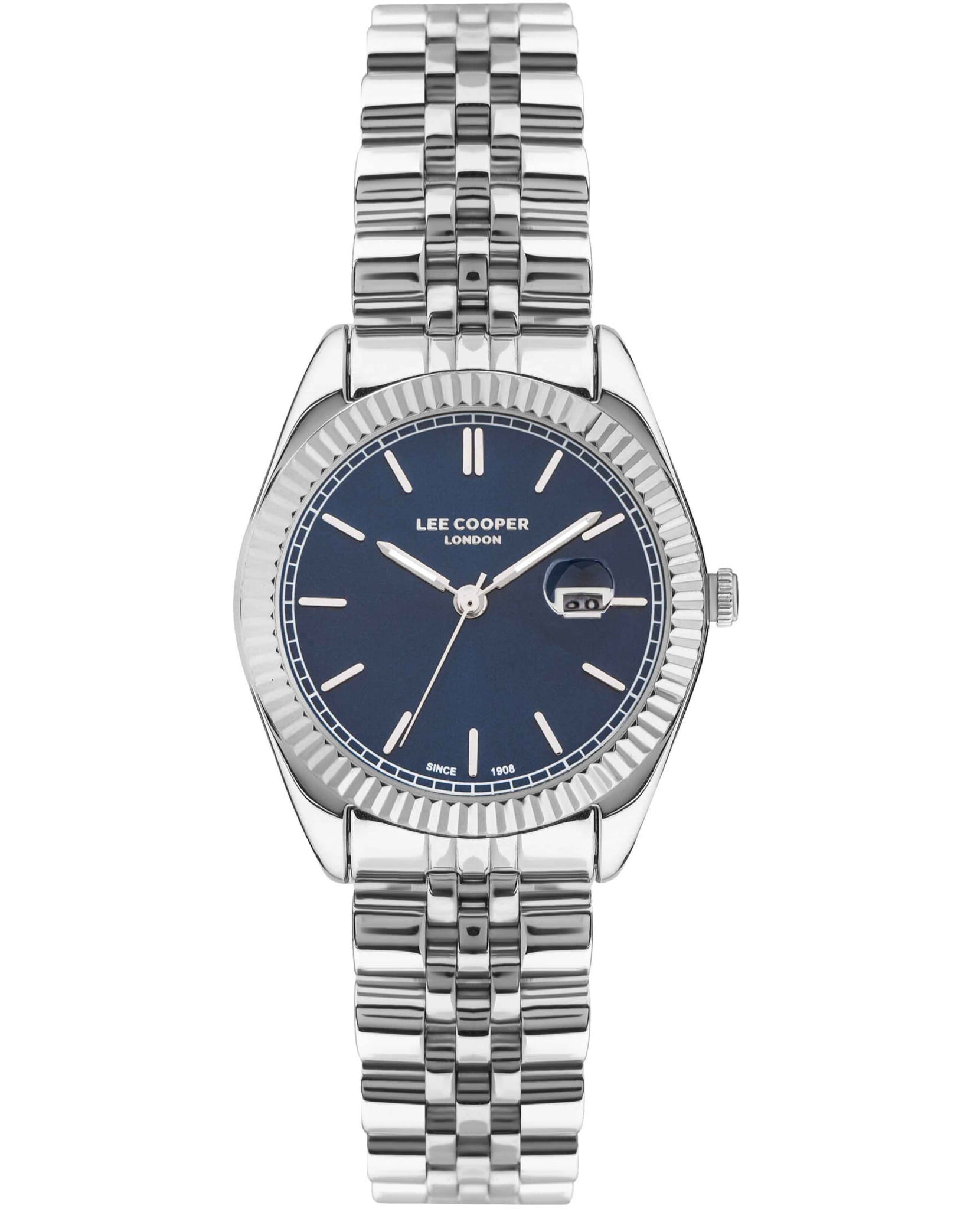 Женские наручные часы Lee Cooper LC07326.390 — это стильное сочетание классического дизайна и современных деталей. Круглый корпус диаметром 32 мм выполнен из нержавеющей стали. Циферблат оформлен в аналоговом формате с центральной секундной стрелкой и окошком даты. Защиту обеспечивает прочное минеральное стеклоМинеральное стеклоМинеральное стекло представляет собой искусственно выращенный минерал кварца. Такое стекло отличается особой устойчивостью к повреждениям и царапинам. Уступает по некоторым качествам сапфировому стеклу.. Часы работают на кварцевом механизме и обладают водозащитой 30 метров, что делает их подходящими для повседневного использования. Браслет из нержавеющей стали с раскладной застёжкойРаскладная застёжкаТакой тип застёжки используется только на браслетах из металла. Она никогда не раскрывается полностью, происходит разделение на 2 и более частей. Раскладывающая застёжка снизит вероятность потери часов к минимуму. гарантирует комфортное ношение и надёжную фиксацию на запястье.