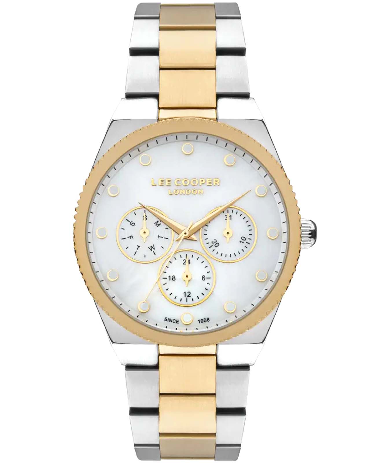 Женские наручные часы Lee Cooper LC07452.220 — это элегантная модель с утончённым дизайном. Корпус диаметром 38 мм выполнен из нержавеющей стали, что придаёт часам изысканный вид. Циферблат украшен изящными метками и стрелками обеспечивая удобное считывание времени. Циферблат защищён минеральным стекломМинеральное стеклоМинеральное стекло представляет собой искусственно выращенный минерал кварца. Такое стекло отличается особой устойчивостью к повреждениям и царапинам. Уступает по некоторым качествам сапфировому стеклу., устойчивым к царапинам. Часы работают на кварцевом механизме, обеспечивая точность хода. Браслет из нержавеющей стали с раскладной застёжкойРаскладная застёжкаТакой тип застёжки используется только на браслетах из металла. Она никогда не раскрывается полностью, происходит разделение на 2 и более частей. Раскладывающая застёжка снизит вероятность потери часов к минимуму. гарантирует комфортное ношение и надёжную фиксацию на запястье. Водозащита 30 метров защищает часы от случайных брызг и дождя, делая их подходящими для повседневного использования. БезельБезельВнешний ободок, закрепляющий стекло. В спортивных часах так называется поворотное кольцо с делениями на циферблате, выполняет роль таймера – замеряет отрезки времени на шкале. Неподвижный безель – элемент декора. Однонаправленно вращающийся безель на дайверских часах позволяет фиксировать моменты погружения и выныривания на поверхность. с IP-покрытиемIP-покрытиеМетод ионного напыления. Демонстрирует повышенную устойчивость к истиранию, окислению и химическим веществам. Под воздействием высокого давления и температуры около 1500°C молекулы металла надёжно соединяются с частицами корпуса часов..