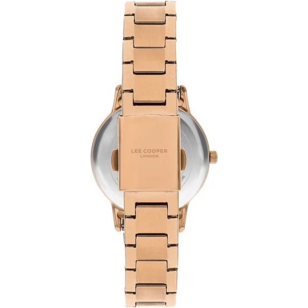 Женские наручные часы Lee Cooper LC07501.410 — это элегантная модель с утончённым дизайном. Корпус диаметром 34 мм выполнен из суперметалла с IP-покрытиемIP-покрытиеМетод ионного напыления. Демонстрирует повышенную устойчивость к истиранию, окислению и химическим веществам. Под воздействием высокого давления и температуры около 1500°C молекулы металла надёжно соединяются с частицами корпуса часов., что придаёт часам изысканный вид. Золотистый циферблат украшен изящными стрелками и вставками из циркония в виде меток, обеспечивая удобное считывание времени. Циферблат защищён минеральным стекломМинеральное стеклоМинеральное стекло представляет собой искусственно выращенный минерал кварца. Такое стекло отличается особой устойчивостью к повреждениям и царапинам. Уступает по некоторым качествам сапфировому стеклу., устойчивым к царапинам. Часы работают на кварцевом механизме, обеспечивая точность хода. Браслет из нержавеющей стали с раскладной застёжкойРаскладная застёжкаТакой тип застёжки используется только на браслетах из металла. Она никогда не раскрывается полностью, происходит разделение на 2 и более частей. Раскладывающая застёжка снизит вероятность потери часов к минимуму. гарантирует комфортное ношение и надёжную фиксацию на запястье. Водозащита 30 метров защищает часы от случайных брызг и дождя, делая их подходящими для повседневного использования.