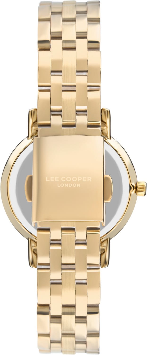 Женские часы Lee Cooper LC07503.120 — это стильное сочетание элегантности и современного дизайна. Круглый корпус диаметром 34 мм выполнен из суперметалла с IP-покрытиемIP-покрытиеМетод ионного напыления. Демонстрирует повышенную устойчивость к истиранию, окислению и химическим веществам. Под воздействием высокого давления и температуры около 1500°C молекулы металла надёжно соединяются с частицами корпуса часов. золотого цвета, что придает модели особый блеск. Белый циферблат защищен минеральным стекломМинеральное стеклоМинеральное стекло представляет собой искусственно выращенный минерал кварца. Такое стекло отличается особой устойчивостью к повреждениям и царапинам. Уступает по некоторым качествам сапфировому стеклу., обеспечивающим устойчивость к царапинам. Метки в виде штрихов. Часы оснащены надежным кварцевым механизмом, а металлический браслет с IP-покрытиемIP-покрытиеМетод ионного напыления. Демонстрирует повышенную устойчивость к истиранию, окислению и химическим веществам. Под воздействием высокого давления и температуры около 1500°C молекулы металла надёжно соединяются с частицами корпуса часов. на раскладной застёжкеРаскладная застёжкаТакой тип застёжки используется только на браслетах из металла. Она никогда не раскрывается полностью, происходит разделение на 2 и более частей. Раскладывающая застёжка снизит вероятность потери часов к минимуму. гарантирует комфортную посадку на запястье. Водозащита 30 метров защищает модель от случайных брызг и дождя. Lee Cooper — отличный выбор для тех, кто ценит утонченность и качество.