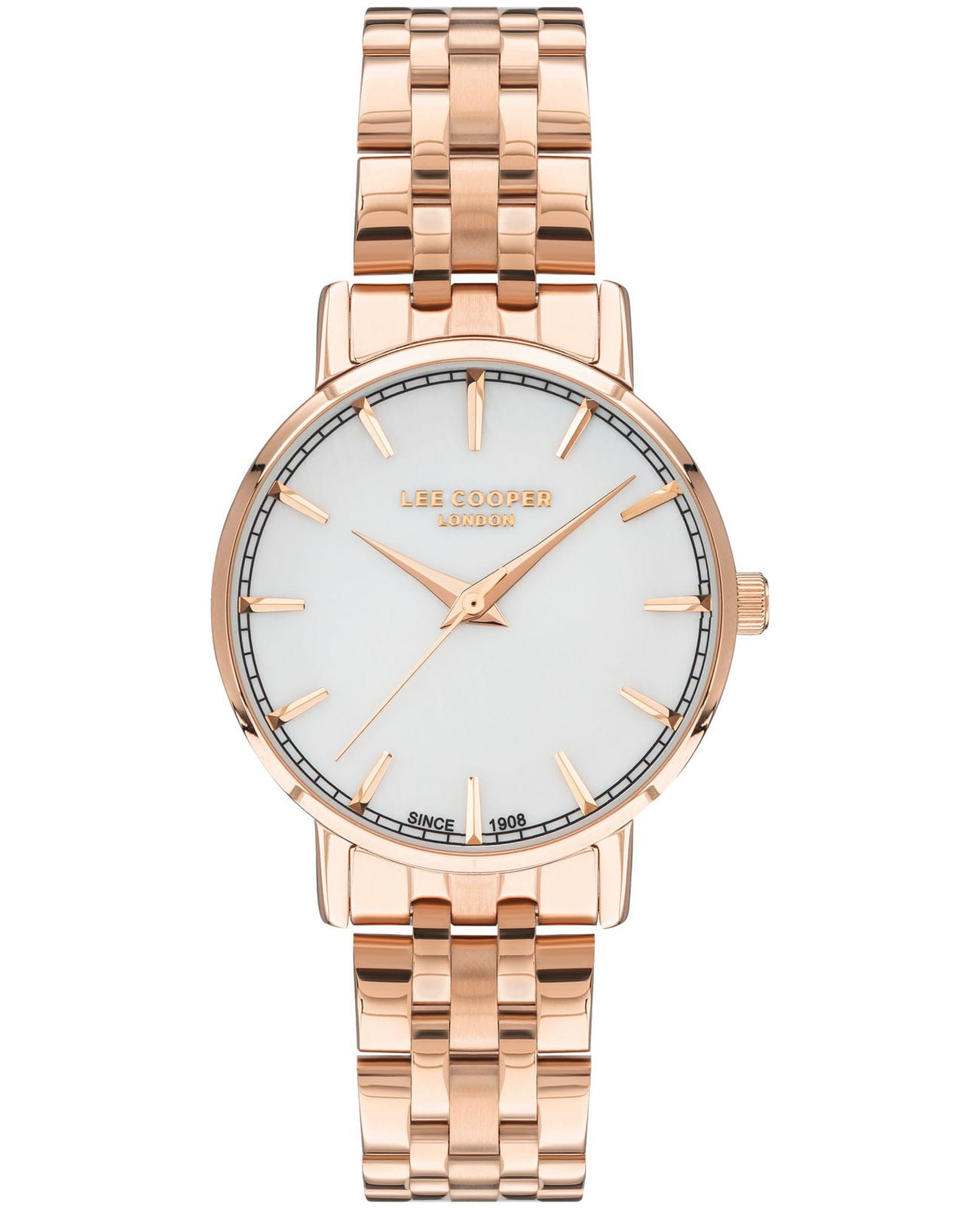 Женские часы Lee Cooper LC07503.420 — это стильное сочетание элегантности и современного дизайна. Круглый корпус диаметром 34 мм выполнен из суперметалла с IP-покрытиемIP-покрытиеМетод ионного напыления. Демонстрирует повышенную устойчивость к истиранию, окислению и химическим веществам. Под воздействием высокого давления и температуры около 1500°C молекулы металла надёжно соединяются с частицами корпуса часов. цвета розового золота, что придает модели особый блеск. Белый циферблат защищен минеральным стекломМинеральное стеклоМинеральное стекло представляет собой искусственно выращенный минерал кварца. Такое стекло отличается особой устойчивостью к повреждениям и царапинам. Уступает по некоторым качествам сапфировому стеклу., обеспечивающим устойчивость к царапинам. Метки в виде штрихов. Часы оснащены надежным кварцевым механизмом, а металлический браслет с IP-покрытиемIP-покрытиеМетод ионного напыления. Демонстрирует повышенную устойчивость к истиранию, окислению и химическим веществам. Под воздействием высокого давления и температуры около 1500°C молекулы металла надёжно соединяются с частицами корпуса часов. на раскладной застёжкеРаскладная застёжкаТакой тип застёжки используется только на браслетах из металла. Она никогда не раскрывается полностью, происходит разделение на 2 и более частей. Раскладывающая застёжка снизит вероятность потери часов к минимуму. гарантирует комфортную посадку на запястье. Водозащита 30 метров защищает модель от случайных брызг и дождя. Lee Cooper — отличный выбор для тех, кто ценит утонченность и качество.