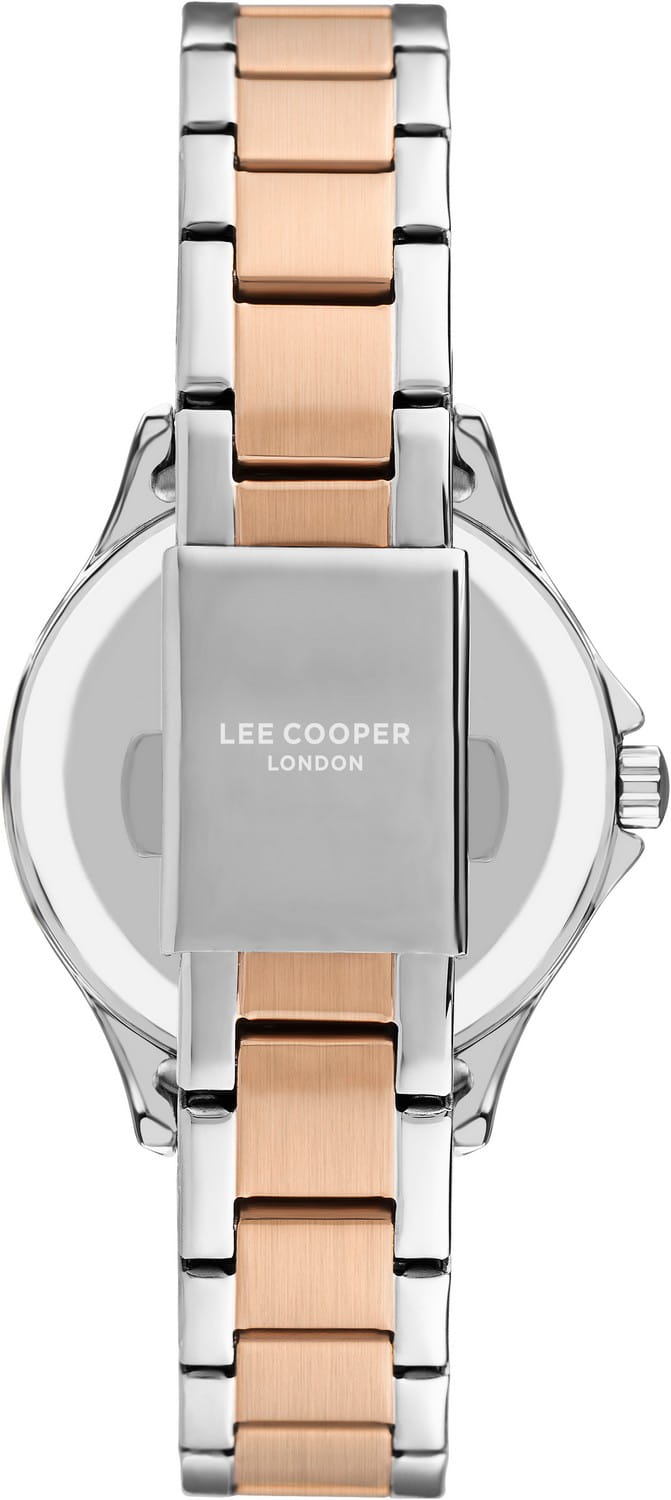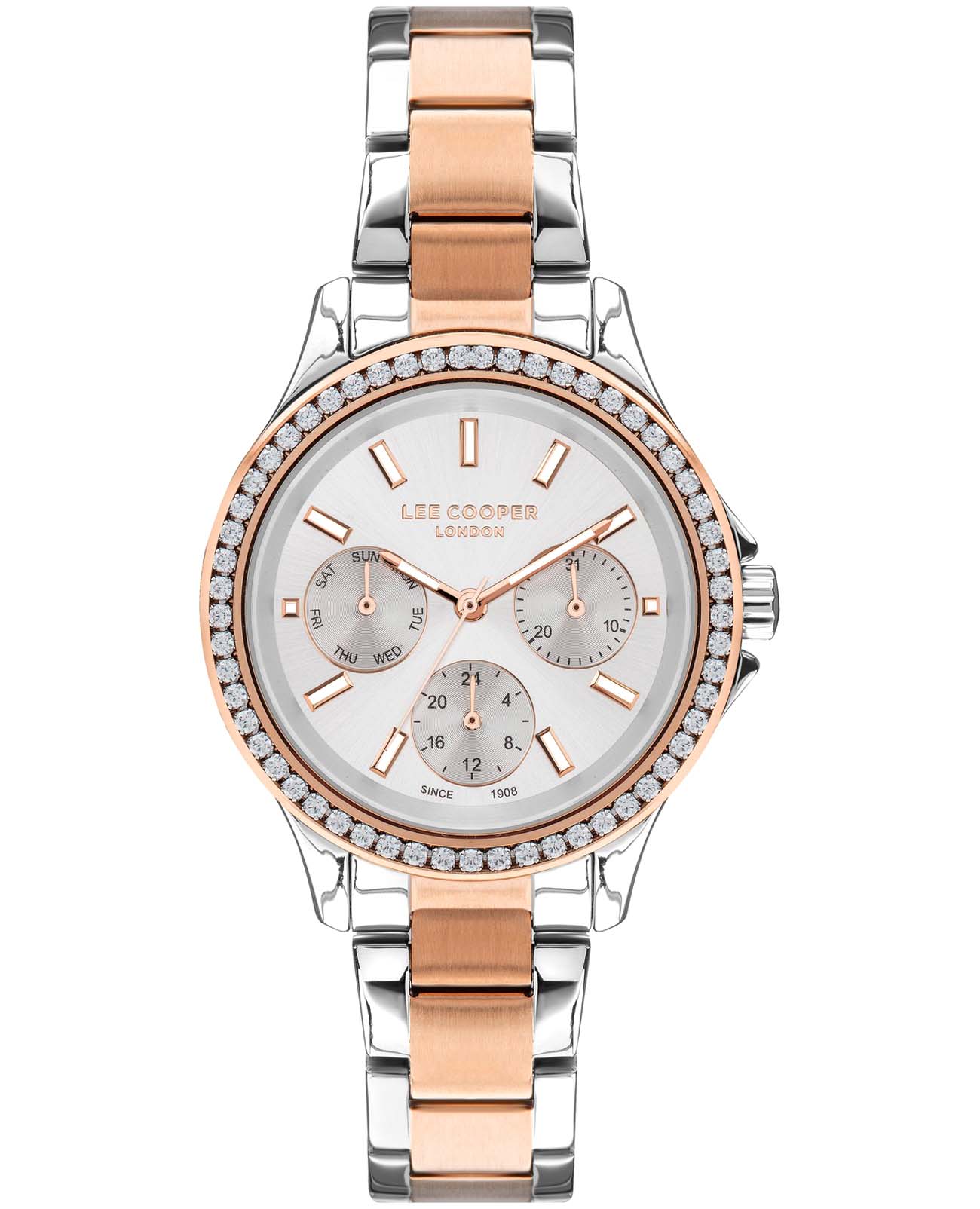 Женские часы Lee Cooper LC07512.530 — это стильное сочетание элегантности и современного дизайна. Круглый корпус диаметром 36 мм выполнен из суперметалла, а неподвижный безельБезельВнешний ободок, закрепляющий стекло. В спортивных часах так называется поворотное кольцо с делениями на циферблате, выполняет роль таймера – замеряет отрезки времени на шкале. Неподвижный безель – элемент декора. Однонаправленно вращающийся безель на дайверских часах позволяет фиксировать моменты погружения и выныривания на поверхность. с IP-покрытиемIP-покрытиеМетод ионного напыления. Демонстрирует повышенную устойчивость к истиранию, окислению и химическим веществам. Под воздействием высокого давления и температуры около 1500°C молекулы металла надёжно соединяются с частицами корпуса часов. цвета розового золота украшен цирконами, придающими модели особый блеск. Серебристый циферблат защищен минеральным стекломМинеральное стеклоМинеральное стекло представляет собой искусственно выращенный минерал кварца. Такое стекло отличается особой устойчивостью к повреждениям и царапинам. Уступает по некоторым качествам сапфировому стеклу., обеспечивающим устойчивость к царапинам. Метки в виде штрихов. Часы оснащены надежным кварцевым механизмом, а металлический браслет с частичным IP-покрытиемIP-покрытиеМетод ионного напыления. Демонстрирует повышенную устойчивость к истиранию, окислению и химическим веществам. Под воздействием высокого давления и температуры около 1500°C молекулы металла надёжно соединяются с частицами корпуса часов. на раскладной застёжкеРаскладная застёжкаТакой тип застёжки используется только на браслетах из металла. Она никогда не раскрывается полностью, происходит разделение на 2 и более частей. Раскладывающая застёжка снизит вероятность потери часов к минимуму. гарантирует комфортную посадку на запястье. Мультифункциональная модель с индикацией даты, дня недели, с дополнительным 24-х часовым индикатором. Стрелки и метки с люминесцентным покрытиемЛюминесцентное покрытиеПозволяет считывать показания времени в темноте. Производители наносят на стрелки, часовые индексы, безель или поверхность циферблата светонакопительный состав, дающий холодное свечение. позволяют легко считывать время даже в условиях недостаточного освещения. Водозащита 30 метров защищает модель от случайных брызг и дождя. Lee Cooper  — отличный выбор для тех, кто ценит утонченность и качество.