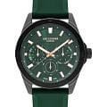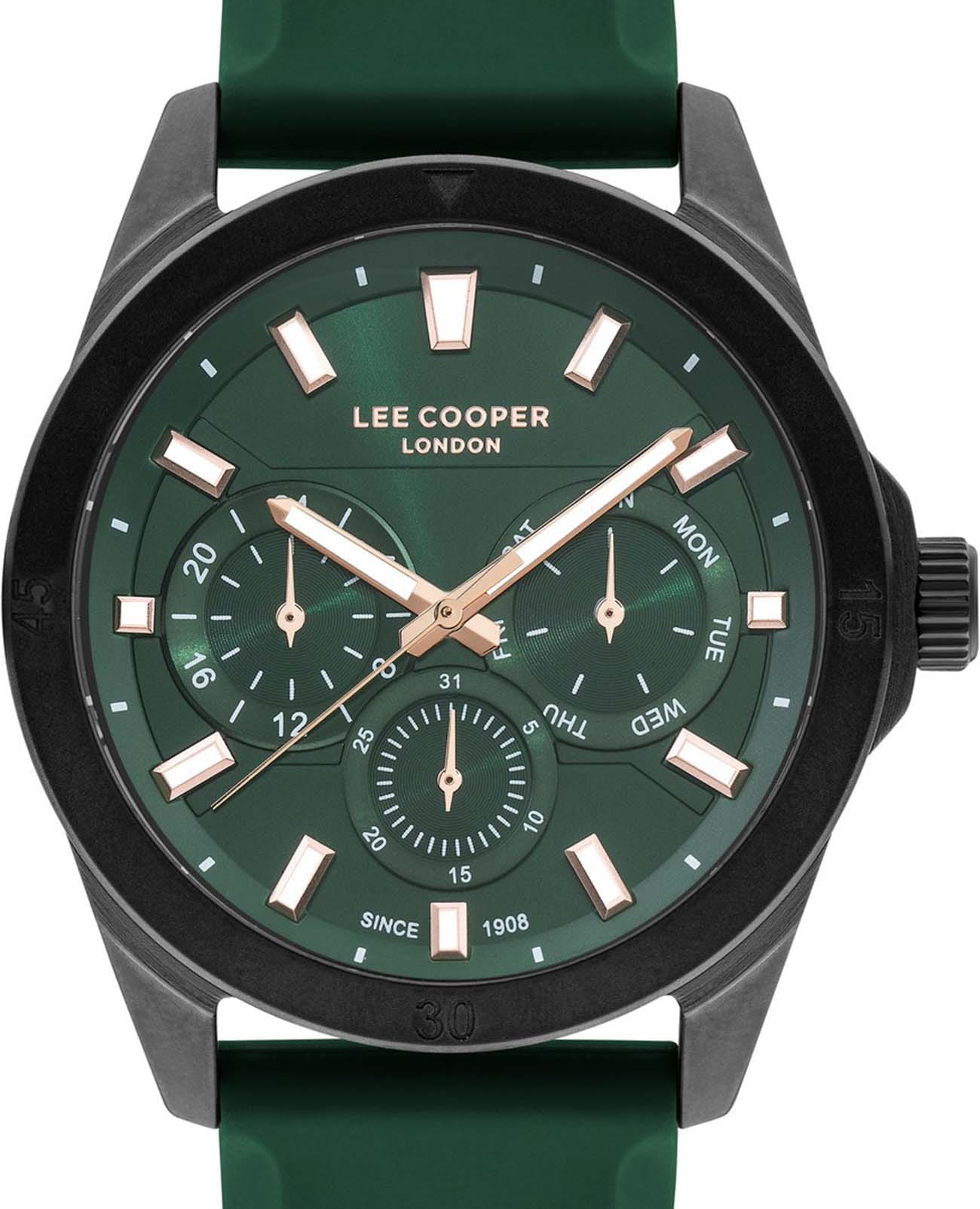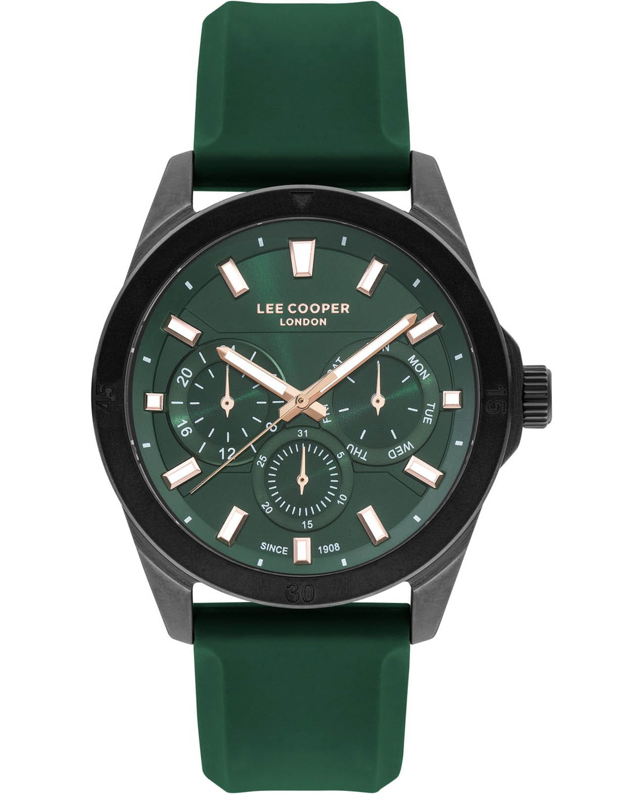 Мужские кварцевые часы Lee Cooper LC07626.677 — это мультифункциональный аксессуар с лаконичным дизайном. Корпус диаметром 46 мм выполнен из суперметалла с IP-покрытиемIP-покрытиеМетод ионного напыления. Демонстрирует повышенную устойчивость к истиранию, окислению и химическим веществам. Под воздействием высокого давления и температуры около 1500°C молекулы металла надёжно соединяются с частицами корпуса часов. в двухцветном исполнении — сером и чёрном. Циферблат зелёного цвета оформлен индексами и дополнен окошками даты, дня недели и 24-часового индикатора. Циферблат защищён минеральным стекломМинеральное стеклоМинеральное стекло представляет собой искусственно выращенный минерал кварца. Такое стекло отличается особой устойчивостью к повреждениям и царапинам. Уступает по некоторым качествам сапфировому стеклу.. Стрелки и метки с люминесцентным покрытиемЛюминесцентное покрытиеПозволяет считывать показания времени в темноте. Производители наносят на стрелки, часовые индексы, безель или поверхность циферблата светонакопительный состав, дающий холодное свечение., обеспечивающим хорошую читаемость в темноте. Часы оснащены каучуковым ремешком зелёного цвета с классической пряжкой. Водонепроницаемость 50 м позволяет использовать часы для плавания и повседневного ношения. Универсальный выбор для тех, кто ценит функциональность и надёжность.