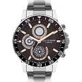 Мужские наручные часы Lee Cooper LC07636.370 оснащены кварцевым механизмом, обеспечивающий высокую точность хода и надежность. Корпус часов выполнен из суперметалла серебристого цвета, что делает их устойчивыми к внешним воздействиям и придает благородный вид. Элегантный безельБезельВнешний ободок, закрепляющий стекло. В спортивных часах так называется поворотное кольцо с делениями на циферблате, выполняет роль таймера – замеряет отрезки времени на шкале. Неподвижный безель – элемент декора. Однонаправленно вращающийся безель на дайверских часах позволяет фиксировать моменты погружения и выныривания на поверхность. с IP-покрытиемIP-покрытиеМетод ионного напыления. Демонстрирует повышенную устойчивость к истиранию, окислению и химическим веществам. Под воздействием высокого давления и температуры около 1500°C молекулы металла надёжно соединяются с частицами корпуса часов.. Циферблат черного цвета украшен классическими стрелками с люминесцентным покрытиемЛюминесцентное покрытиеПозволяет считывать показания времени в темноте. Производители наносят на стрелки, часовые индексы, безель или поверхность циферблата светонакопительный состав, дающий холодное свечение., гармонично дополняющим общий дизайн модели. Для защиты циферблата используется минеральное стеклоМинеральное стеклоМинеральное стекло представляет собой искусственно выращенный минерал кварца. Такое стекло отличается особой устойчивостью к повреждениям и царапинам. Уступает по некоторым качествам сапфировому стеклу., устойчивое к царапинам и механическим повреждениям. Корпус имеет круглую форму диаметром 45 мм, что делает часы заметными и подходящими. Браслет из стали оснащен раскладной застёжкойРаскладная застёжкаТакой тип застёжки используется только на браслетах из металла. Она никогда не раскрывается полностью, происходит разделение на 2 и более частей. Раскладывающая застёжка снизит вероятность потери часов к минимуму., обеспечивающим комфортное и безопасное ношение. Вынесенный циферблат с 24-х часовым указателем времени, индикацией даты и дня недели. Часы обладают водонепроницаемостью до 50 метров (5 АТМ), что позволяет использовать их в повседневной жизни, включая контакт с водой при мытье рук или дожде. Эти часы станут идеальным выбором для мужчин, ценящих стиль, качество и функциональность.