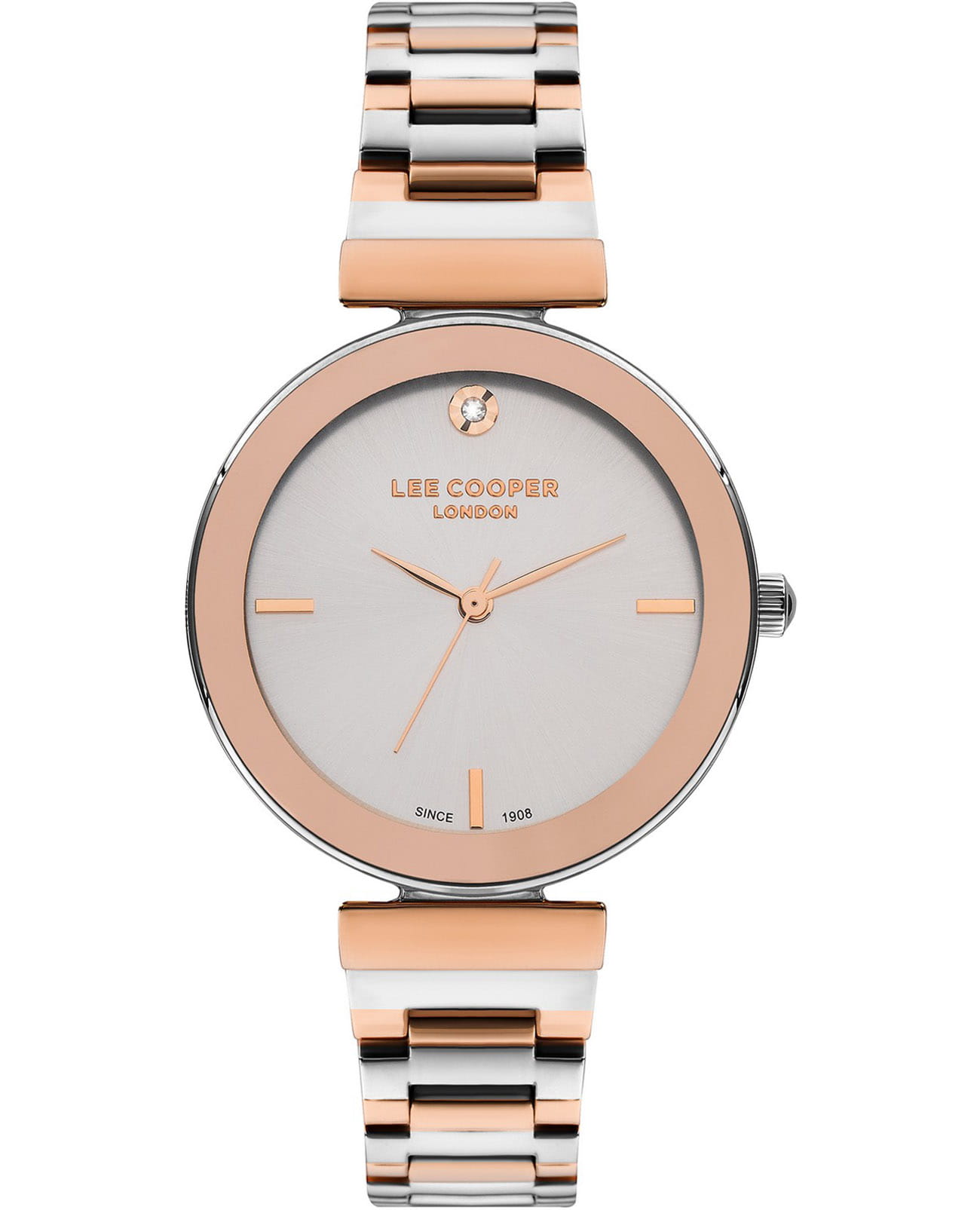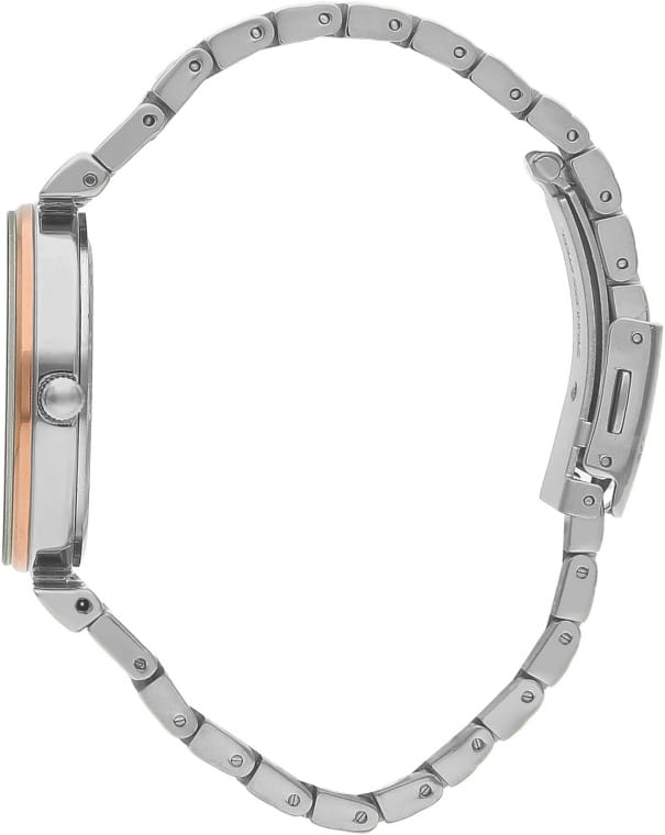 Женские часы Lee Cooper LC07711.530 — это стильное сочетание элегантности и современного дизайна. Круглый корпус диаметром 35 мм выполнен из суперметалла серебристого цвета. Неподвижный безельБезельВнешний ободок, закрепляющий стекло. В спортивных часах так называется поворотное кольцо с делениями на циферблате, выполняет роль таймера – замеряет отрезки времени на шкале. Неподвижный безель – элемент декора. Однонаправленно вращающийся безель на дайверских часах позволяет фиксировать моменты погружения и выныривания на поверхность. с IP-покрытиемIP-покрытиеМетод ионного напыления. Демонстрирует повышенную устойчивость к истиранию, окислению и химическим веществам. Под воздействием высокого давления и температуры около 1500°C молекулы металла надёжно соединяются с частицами корпуса часов. золотого цвета придает модели особый блеск. Изысканный циферблат защищен минеральным стекломМинеральное стеклоМинеральное стекло представляет собой искусственно выращенный минерал кварца. Такое стекло отличается особой устойчивостью к повреждениям и царапинам. Уступает по некоторым качествам сапфировому стеклу., обеспечивающим устойчивость к царапинам. Метки в виде штрихов. Часы оснащены надежным кварцевым механизмом, а стальной браслет с частичным IP-покрытиемIP-покрытиеМетод ионного напыления. Демонстрирует повышенную устойчивость к истиранию, окислению и химическим веществам. Под воздействием высокого давления и температуры около 1500°C молекулы металла надёжно соединяются с частицами корпуса часов. на раскладной застёжкеРаскладная застёжкаТакой тип застёжки используется только на браслетах из металла. Она никогда не раскрывается полностью, происходит разделение на 2 и более частей. Раскладывающая застёжка снизит вероятность потери часов к минимуму. гарантирует комфортную посадку на запястье. Водозащита 30 метров защищает модель от случайных брызг и дождя. Lee Cooper — отличный выбор для тех, кто ценит утонченность и качество.