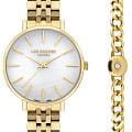 Женские часы Lee Cooper LC07857.120 — это стильное сочетание элегантности и современного дизайна. Изящный круглый корпус диаметром 34 мм выполнен из суперметалла с IP-покрытиемIP-покрытиеМетод ионного напыления. Демонстрирует повышенную устойчивость к истиранию, окислению и химическим веществам. Под воздействием высокого давления и температуры около 1500°C молекулы металла надёжно соединяются с частицами корпуса часов. золотого цвета, что придает модели особый блеск. Перламутровый циферблат защищен минеральным стекломМинеральное стеклоМинеральное стекло представляет собой искусственно выращенный минерал кварца. Такое стекло отличается особой устойчивостью к повреждениям и царапинам. Уступает по некоторым качествам сапфировому стеклу., обеспечивающим устойчивость к царапинам. Метки в виде штрихов. Часы оснащены надежным кварцевым механизмом, а стальной браслет с IP-покрытиемIP-покрытиеМетод ионного напыления. Демонстрирует повышенную устойчивость к истиранию, окислению и химическим веществам. Под воздействием высокого давления и температуры около 1500°C молекулы металла надёжно соединяются с частицами корпуса часов. на раскладной застёжкеРаскладная застёжкаТакой тип застёжки используется только на браслетах из металла. Она никогда не раскрывается полностью, происходит разделение на 2 и более частей. Раскладывающая застёжка снизит вероятность потери часов к минимуму. гарантирует комфортную посадку на запястье. Водозащита 30 метров защищает модель от случайных брызг и дождя. В комплекте к часам идет дополнительный браслет в цвет часов. Lee Cooper  — отличный выбор для тех, кто ценит утонченность и качество.