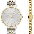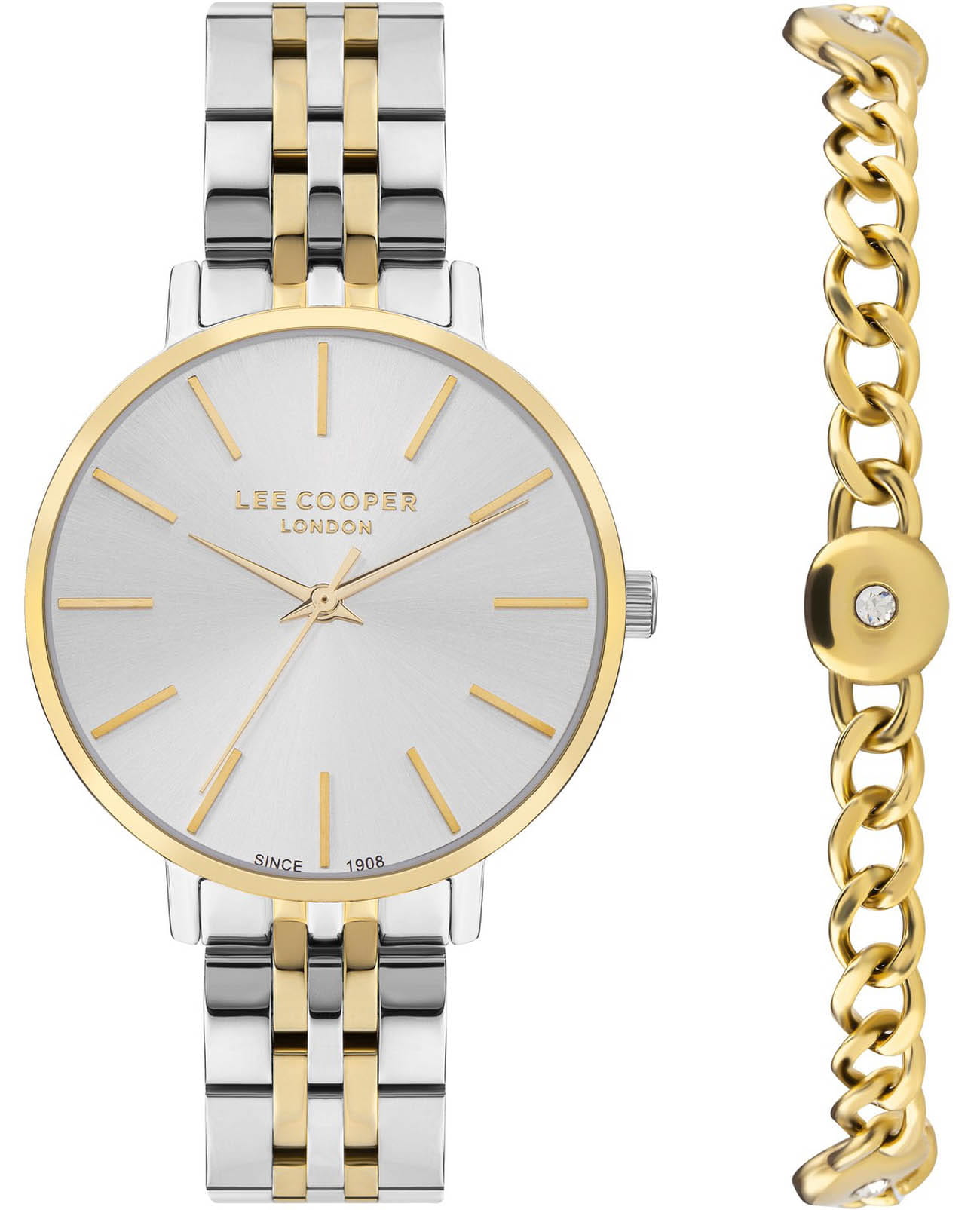 Женские часы Lee Cooper LC07857.230 — это стильное сочетание элегантности и современного дизайна. Изящный круглый корпус диаметром 34 мм выполнен из суперметалла с безелемБезельВнешний ободок, закрепляющий стекло. В спортивных часах так называется поворотное кольцо с делениями на циферблате, выполняет роль таймера – замеряет отрезки времени на шкале. Неподвижный безель – элемент декора. Однонаправленно вращающийся безель на дайверских часах позволяет фиксировать моменты погружения и выныривания на поверхность. с IP-покрытиемIP-покрытиеМетод ионного напыления. Демонстрирует повышенную устойчивость к истиранию, окислению и химическим веществам. Под воздействием высокого давления и температуры около 1500°C молекулы металла надёжно соединяются с частицами корпуса часов. золотого цвета, что придает модели особый блеск. Серебристый циферблат защищен минеральным стекломМинеральное стеклоМинеральное стекло представляет собой искусственно выращенный минерал кварца. Такое стекло отличается особой устойчивостью к повреждениям и царапинам. Уступает по некоторым качествам сапфировому стеклу., обеспечивающим устойчивость к царапинам. Метки в виде штрихов. Часы оснащены надежным кварцевым механизмом, а стальной браслет с частичным IP-покрытиемIP-покрытиеМетод ионного напыления. Демонстрирует повышенную устойчивость к истиранию, окислению и химическим веществам. Под воздействием высокого давления и температуры около 1500°C молекулы металла надёжно соединяются с частицами корпуса часов. на раскладной застёжкеРаскладная застёжкаТакой тип застёжки используется только на браслетах из металла. Она никогда не раскрывается полностью, происходит разделение на 2 и более частей. Раскладывающая застёжка снизит вероятность потери часов к минимуму. гарантирует комфортную посадку на запястье. Водозащита 30 метров защищает модель от случайных брызг и дождя. В комплекте к часам идет дополнительный браслет. Lee Cooper  — отличный выбор для тех, кто ценит утонченность и качество.