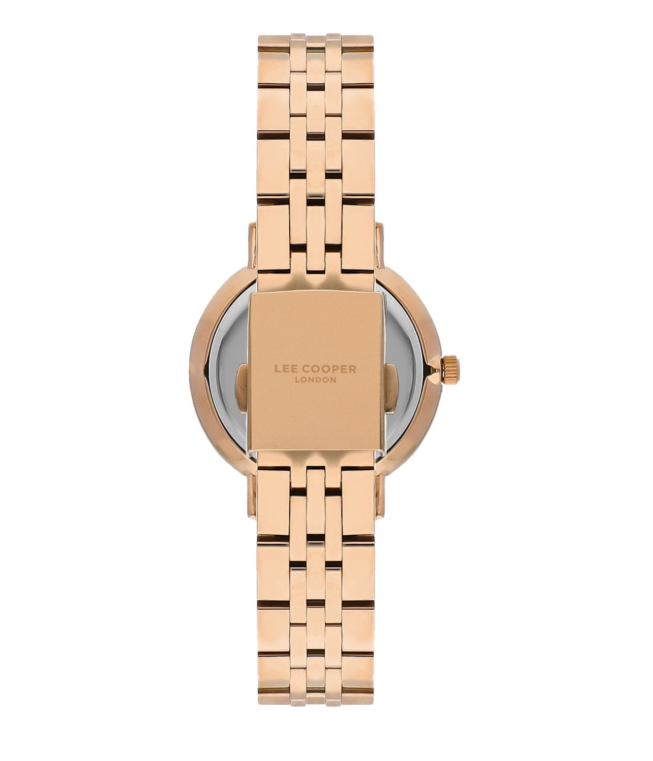 Женские часы Lee Cooper LC07857.420 — это стильное сочетание элегантности и современного дизайна. Изящный круглый корпус диаметром 34 мм выполнен из суперметалла с IP-покрытиемIP-покрытиеМетод ионного напыления. Демонстрирует повышенную устойчивость к истиранию, окислению и химическим веществам. Под воздействием высокого давления и температуры около 1500°C молекулы металла надёжно соединяются с частицами корпуса часов. золотого цвета, что придает модели особый блеск. Розовый циферблат защищен минеральным стекломМинеральное стеклоМинеральное стекло представляет собой искусственно выращенный минерал кварца. Такое стекло отличается особой устойчивостью к повреждениям и царапинам. Уступает по некоторым качествам сапфировому стеклу., обеспечивающим устойчивость к царапинам. Метки в виде штрихов. Часы оснащены надежным кварцевым механизмом, а стальной браслет с IP-покрытиемIP-покрытиеМетод ионного напыления. Демонстрирует повышенную устойчивость к истиранию, окислению и химическим веществам. Под воздействием высокого давления и температуры около 1500°C молекулы металла надёжно соединяются с частицами корпуса часов. золотого цвета на раскладной застёжкеРаскладная застёжкаТакой тип застёжки используется только на браслетах из металла. Она никогда не раскрывается полностью, происходит разделение на 2 и более частей. Раскладывающая застёжка снизит вероятность потери часов к минимуму. гарантирует комфортную посадку на запястье. Водозащита 30 метров защищает модель от случайных брызг и дождя. В комплекте к часам идет дополнительный браслет в цвет часов. Lee Cooper — отличный выбор для тех, кто ценит утонченность и качество.