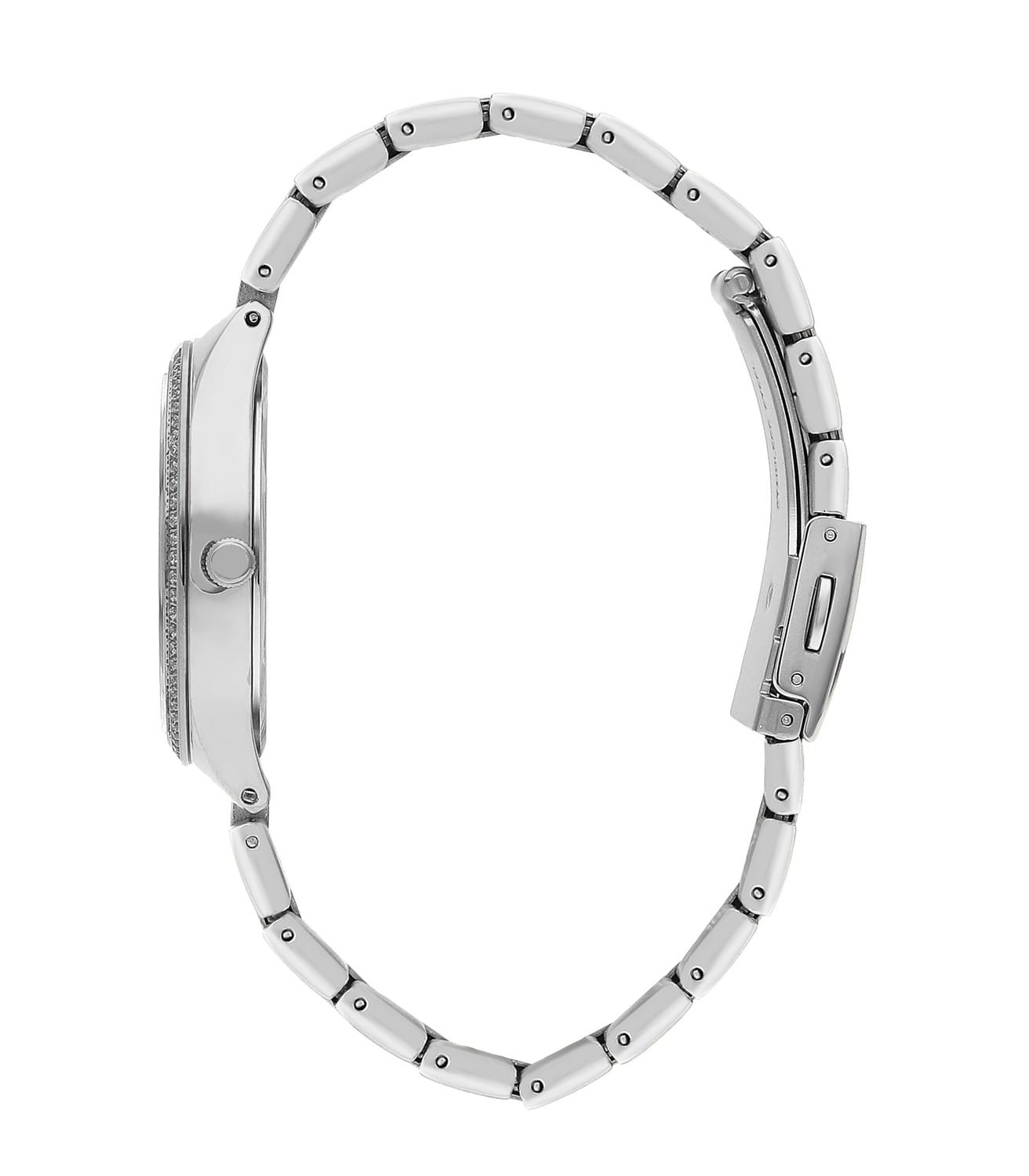 Женские часы Lee Cooper LC07863.390 — это стильное сочетание элегантности и современного дизайна. Круглый корпус диаметром 34 мм выполнен из суперметалла, а неподвижный безельБезельВнешний ободок, закрепляющий стекло. В спортивных часах так называется поворотное кольцо с делениями на циферблате, выполняет роль таймера – замеряет отрезки времени на шкале. Неподвижный безель – элемент декора. Однонаправленно вращающийся безель на дайверских часах позволяет фиксировать моменты погружения и выныривания на поверхность. украшен цирконами, придающими модели особый блеск. Серебристый циферблат защищен минеральным стекломМинеральное стеклоМинеральное стекло представляет собой искусственно выращенный минерал кварца. Такое стекло отличается особой устойчивостью к повреждениям и царапинам. Уступает по некоторым качествам сапфировому стеклу., обеспечивающим устойчивость к царапинам. Метки в виде штрихов. Часы оснащены надежным кварцевым механизмом, а металлический браслет на раскладной застёжкеРаскладная застёжкаТакой тип застёжки используется только на браслетах из металла. Она никогда не раскрывается полностью, происходит разделение на 2 и более частей. Раскладывающая застёжка снизит вероятность потери часов к минимуму. гарантирует комфортную посадку на запястье. Мультифункциональная модель с индикацией даты, дня недели, с дополнительным 24-х часовым индикатором. Водозащита 30 метров защищает модель от случайных брызг и дождя. Lee Cooper  — отличный выбор для тех, кто ценит утонченность и качество.