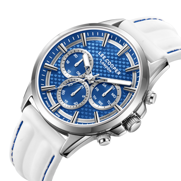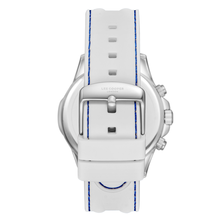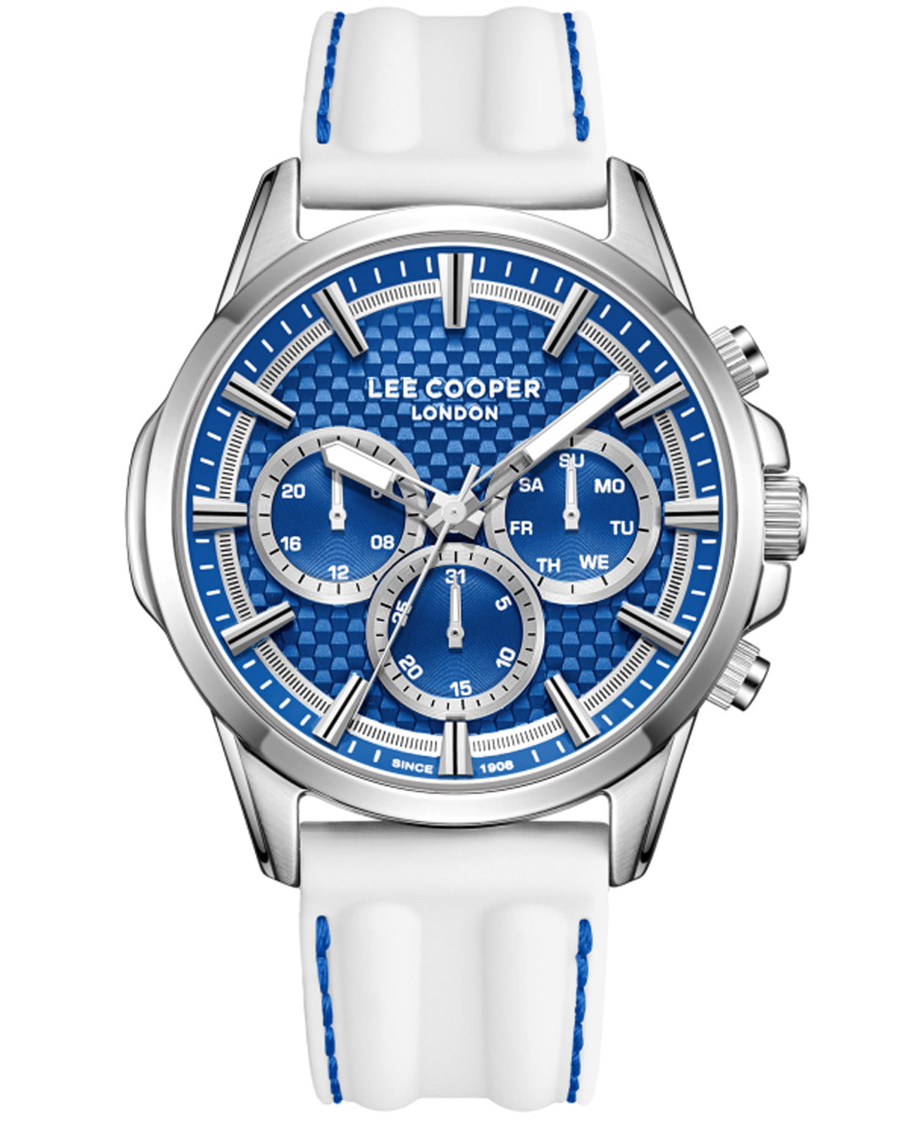 Мужские наручные часы Lee Cooper  LC08048.393 — это стильная модель из коллекции Contemporary, сочетающая в себе современный дизайн и функциональность. Часы оснащены кварцевым механизмом японского производства, который обеспечивает высокую точность хода и минимальное энергопотребление. Корпус часов изготовлен из высококачественного суперметалла серебристого цвета, что делает их устойчивыми к внешним воздействиям и придает благородный вид. Синий циферблат украшен стрелками и индексами серебристого цвета, гармонично дополняющими общий дизайн модели. Для защиты циферблата используется минеральное стеклоМинеральное стеклоМинеральное стекло представляет собой искусственно выращенный минерал кварца. Такое стекло отличается особой устойчивостью к повреждениям и царапинам. Уступает по некоторым качествам сапфировому стеклу.,  устойчивое к царапинам и механическим повреждениям. Корпус имеет круглую форму с диаметром 44 мм, что делает часы заметными и подходящими для повседневной носки. Ремешок изготовлен из силикона белого цвета, создавая современный и спортивный образ. Застежка классическая. Модель обладает водонепроницаемостью до 50 метров (5 АТМ), что позволяет использовать часы в повседневной жизни, включая контакт с водой при мытье рук или дожде. Эти часы станут идеальным выбором для мужчин, ценящих стиль, качество и функциональность.