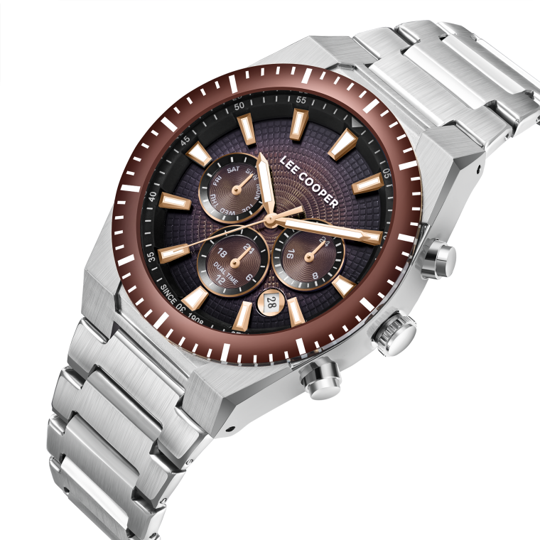 Мужские наручные часы Lee Cooper LC08100.340 — элегантная модель с функциональными возможностями для повседневного использования. Круглый корпус из суперметалла стали придаёт часам классический и современный вид. Коричневый циферблат оснащён дополнительными индикаторами и функцией хронографаХронографФункция позволяет измерять отрезки времени с особой точностью: часы, минуты, секунды. Верным признаком хронографа является наличие на циферблате 3 дополнительных окошек-счётчиков., что позволяет измерять временные интервалы с высокой точностью. Стрелки и метки покрыты люминесцентным покрытиемЛюминесцентное покрытиеПозволяет считывать показания времени в темноте. Производители наносят на стрелки, часовые индексы, безель или поверхность циферблата светонакопительный состав, дающий холодное свечение., обеспечивая удобное считывание показаний в условиях недостаточного освещения. Циферблат защищён минеральным стекломМинеральное стеклоМинеральное стекло представляет собой искусственно выращенный минерал кварца. Такое стекло отличается особой устойчивостью к повреждениям и царапинам. Уступает по некоторым качествам сапфировому стеклу., устойчивым к царапинам. Часы работают на кварцевом механизме, обеспечивающем точность хода. Браслет из нержавеющей стали с раскладной застёжкойРаскладная застёжкаТакой тип застёжки используется только на браслетах из металла. Она никогда не раскрывается полностью, происходит разделение на 2 и более частей. Раскладывающая застёжка снизит вероятность потери часов к минимуму. гарантирует удобную посадку и надёжную фиксацию на запястье. Водозащита 50 метров защищает часы от брызг и дождя, делая их подходящими для повседневного использования.