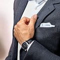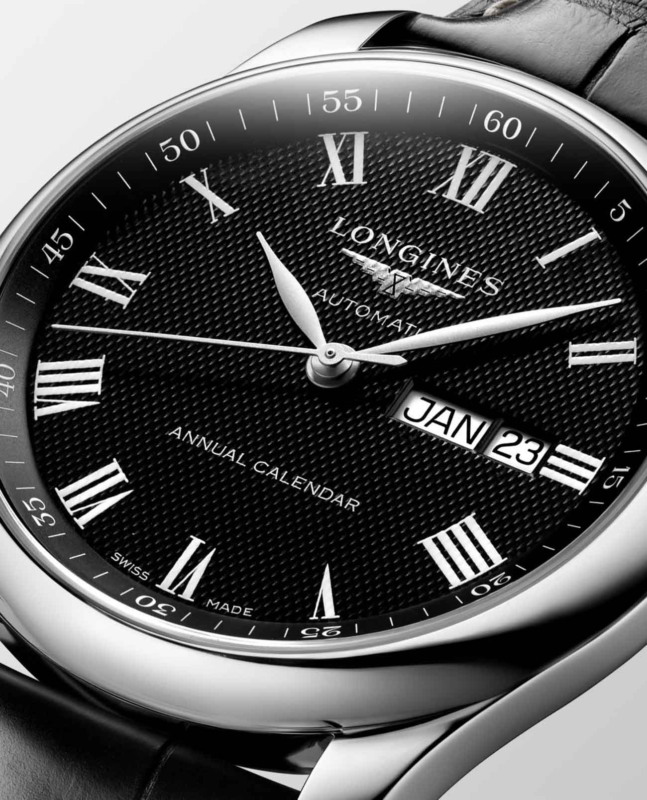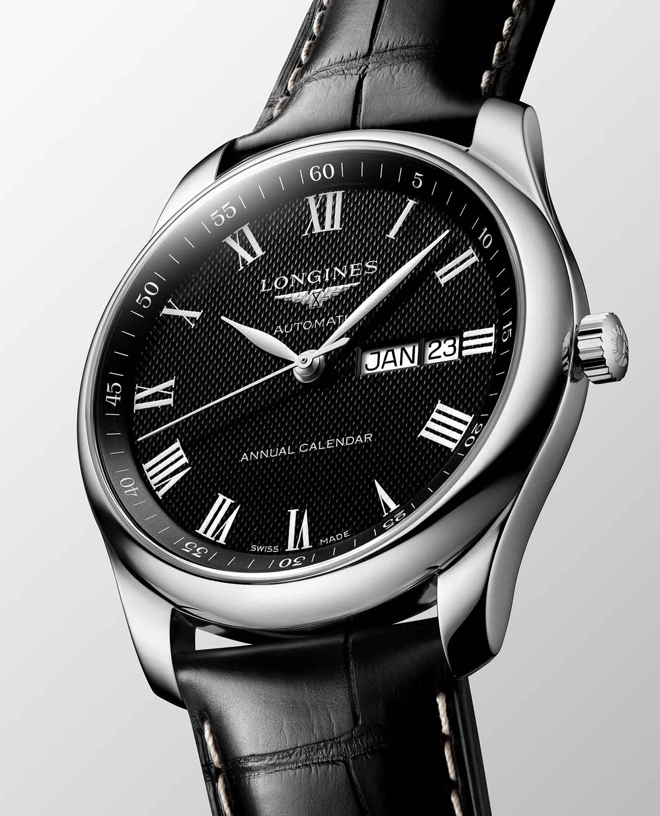 Римские цифры в сочетании с кожаным ремешком отражают элегантность. Внутри стального корпуса заключён швейцарский автоматический механизм L897, отличающийся 64-часовым запасом хода. Скелетонизированная задняя крышка с сапфировым стеклом позволяет отслеживать движение деталей и любоваться их отделкой. Годовой календарь включает указатели даты и дня недели.