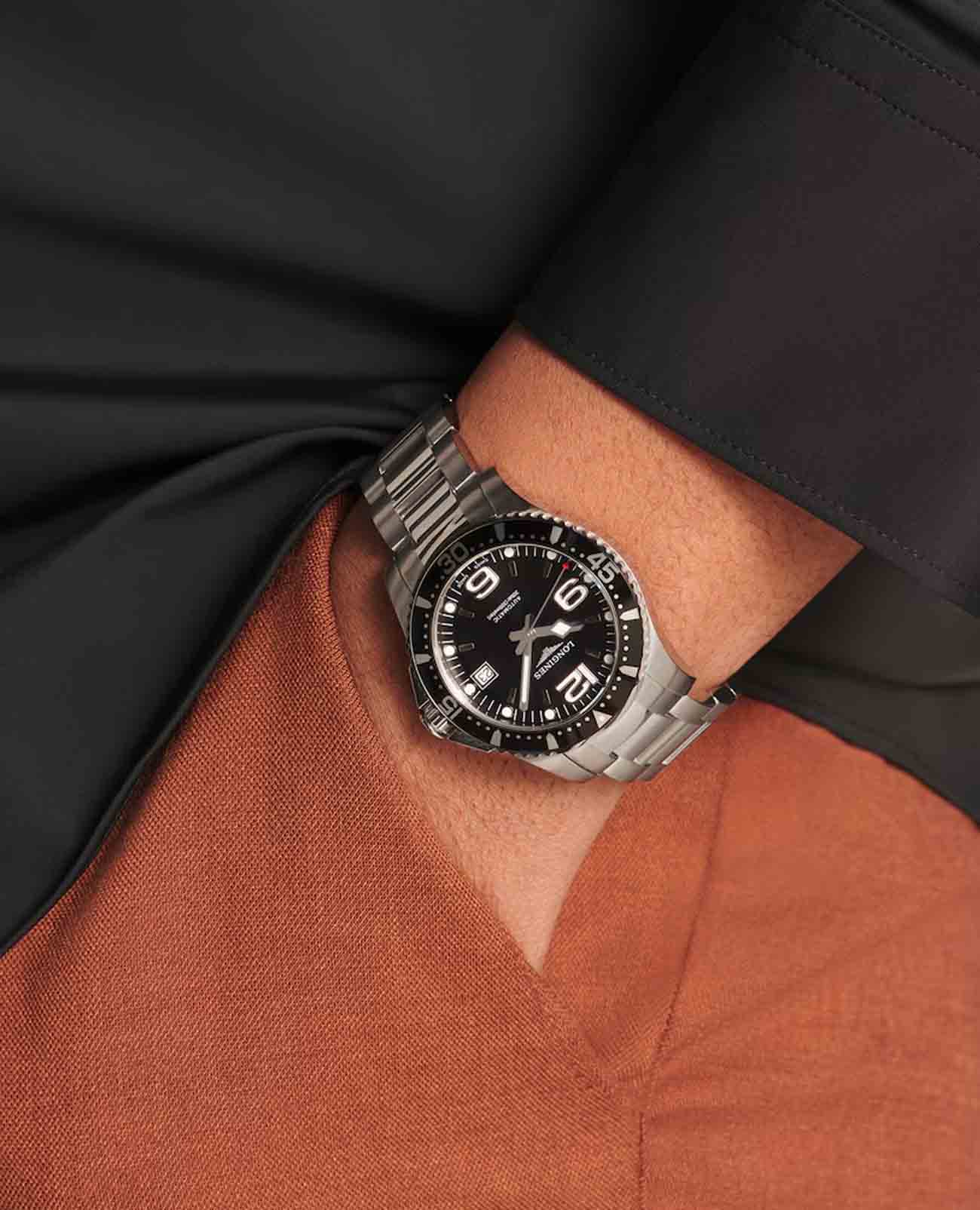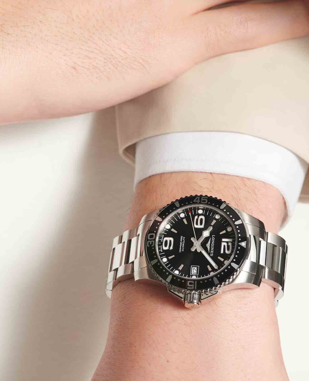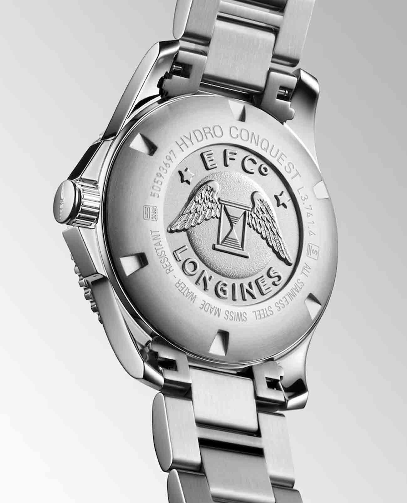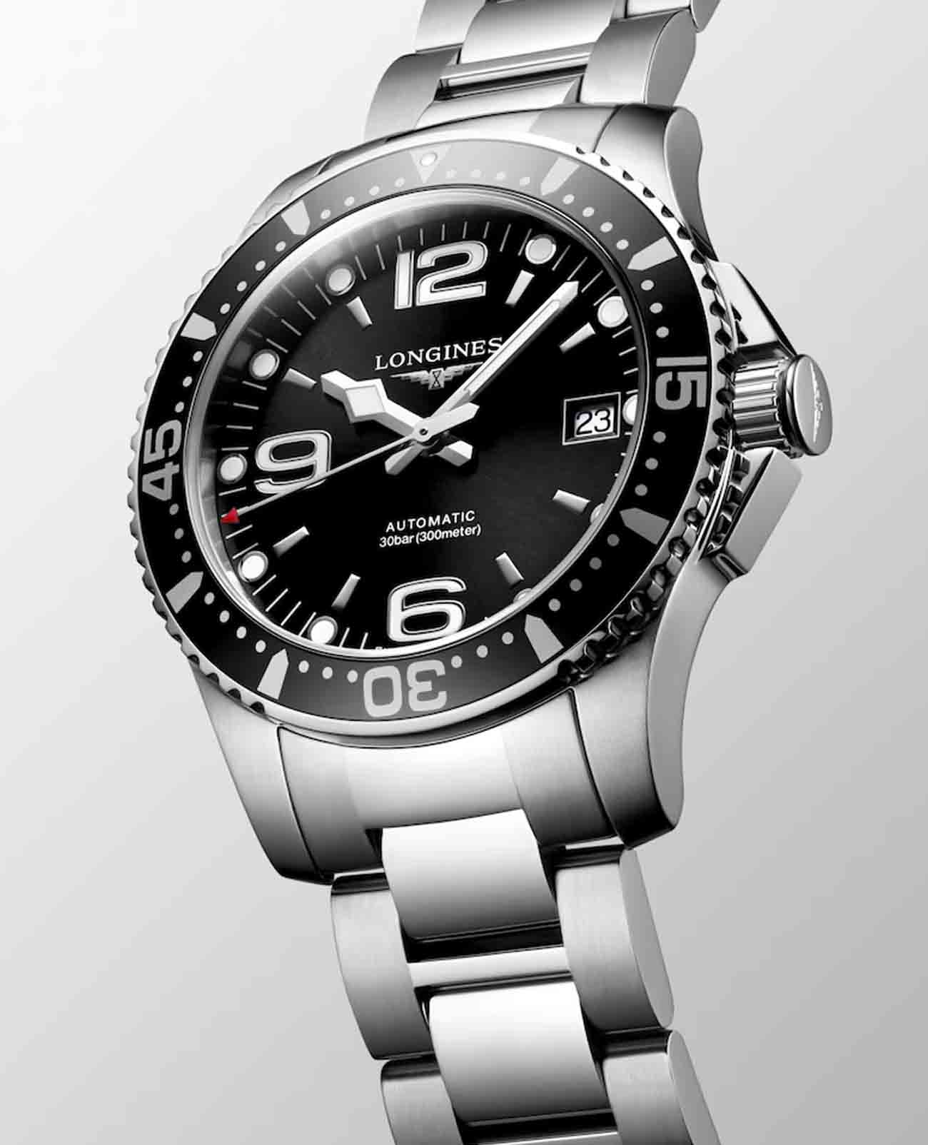 Мужские механические швейцарские часы с автоподзаводом Longines HydroConquest L3.781.3.96.7. Сапфировое стеклоСапфировое стеклоПрочный и надёжный материал из кристалла сапфира синтетического происхождения, характеризующийся особой твёрдостью и устойчивостью к царапинам и повреждениям. с антибликовым покрытием, устойчивое к мелким механическим повреждениям. Корпус часов изготовлен из нержавеющей стали. Вращающийся стальной безельБезельВнешний ободок, закрепляющий стекло. В спортивных часах так называется поворотное кольцо с делениями на циферблате, выполняет роль таймера – замеряет отрезки времени на шкале. Неподвижный безель – элемент декора. Однонаправленно вращающийся безель на дайверских часах позволяет фиксировать моменты погружения и выныривания на поверхность. с люминесцентным покрытиемЛюминесцентное покрытиеПозволяет считывать показания времени в темноте. Производители наносят на стрелки, часовые индексы, безель или поверхность циферблата светонакопительный состав, дающий холодное свечение. Superluminova из нержавеющей стали и керамики, защищенный от царапин, никогда не изнашивается и не выцветает. Стрелки и метки с люминесцентным покрытиемЛюминесцентное покрытиеПозволяет считывать показания времени в темноте. Производители наносят на стрелки, часовые индексы, безель или поверхность циферблата светонакопительный состав, дающий холодное свечение.. Окошко даты находится в положении 3 часа. Класс водозащиты: 300 метров, позволит плавать, нырять и заниматься другими водными видами спорта. Стальной браслет на раскладной застёжкеРаскладная застёжкаТакой тип застёжки используется только на браслетах из металла. Она никогда не раскрывается полностью, происходит разделение на 2 и более частей. Раскладывающая застёжка снизит вероятность потери часов к минимуму. с удлинением для дайверов.