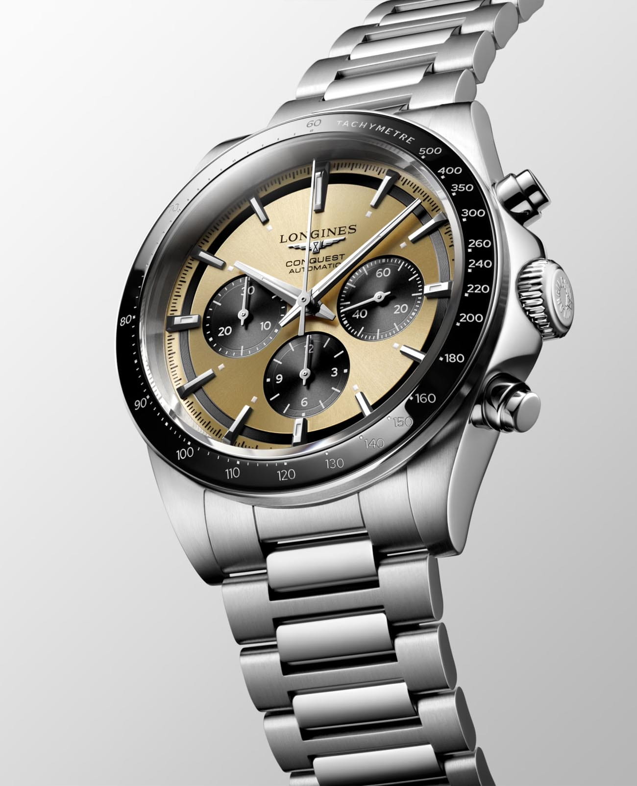 Мужские швейцарские механические часы- хронографХронографФункция позволяет измерять отрезки времени с особой точностью: часы, минуты, секунды. Верным признаком хронографа является наличие на циферблате 3 дополнительных окошек-счётчиков. Longines Conquest L3.835.4.32.6. Сапфировое стеклоСапфировое стеклоПрочный и надёжный материал из кристалла сапфира синтетического происхождения, характеризующийся особой твёрдостью и устойчивостью к царапинам и повреждениям. с многослойным антибликовым покрытием с обеих сторон, устойчивое к появлению царапин, обладающее высокой прозрачностью. Корпус часов изготовлен из стали. Неподвижный безельБезельВнешний ободок, закрепляющий стекло. В спортивных часах так называется поворотное кольцо с делениями на циферблате, выполняет роль таймера – замеряет отрезки времени на шкале. Неподвижный безель – элемент декора. Однонаправленно вращающийся безель на дайверских часах позволяет фиксировать моменты погружения и выныривания на поверхность. из стали и керамики, защищенный от царапин, никогда не изнашивается и не выцветает. Шкала тахиметраТахиметрРазмеченная шкала, располагается на ободке или безеле часов. Тахиметр позволяет рассчитать скорость на определённом участке пути, расстояние измеряется в километрах или милях.. На циферблате расположены три дополнительных циферблата. Стрелки и метки с люминесцентным покрытиемЛюминесцентное покрытиеПозволяет считывать показания времени в темноте. Производители наносят на стрелки, часовые индексы, безель или поверхность циферблата светонакопительный состав, дающий холодное свечение.. Класс водозащиты: 100 метров, позволит плавать, нырять и заниматься другими водными видами спорта. Стальной браслет на раскладной застёжкеРаскладная застёжкаТакой тип застёжки используется только на браслетах из металла. Она никогда не раскрывается полностью, происходит разделение на 2 и более частей. Раскладывающая застёжка снизит вероятность потери часов к минимуму..
