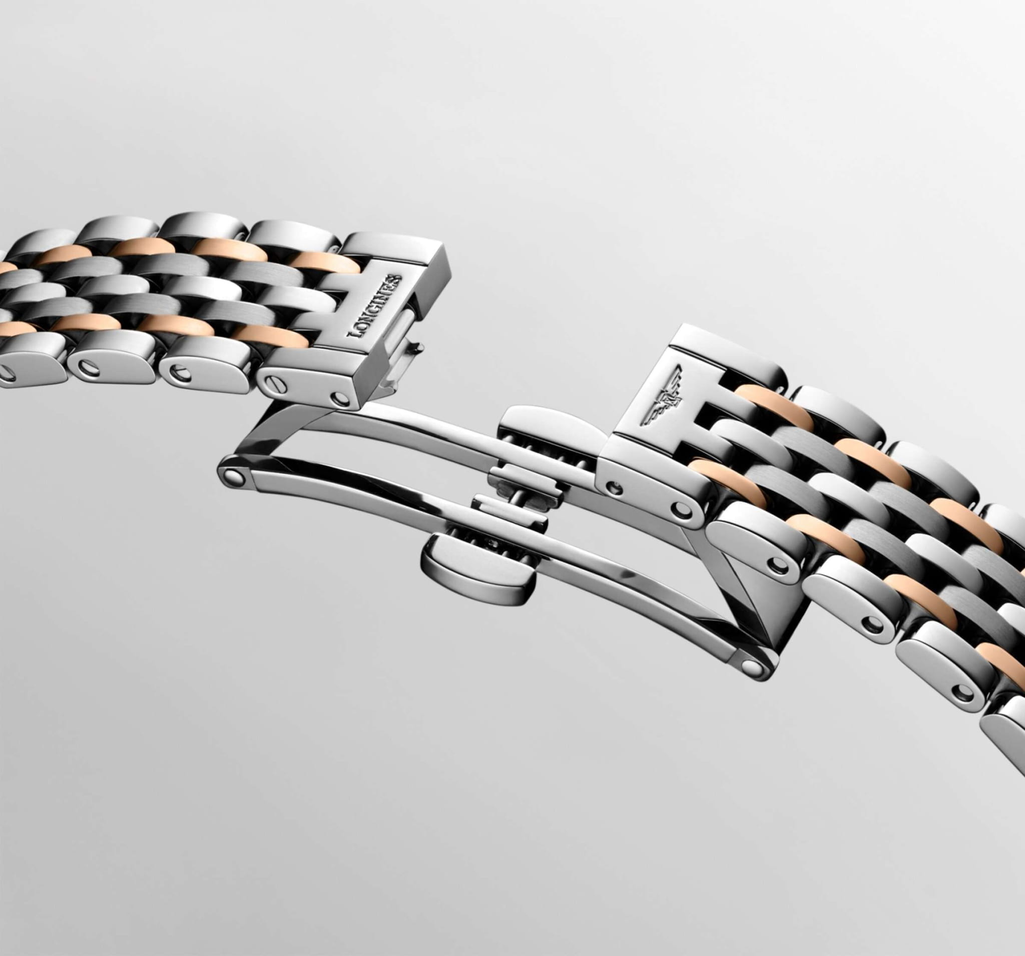Изысканные женские часы Longines Elegant Collection L4.310.5.79.7 — это воплощение спокойной роскоши и вечного стиля. Все элементы циферблата подчеркивают элегантность и классический вкус модели. Корпус часов изготовлен из нержавеющей стали, диаметром 29 мм. Защиту циферблата обеспечивает прочное сапфировое стеклоСапфировое стеклоПрочный и надёжный материал из кристалла сапфира синтетического происхождения, характеризующийся особой твёрдостью и устойчивостью к царапинам и повреждениям. с антибликовым покрытиемАнтибликовое покрытиеСлой оксида металла в 0,13-0,3 микрон, благодаря которому стекло часов не бликует и не отражает свет. Антибликовое покрытие уменьшает отражение света в 10 раз, обеспечивая отличную читаемость показателей циферблата. гарантирующее четкость показаний. Циферблат украшен 13 бриллиантами Top Wesselton VS-SI общим весом 0,029 карата. Неподвижный безельБезельВнешний ободок, закрепляющий стекло. В спортивных часах так называется поворотное кольцо с делениями на циферблате, выполняет роль таймера – замеряет отрезки времени на шкале. Неподвижный безель – элемент декора. Однонаправленно вращающийся безель на дайверских часах позволяет фиксировать моменты погружения и выныривания на поверхность. из 18-каратного золота18-каратное золотоОбозначение по каратной системе пробирования, оно показывает, сколько драгоценного металла содержится в изделии. 18 карат - в составе 75% чистого золота, соответствует 750 пробе.