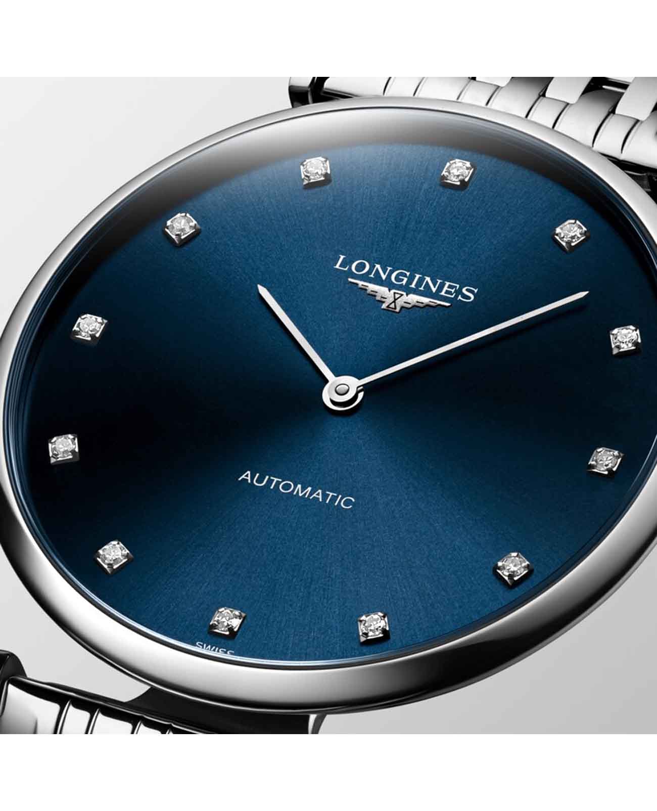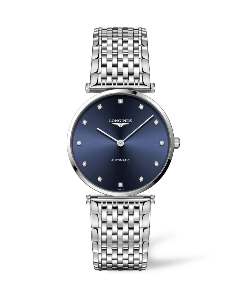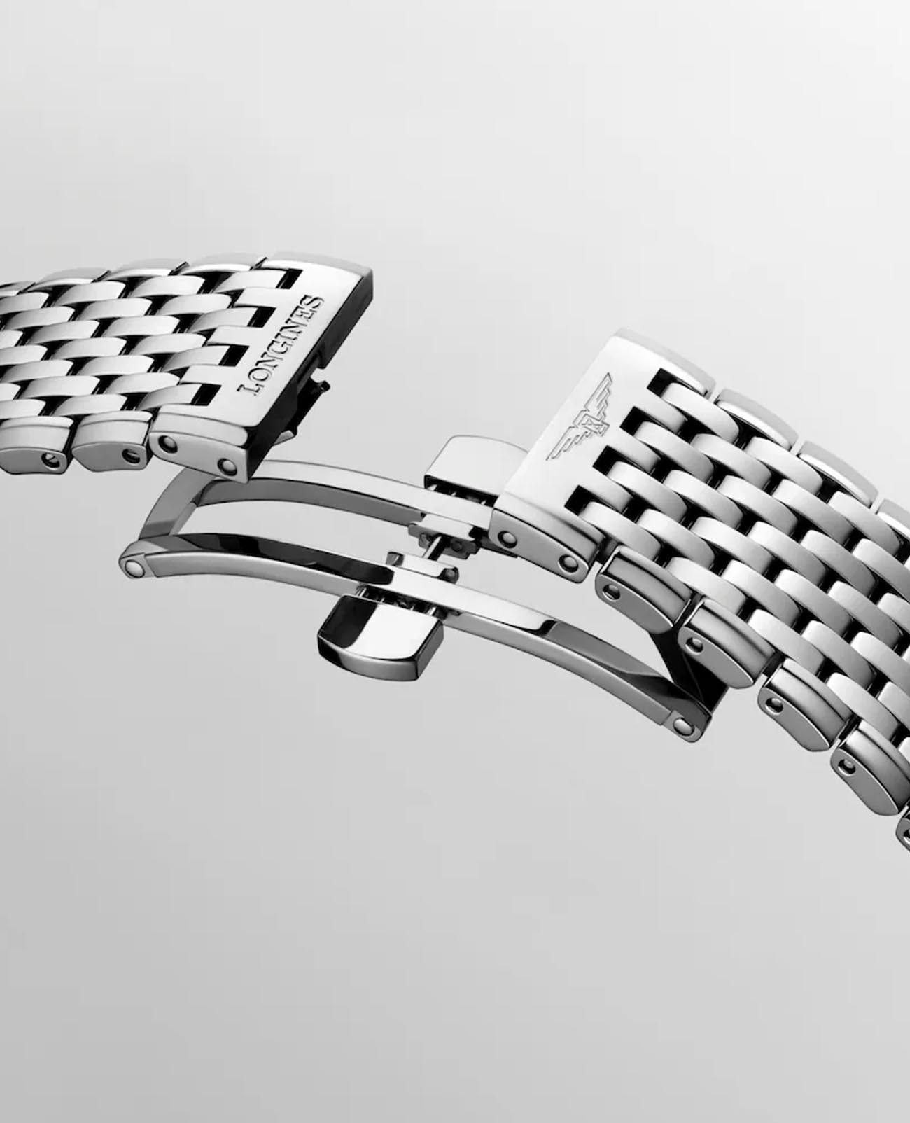 Женские швейцарские часы Longines La Grande Classique L4.908.4.97.6, кварцевый механизм с высокой точностью. Сапфировое стеклоСапфировое стеклоПрочный и надёжный материал из кристалла сапфира синтетического происхождения, характеризующийся особой твёрдостью и устойчивостью к царапинам и повреждениям. устойчивое к появлению царапин, обладающее высокой прозрачностью. Корпус часов изготовлен из стали. Циферблат с 12 бриллиантами группы Top Wesselton VS-SI общим весом 0.081 карата. Класс водозащиты: 30 метров, позволит защитить корпус от случайных брызг или капель дождя. Стальной браслет на застёжке-бабочке с кнопкамиЗастёжка "бабочка"Такой вид застёжки дополняется предохранителями, помогающими избежать случайного раскрытия браслета. Обладают изящным исполнением. .